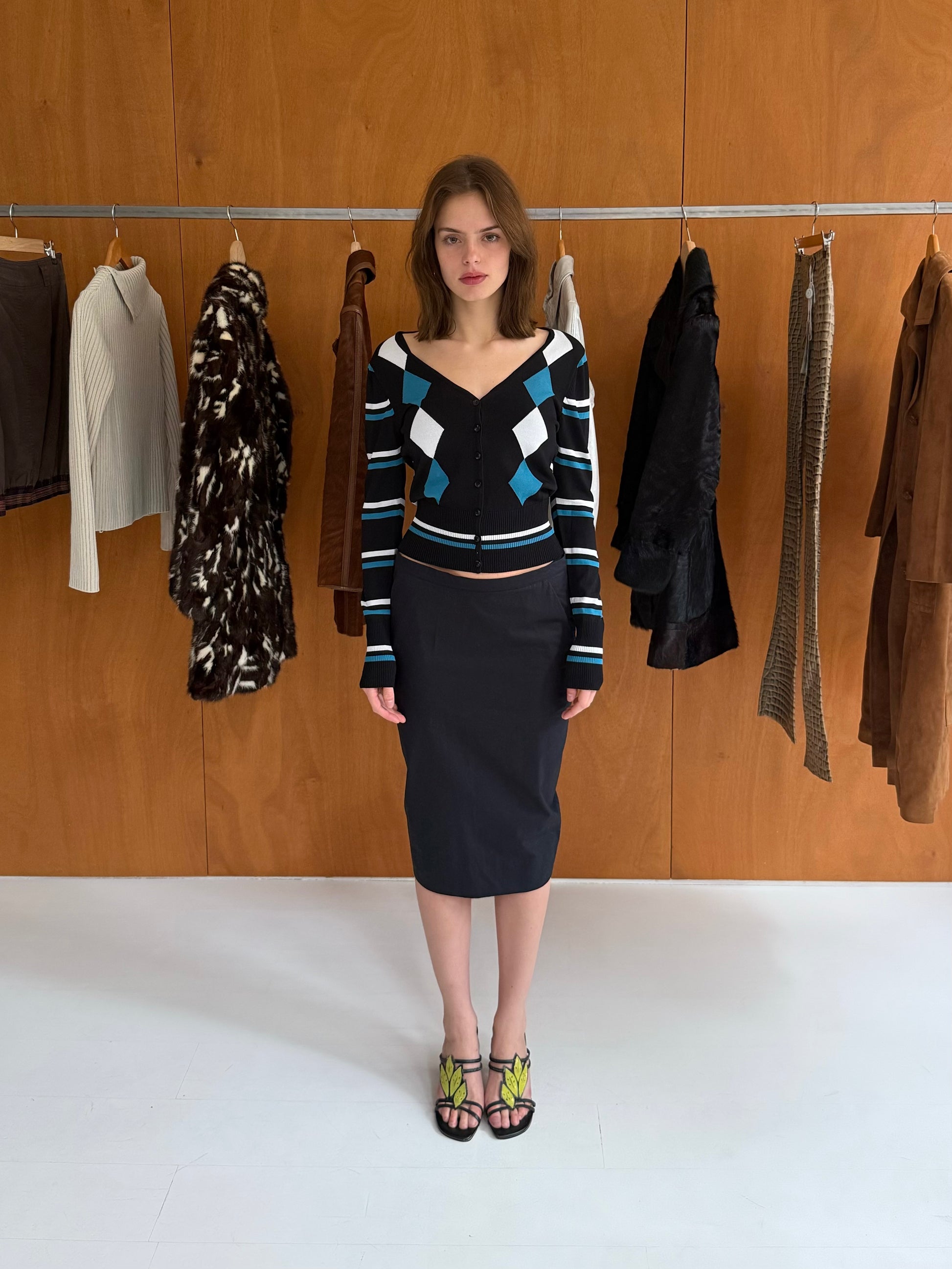 Argyle print cardigan in black, blue & white. Fits sizes XS-M.