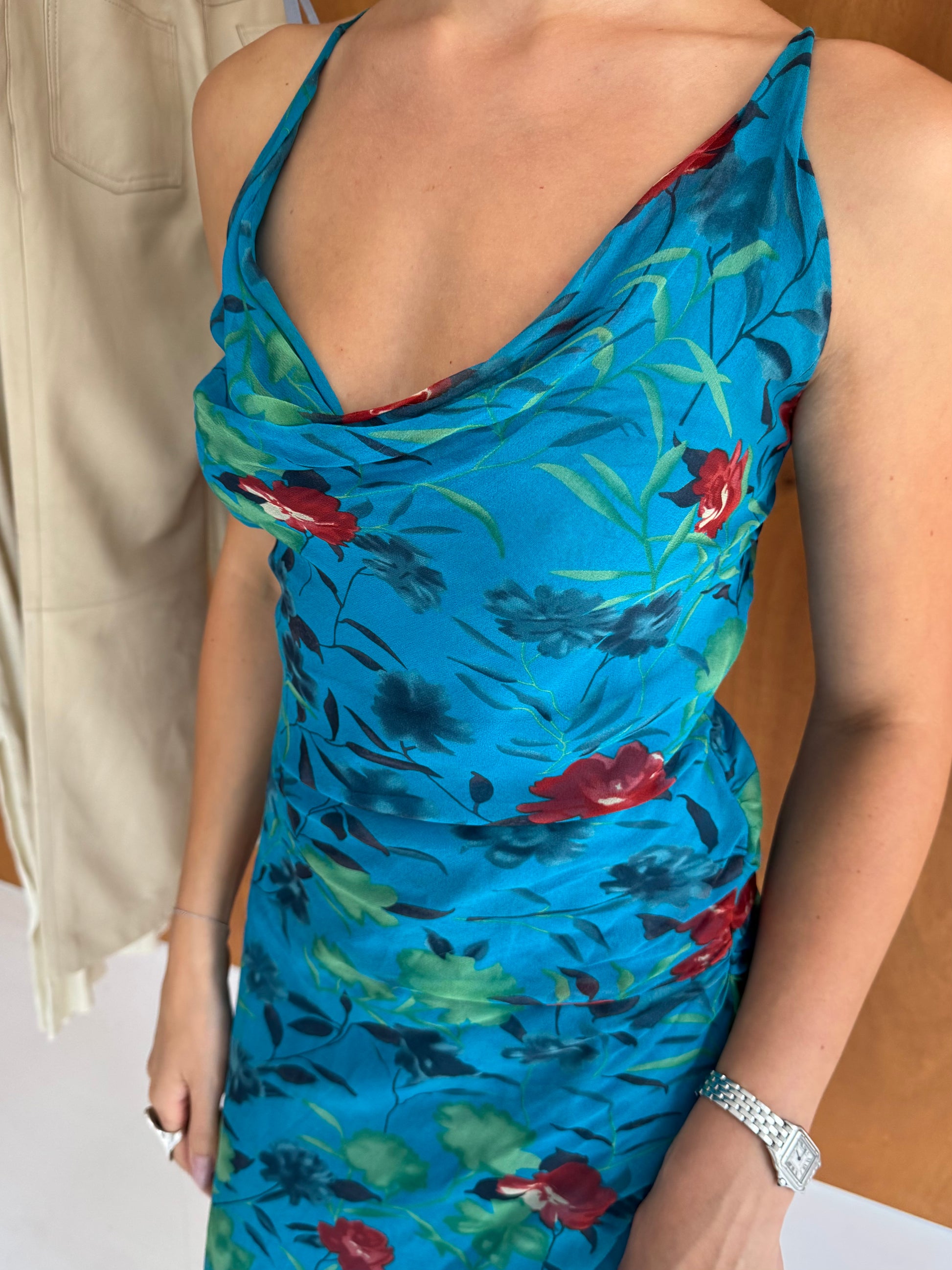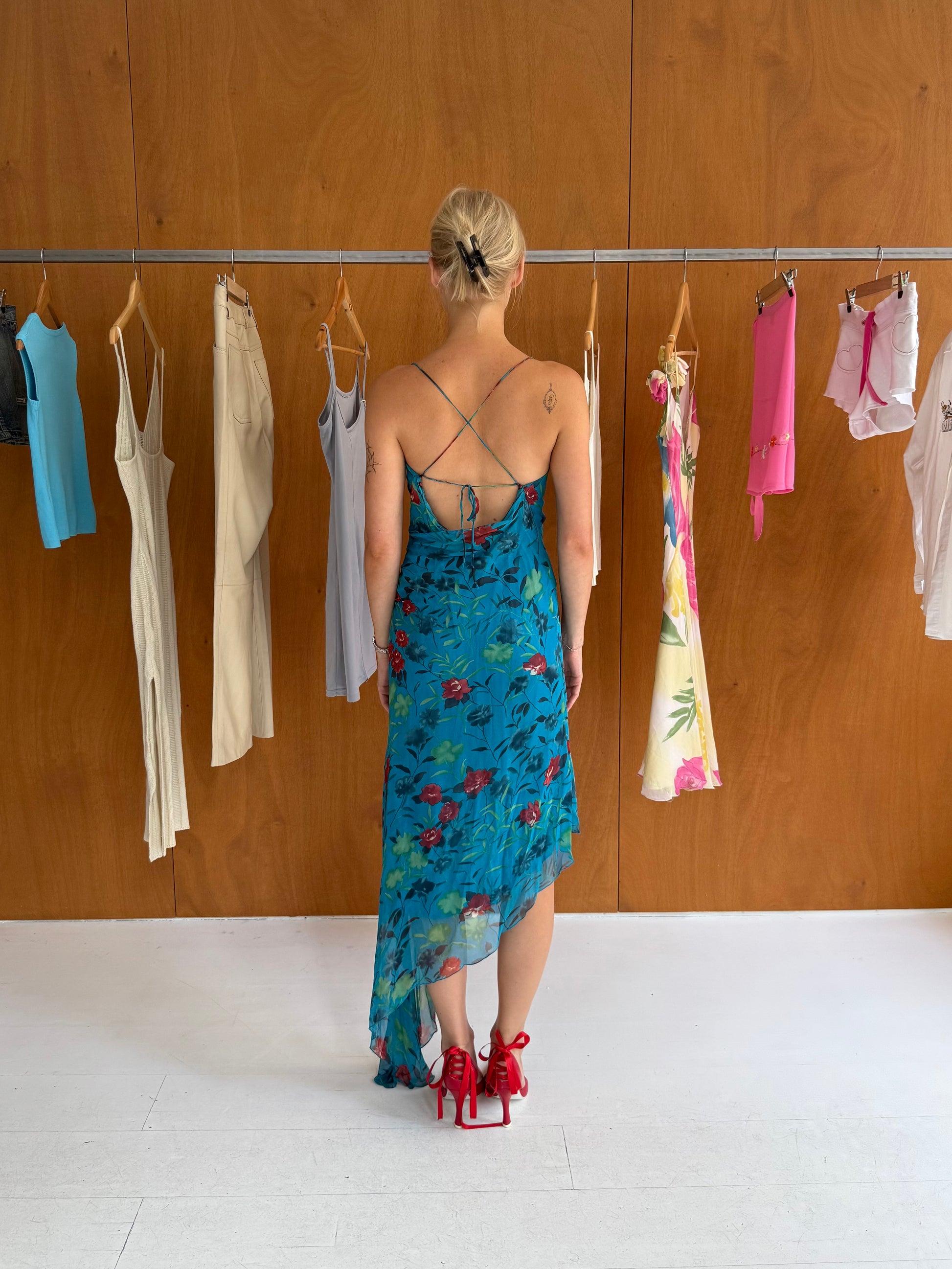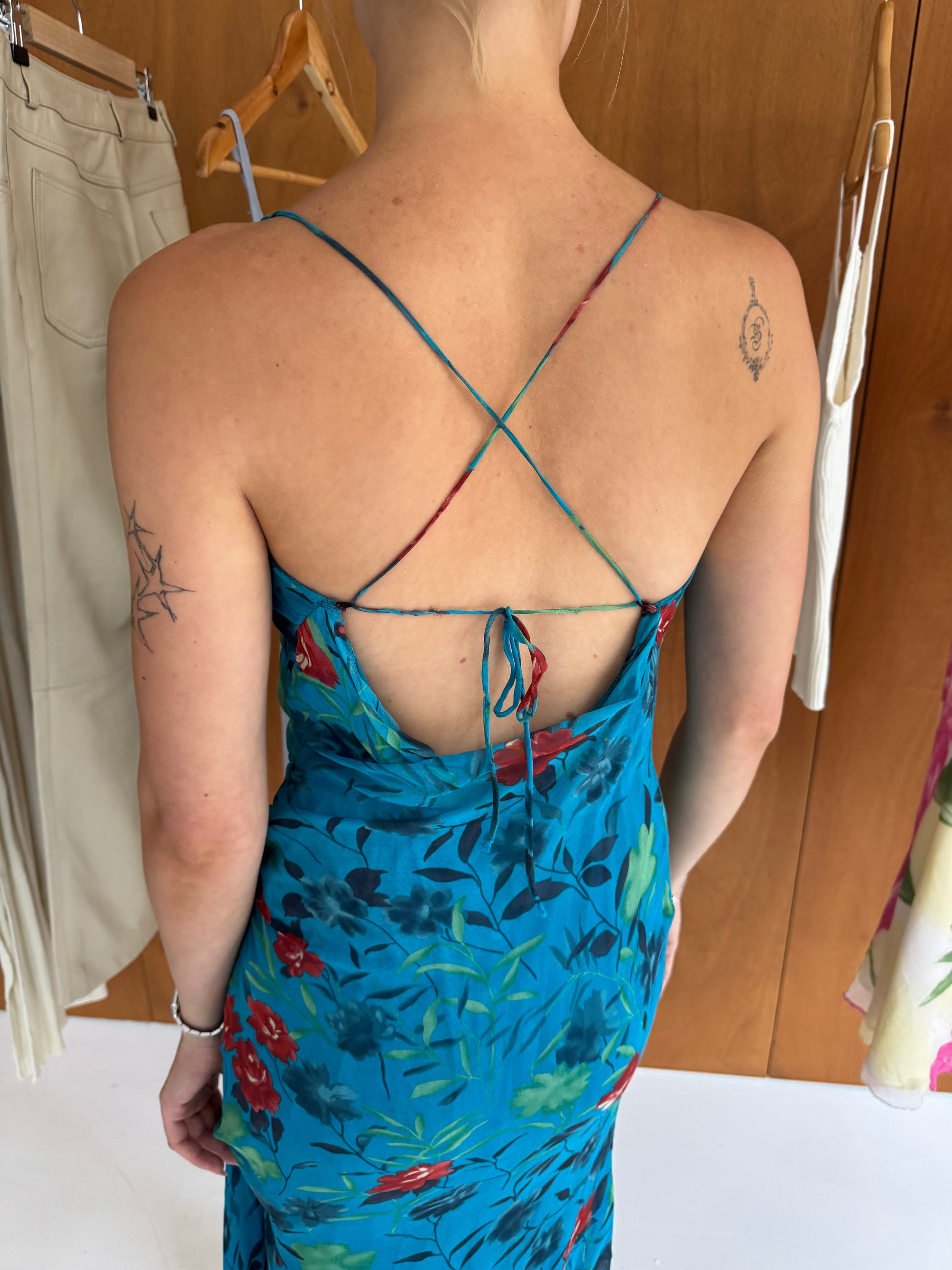 Backless floral dress in blue. Fits sizes XS-S.