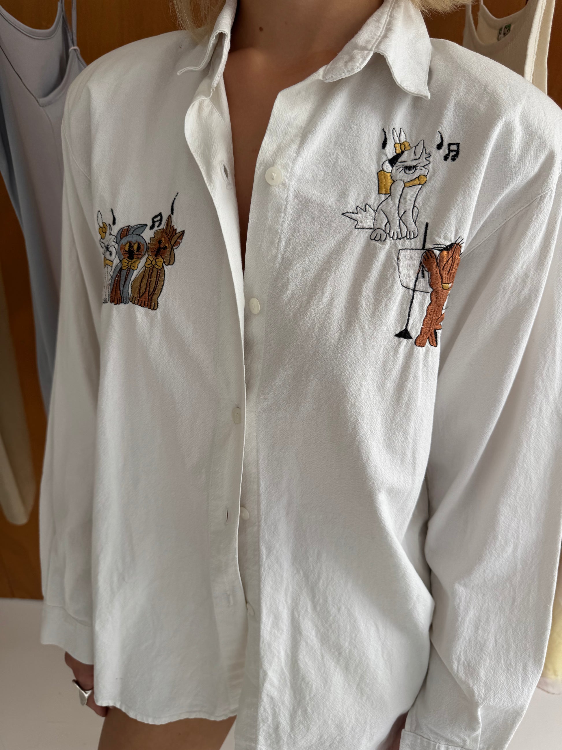 Shirt with cat embroidery in white. Fits sizes XS-M.