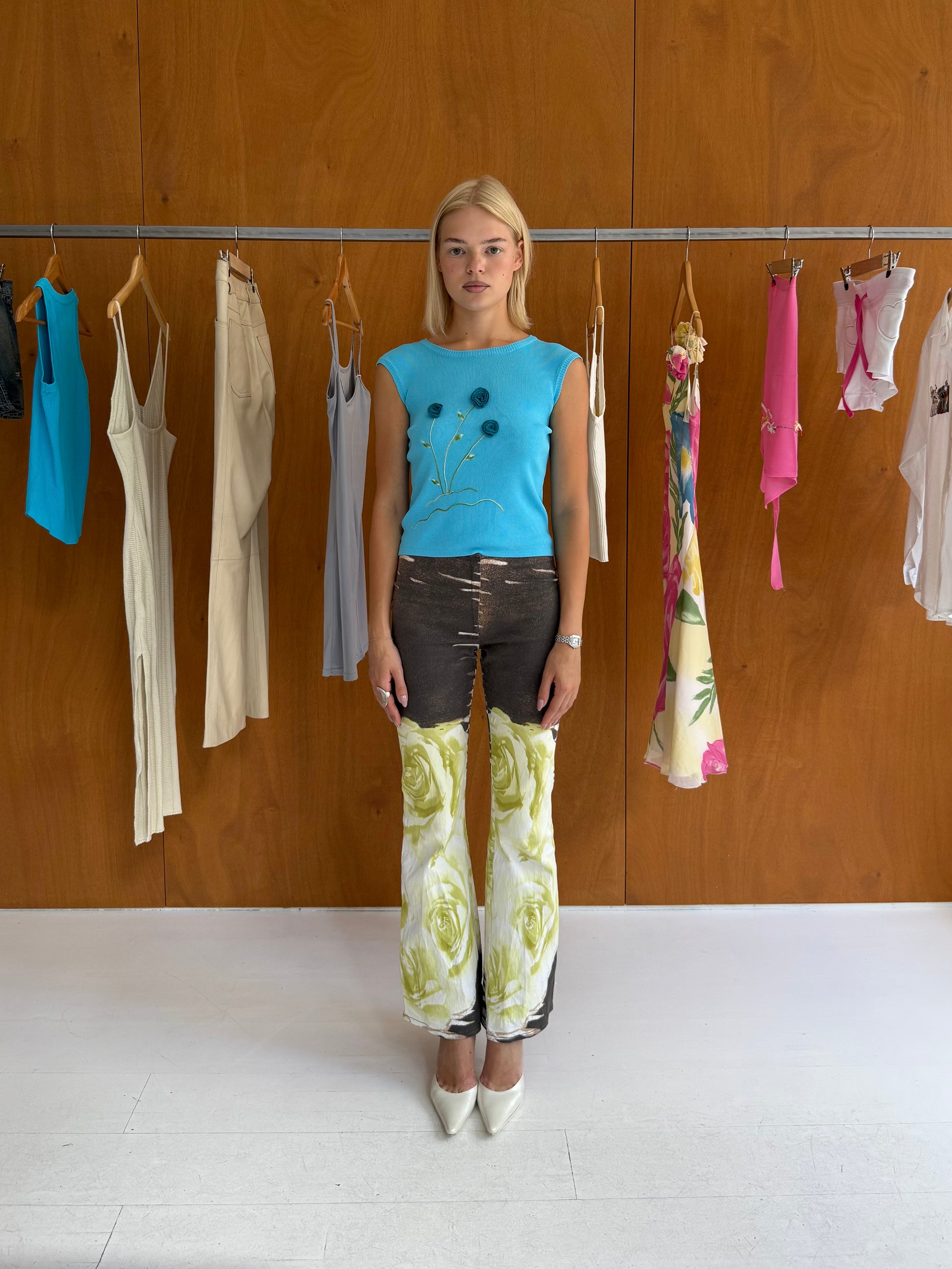 Roberto Cavalli print pants in green, white, and brown. Fits sizes XS-S.