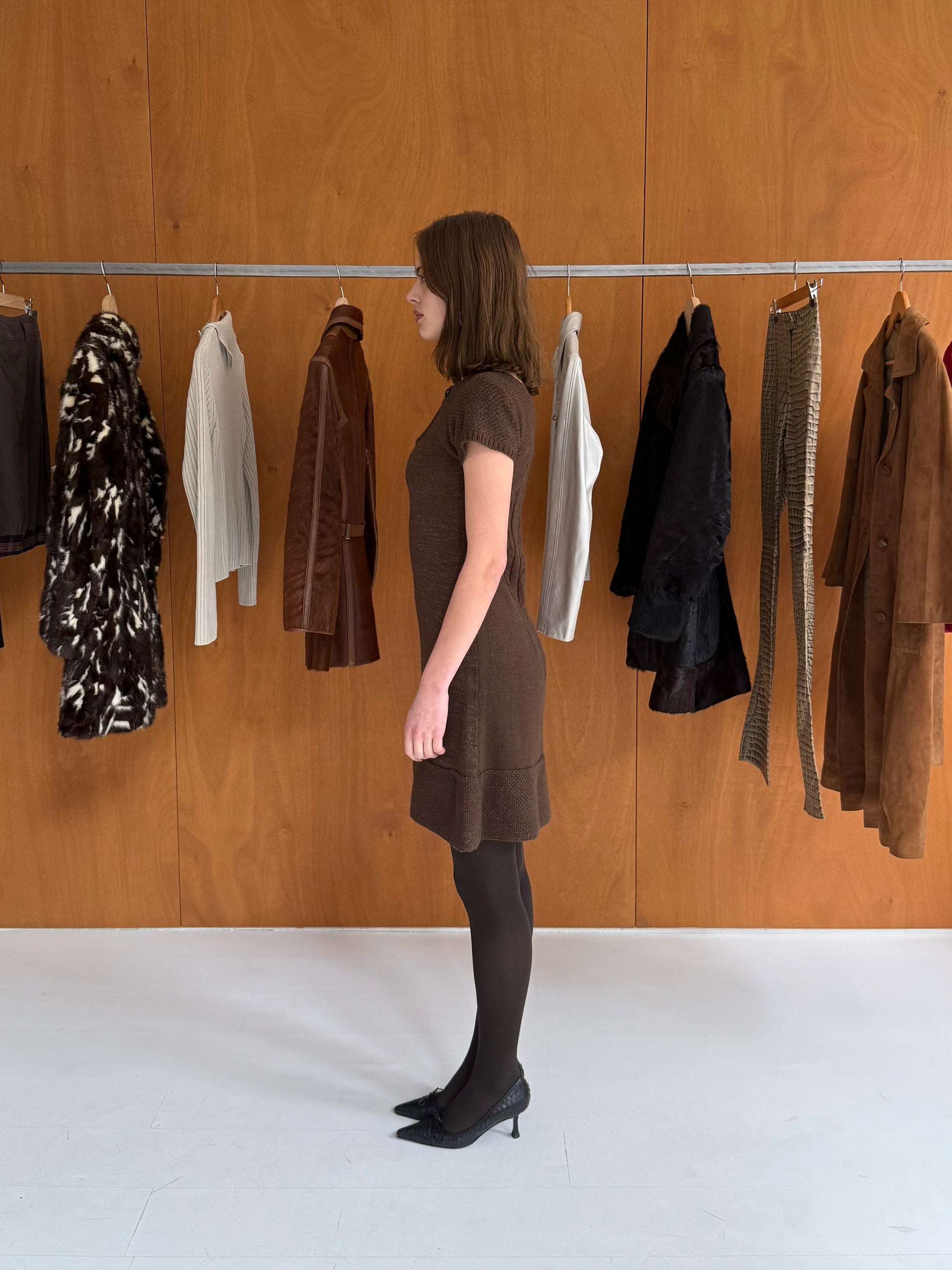 Dress with cut-out in brown. Wearable both ways front & back. Fits sizes S-M.