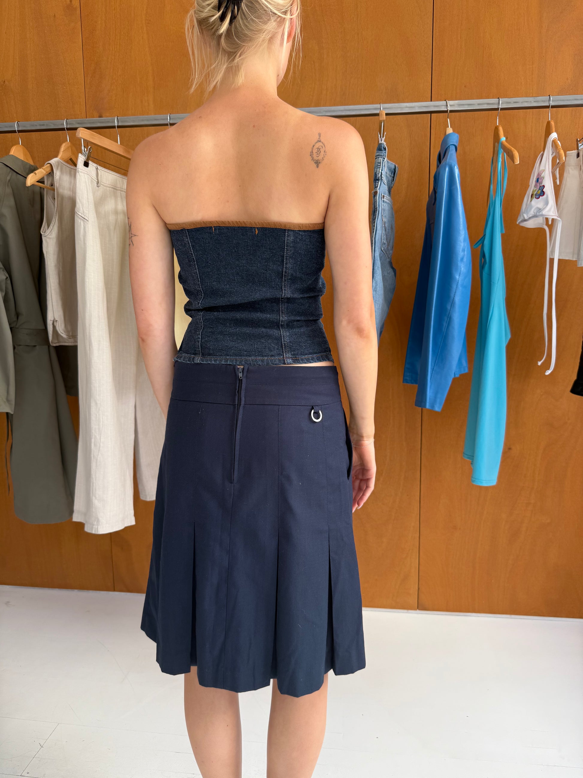 Pleated midi skirt in navy. Fits sizes XS-S. Waist 36cm length 54cm.