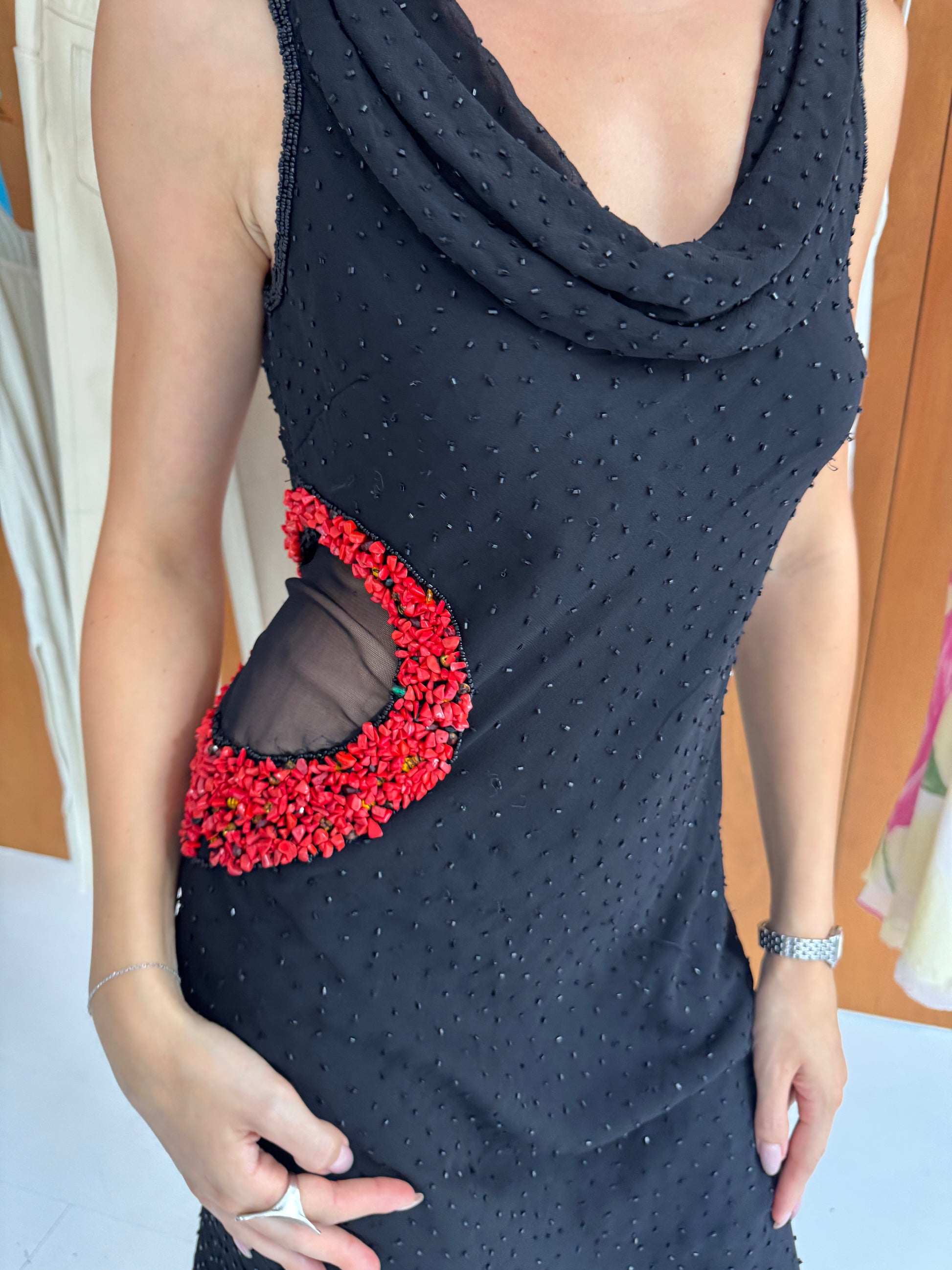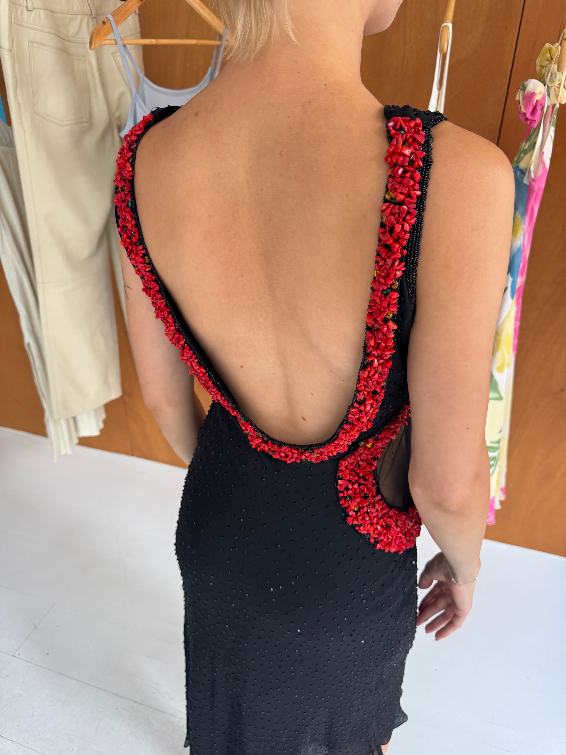 Midi dress with embellishments in black and red. Fits sizes S-M