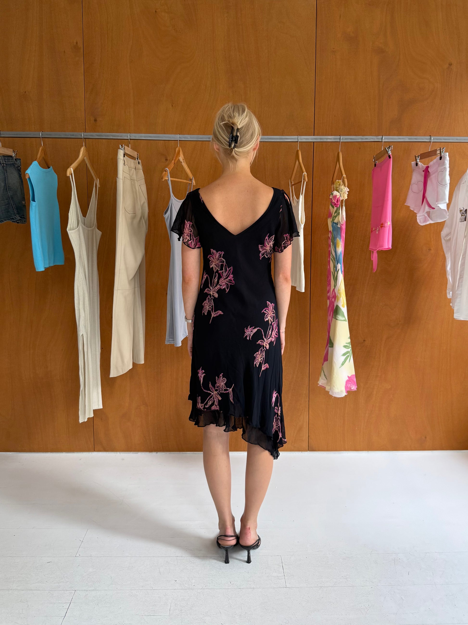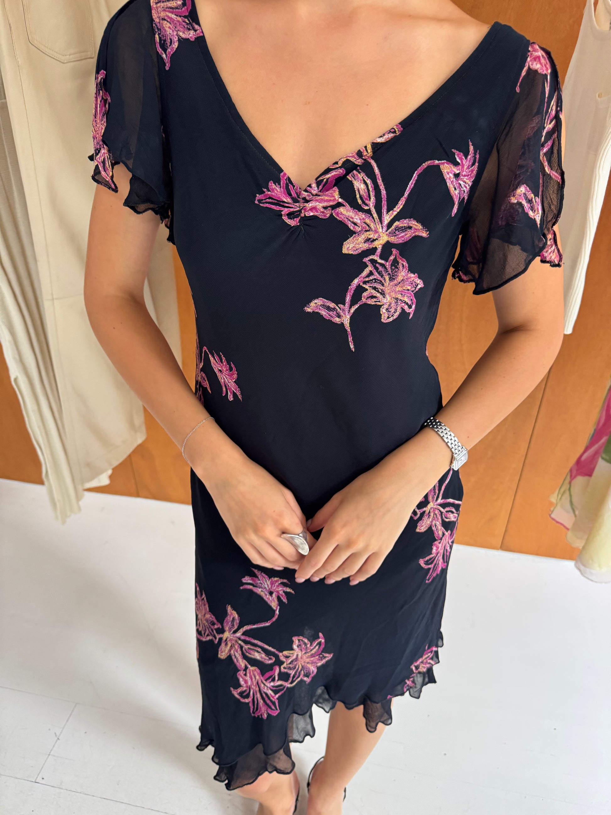 Floral midi dress in black and pink. Fits sizes XS-M.