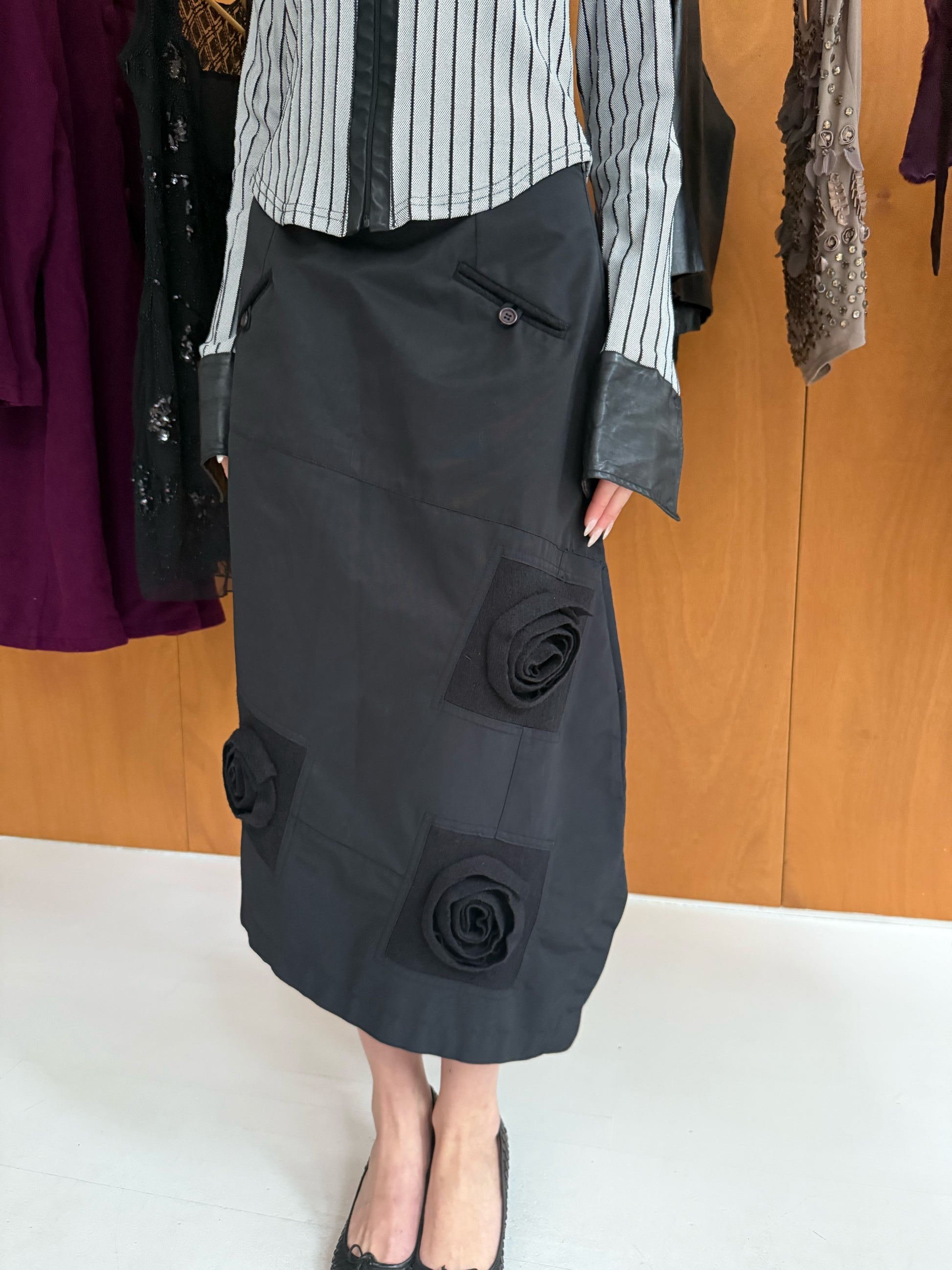 Asymmetrical midi skirt with flower details in black. Fits size S. W 38cm L 78cm.