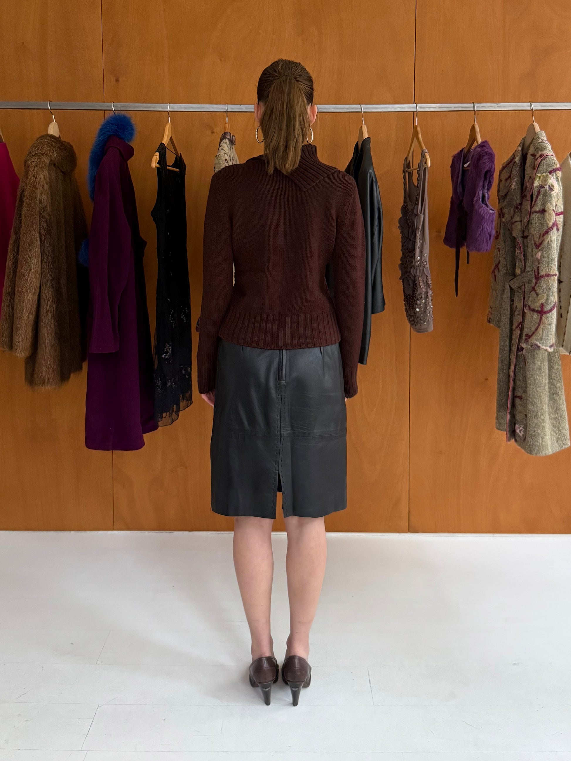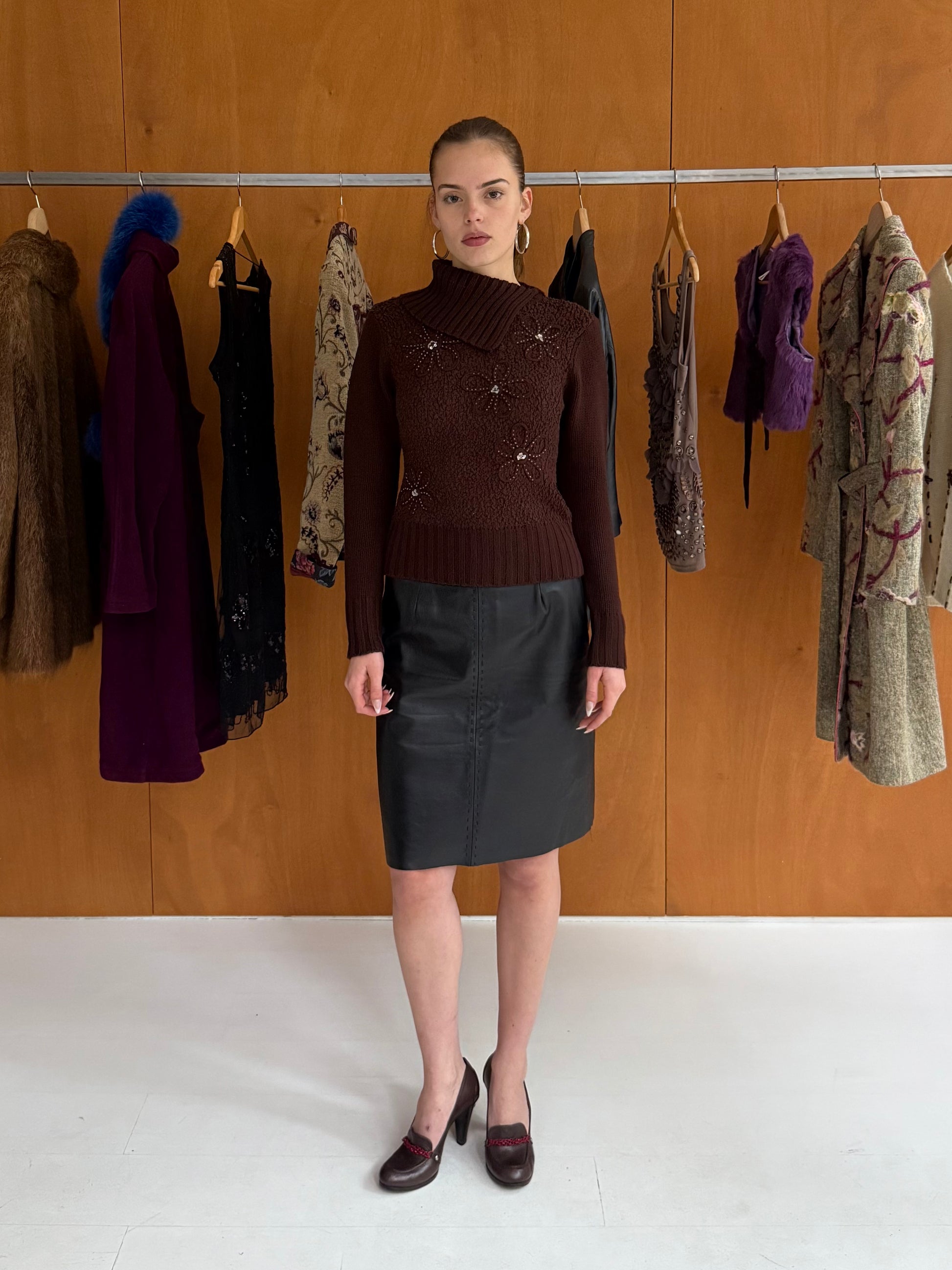 Knit sweater with flower details in brown. Fits sizes XS-M.