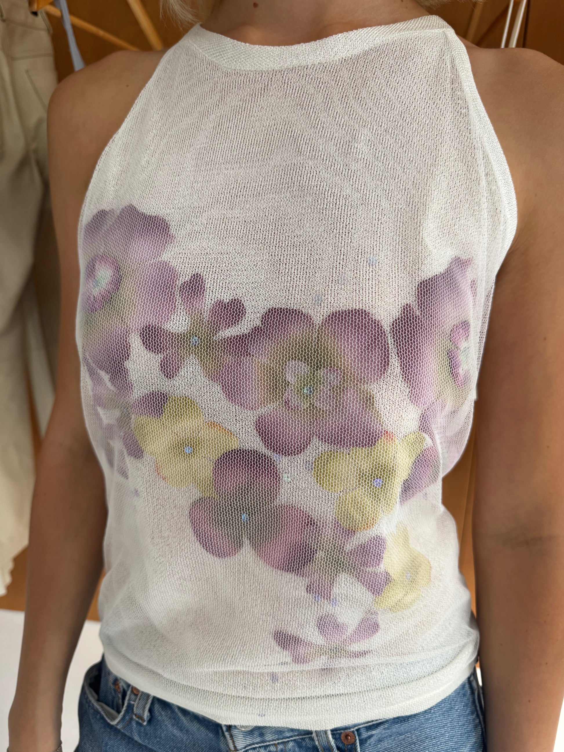 Flower top in white & purple. Fits sizes XS-S.
