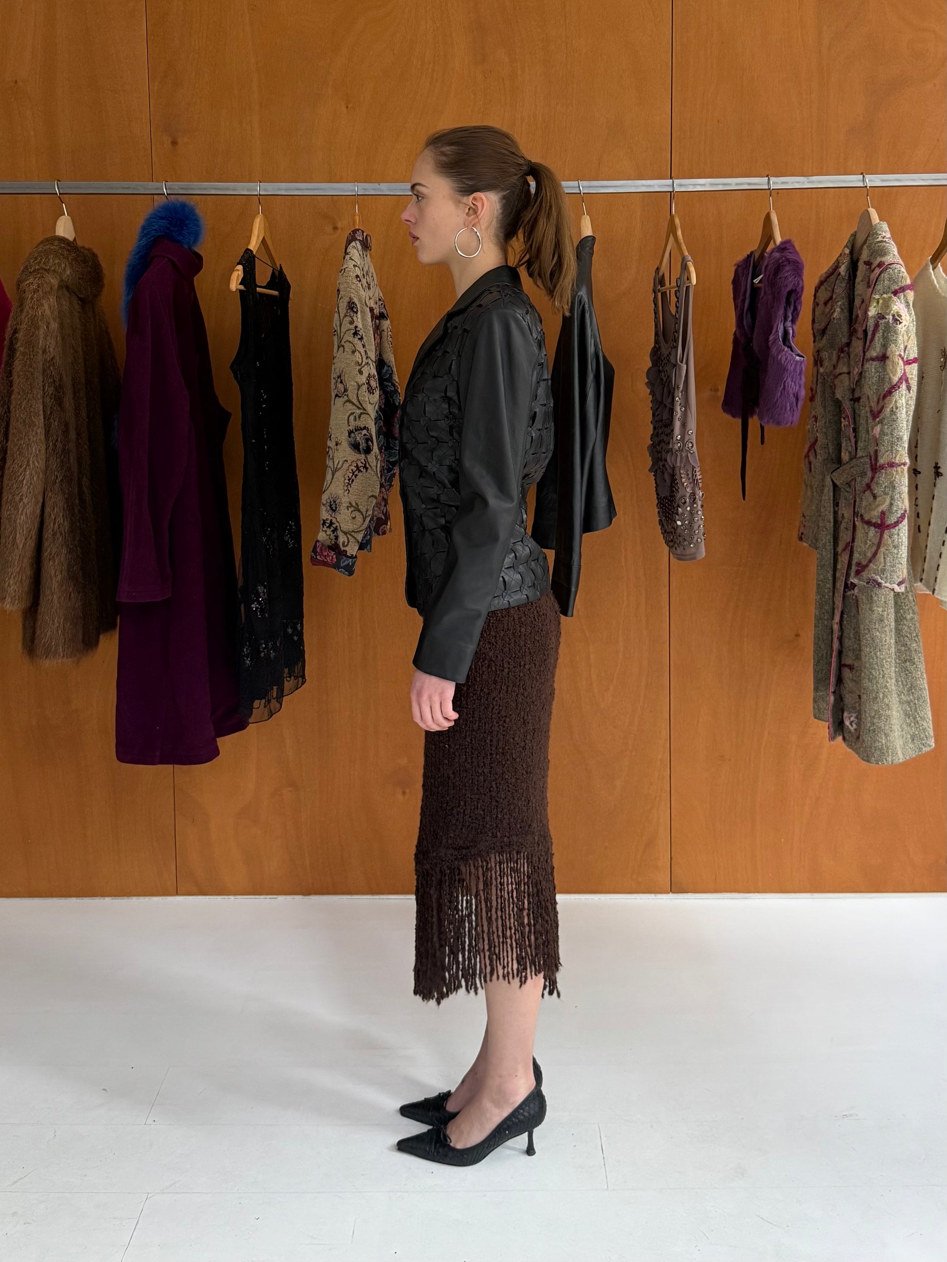 Fringe skirt in brown. Fits sizes S-M. W 36cm L 48cm.