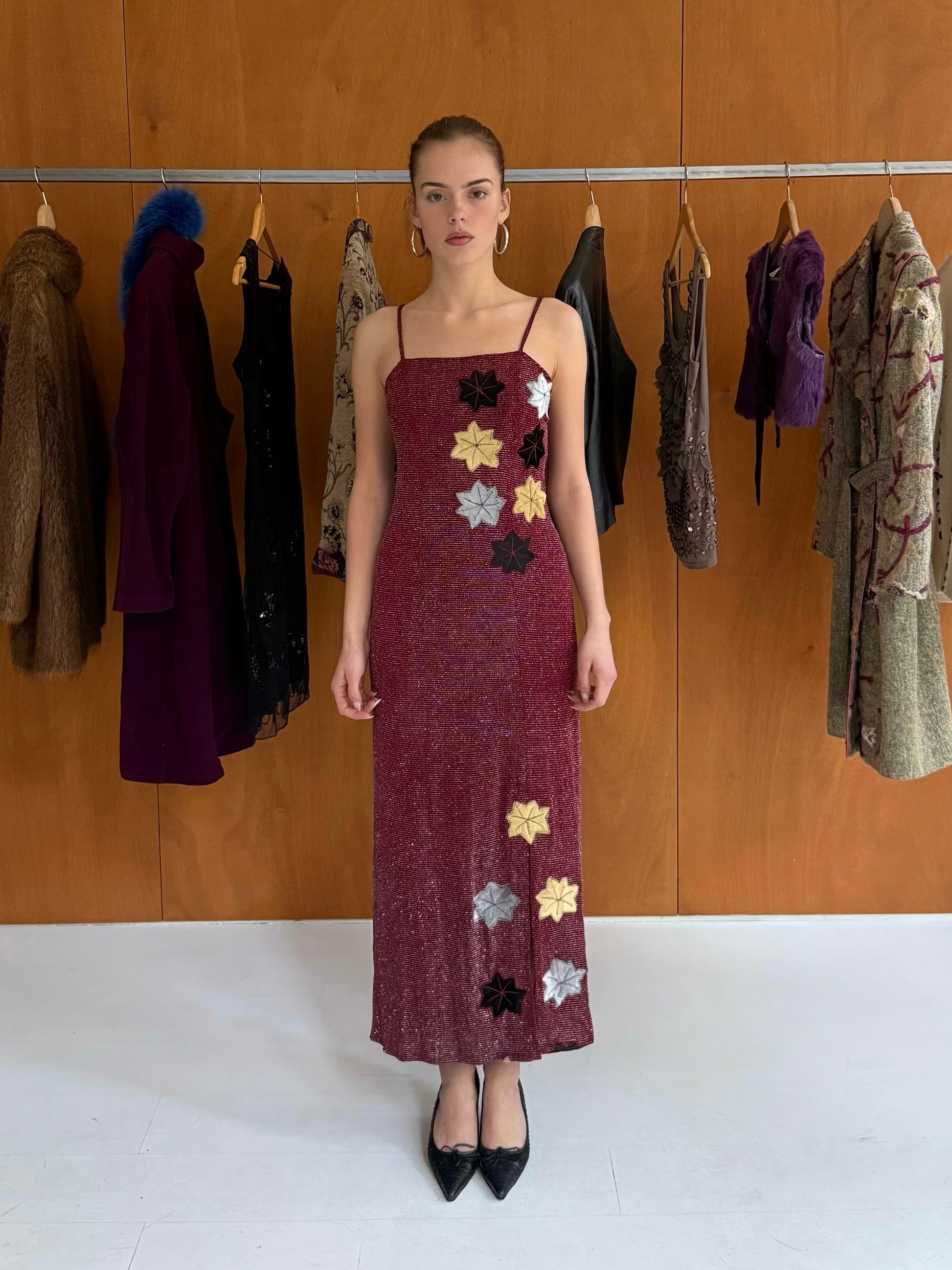 Glitter dress in burgundy with flower details in black, silver & gold. Fits sizes S-M.