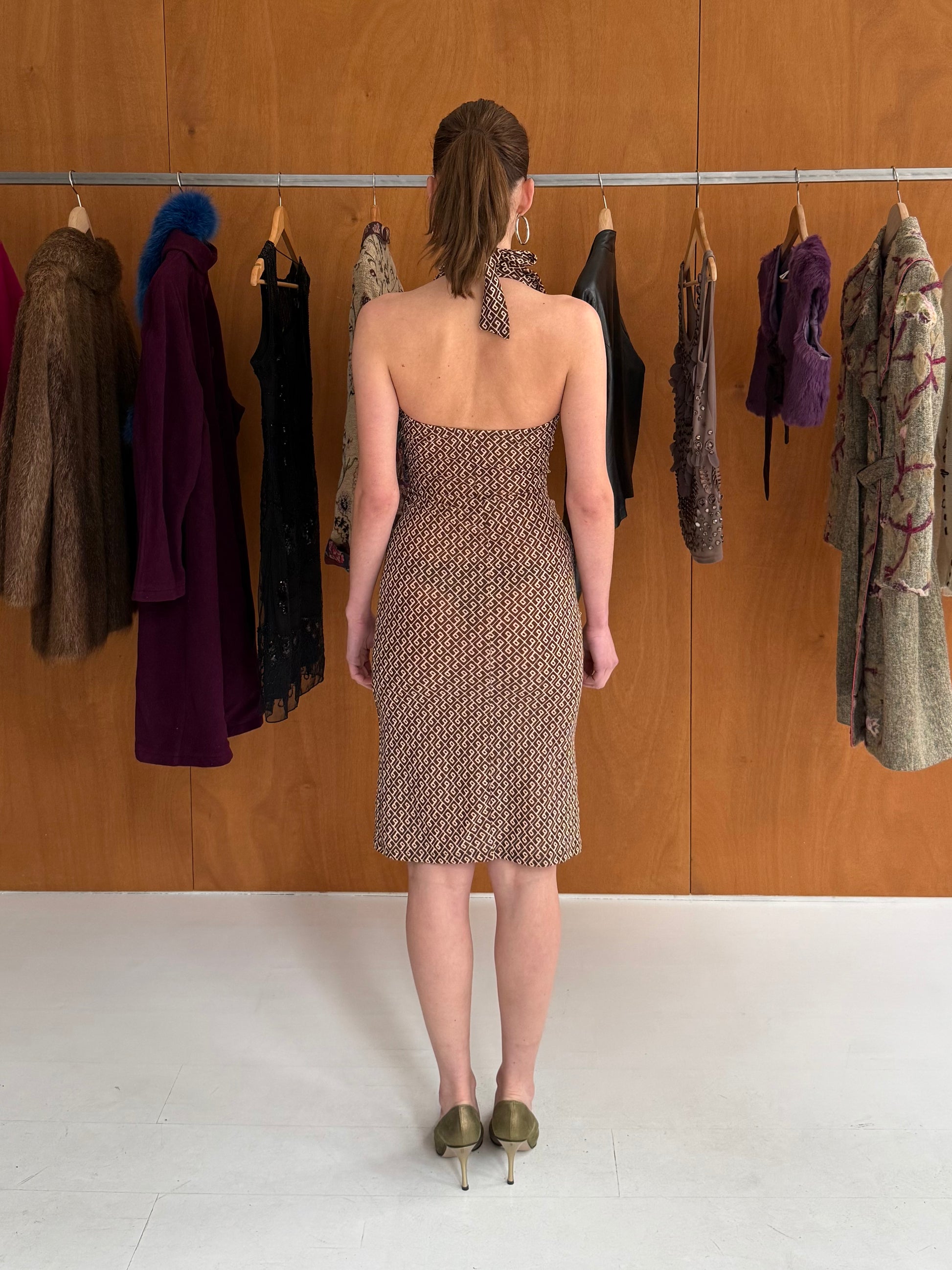 Halter print dress in brown & white with small gold glitter details. Fits size S.