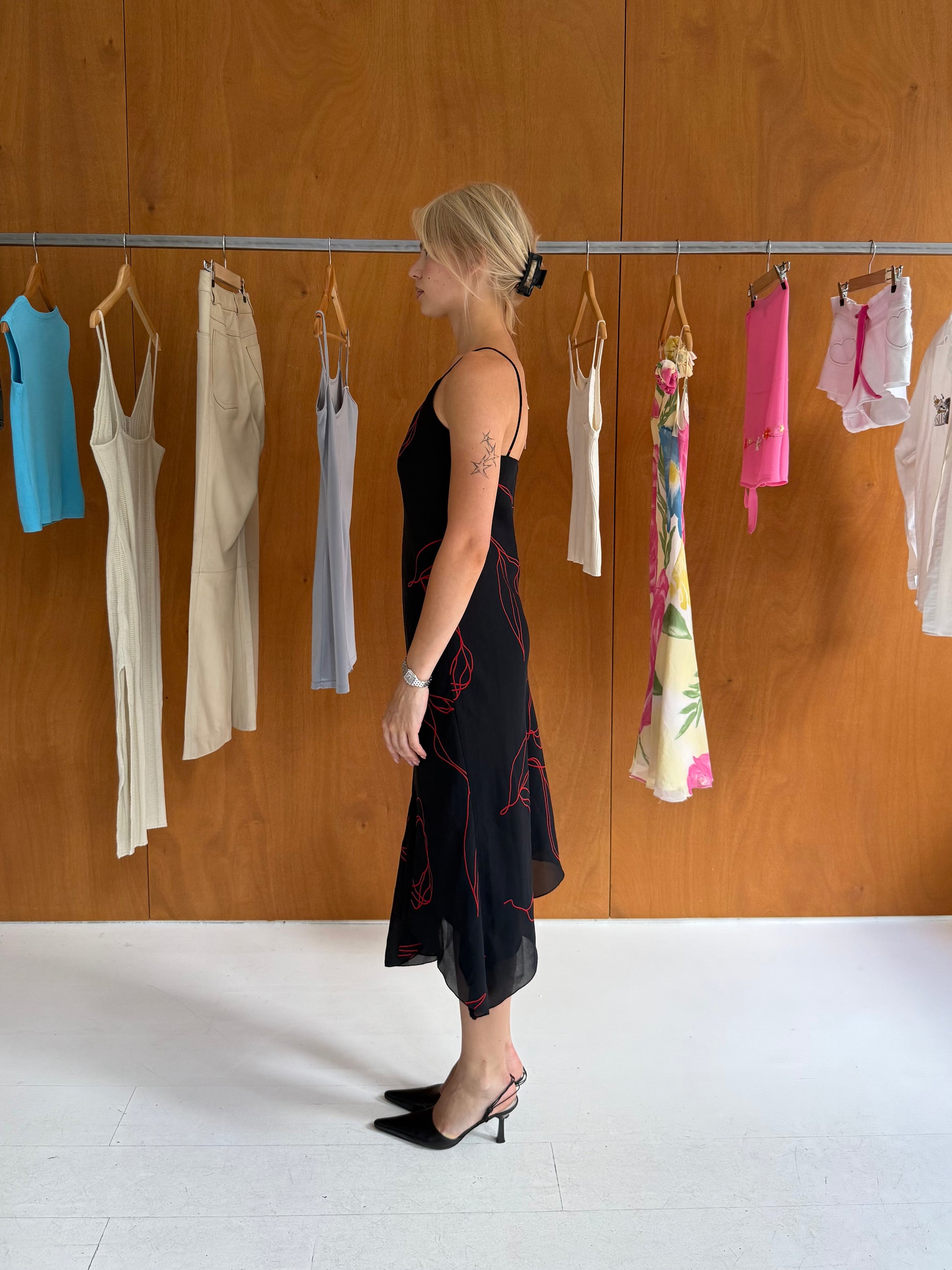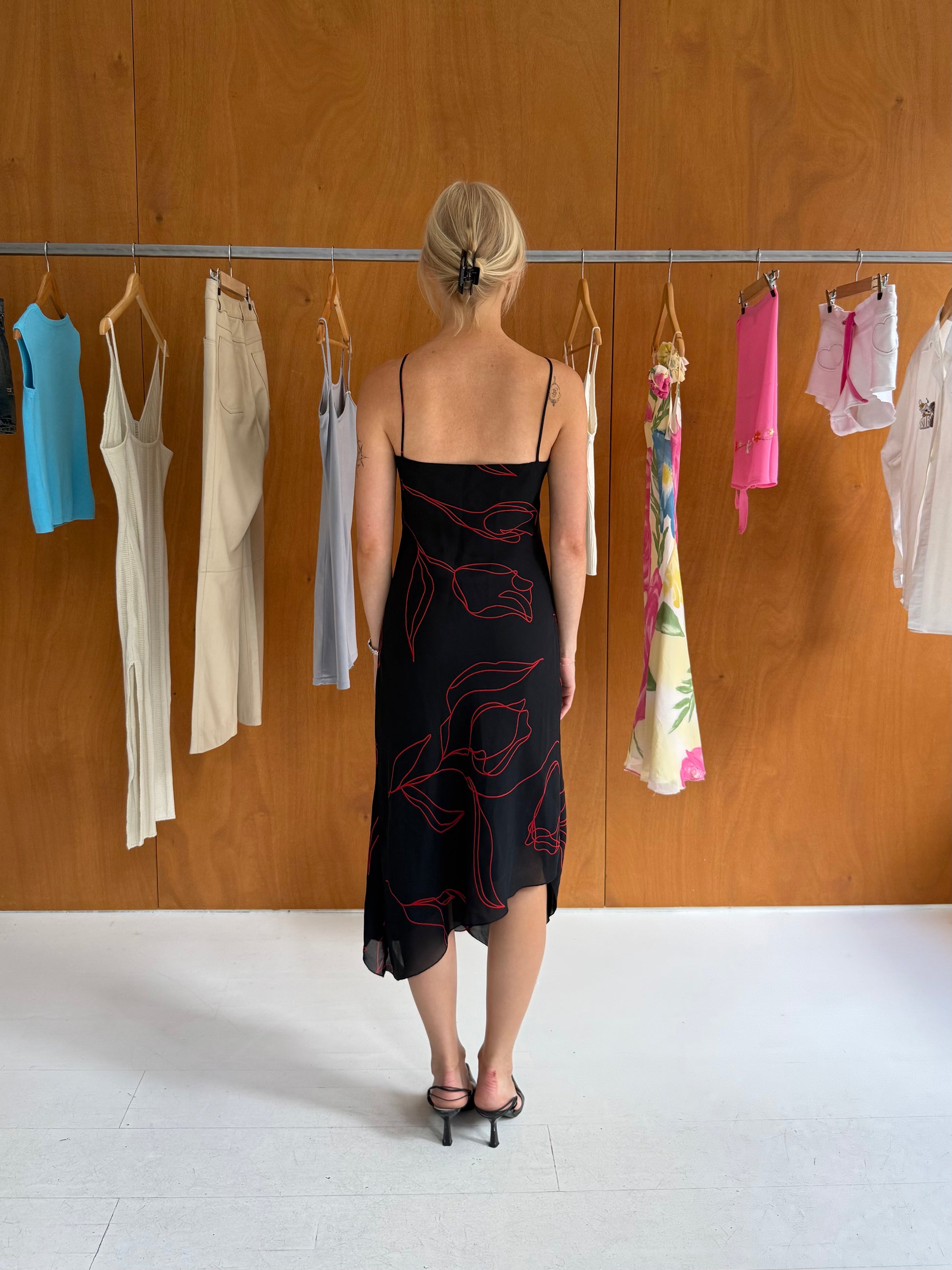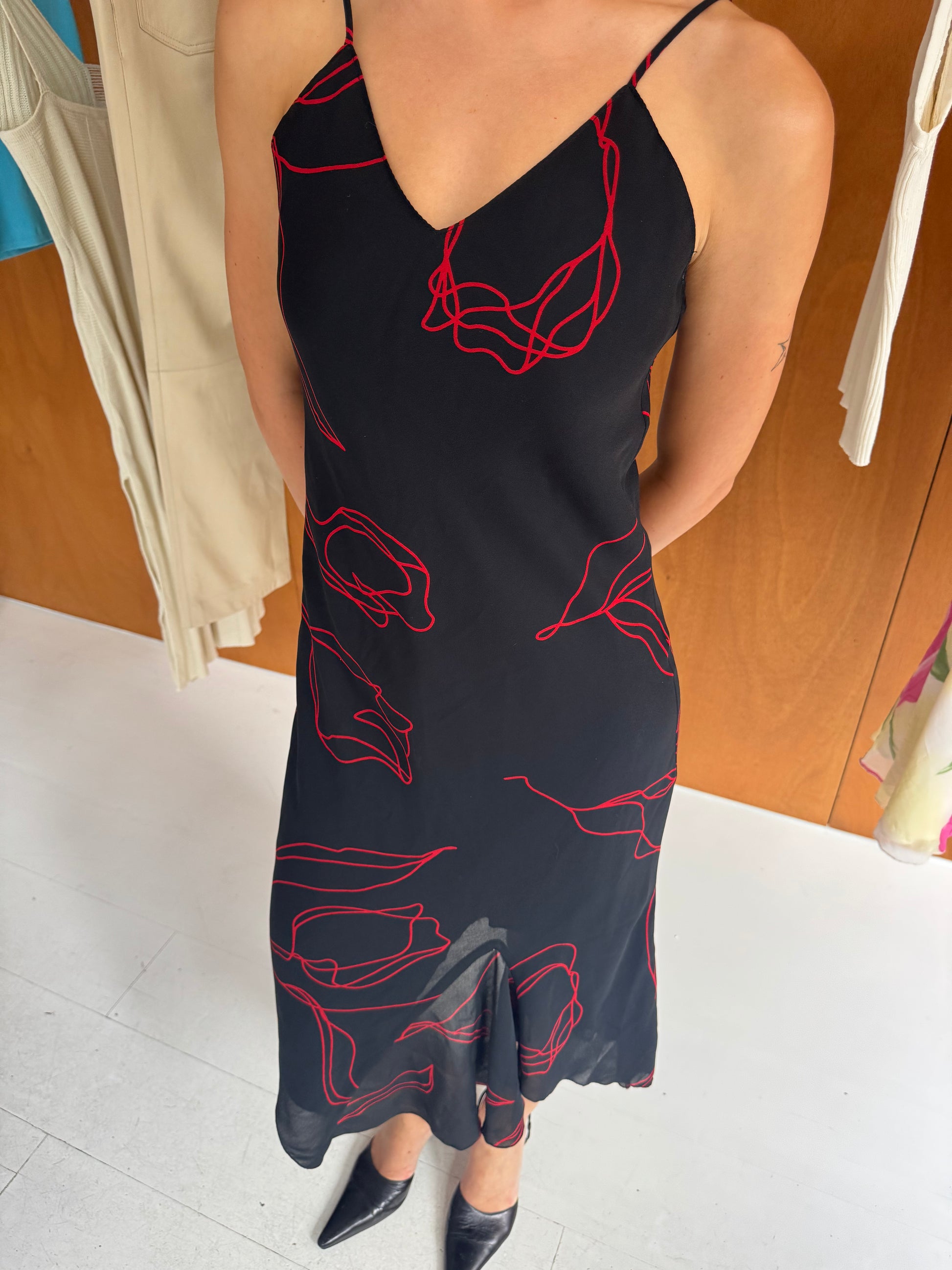 Midi dress with flower illustration in black and red. Fits sizes XS-M.