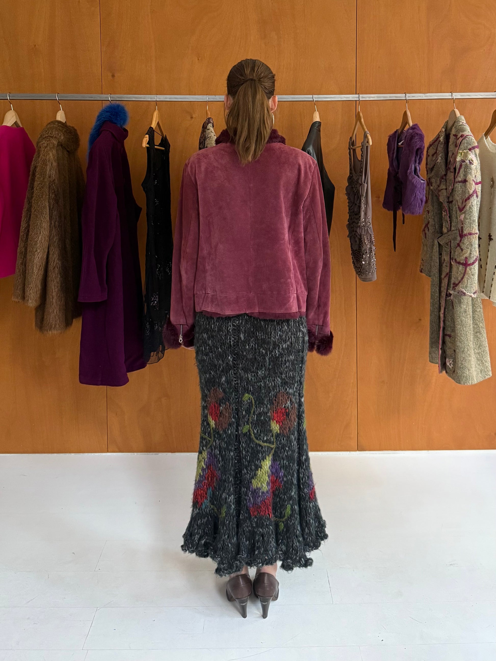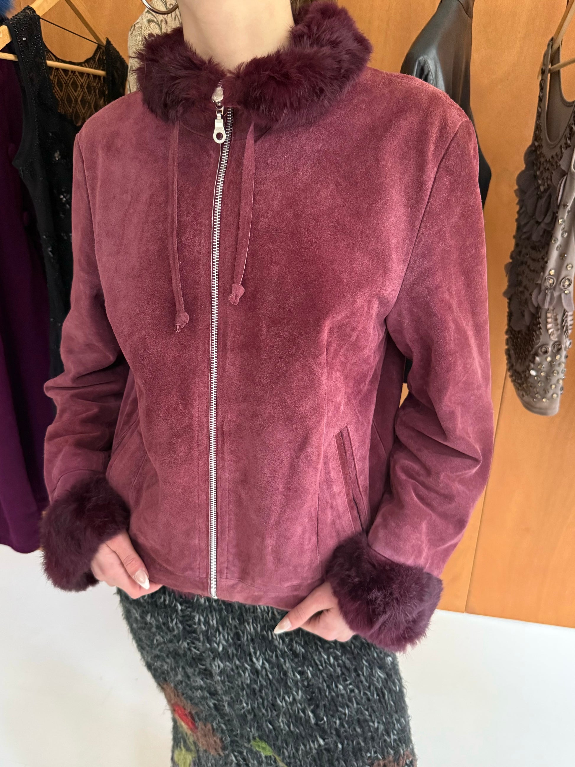 Leather & fur jacket in burgundy. Fits sizes XS-M.