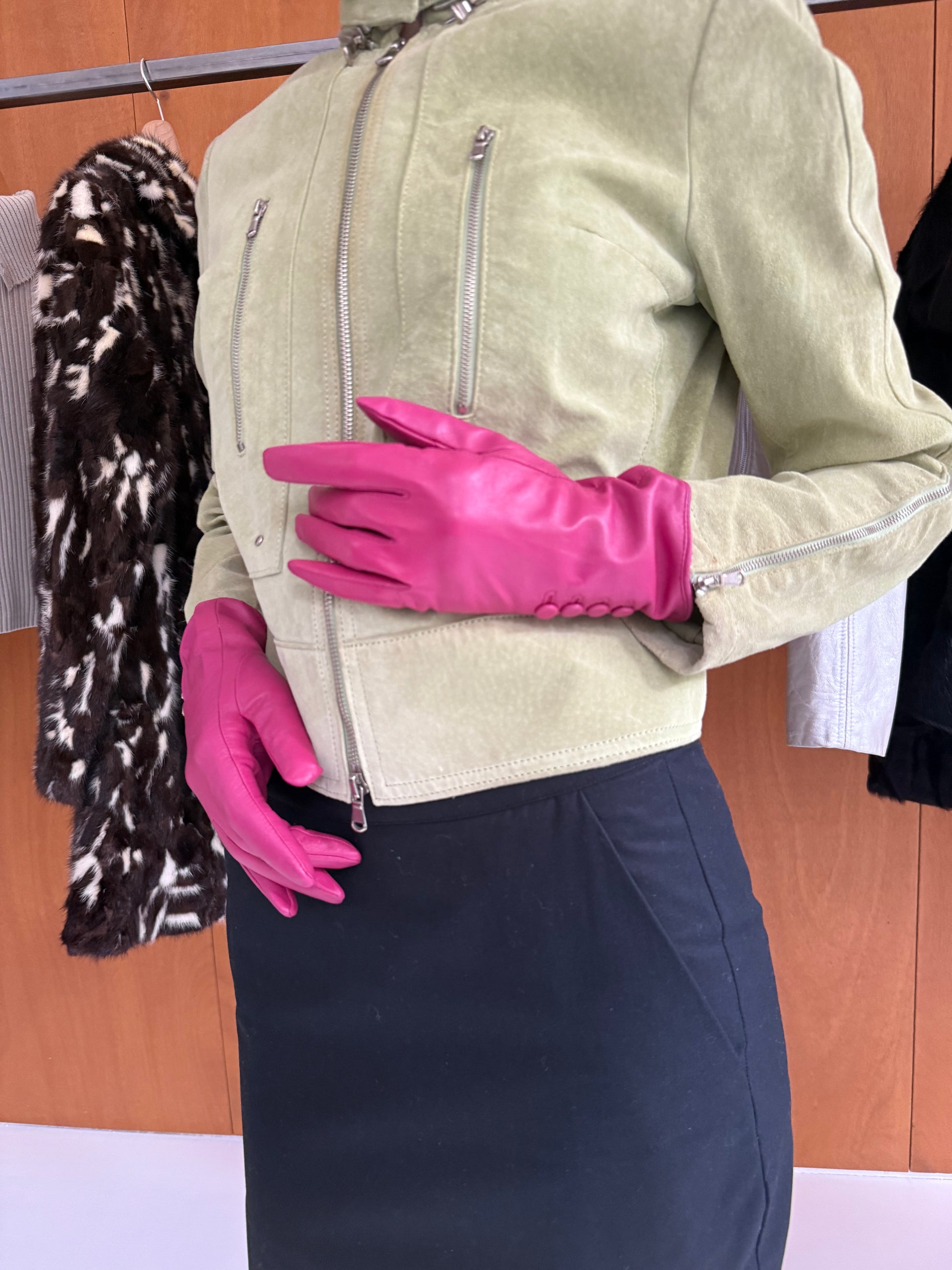 Leather gloves with button details in pink. Never worn. Size S. W 9cm L 24cm.