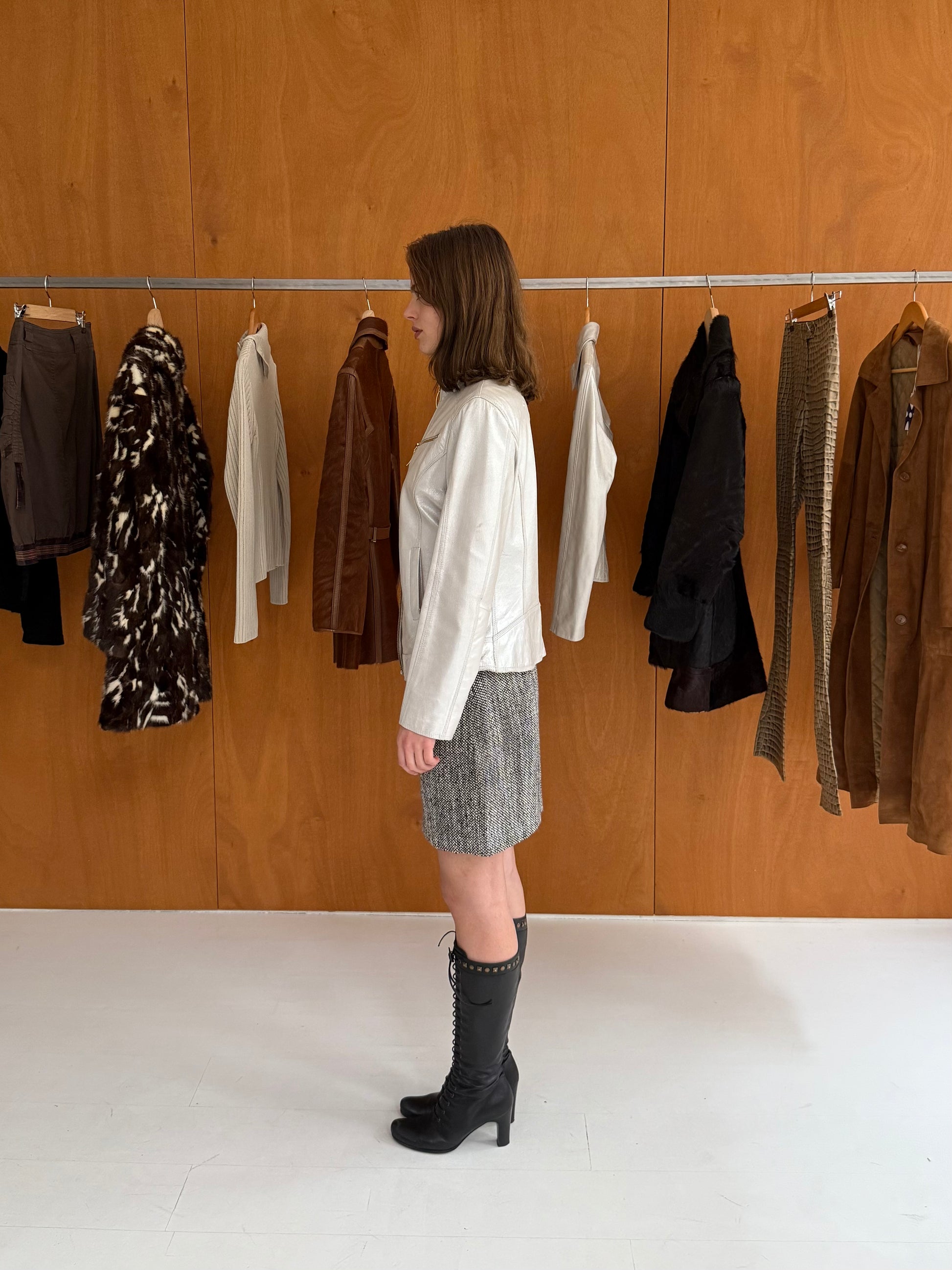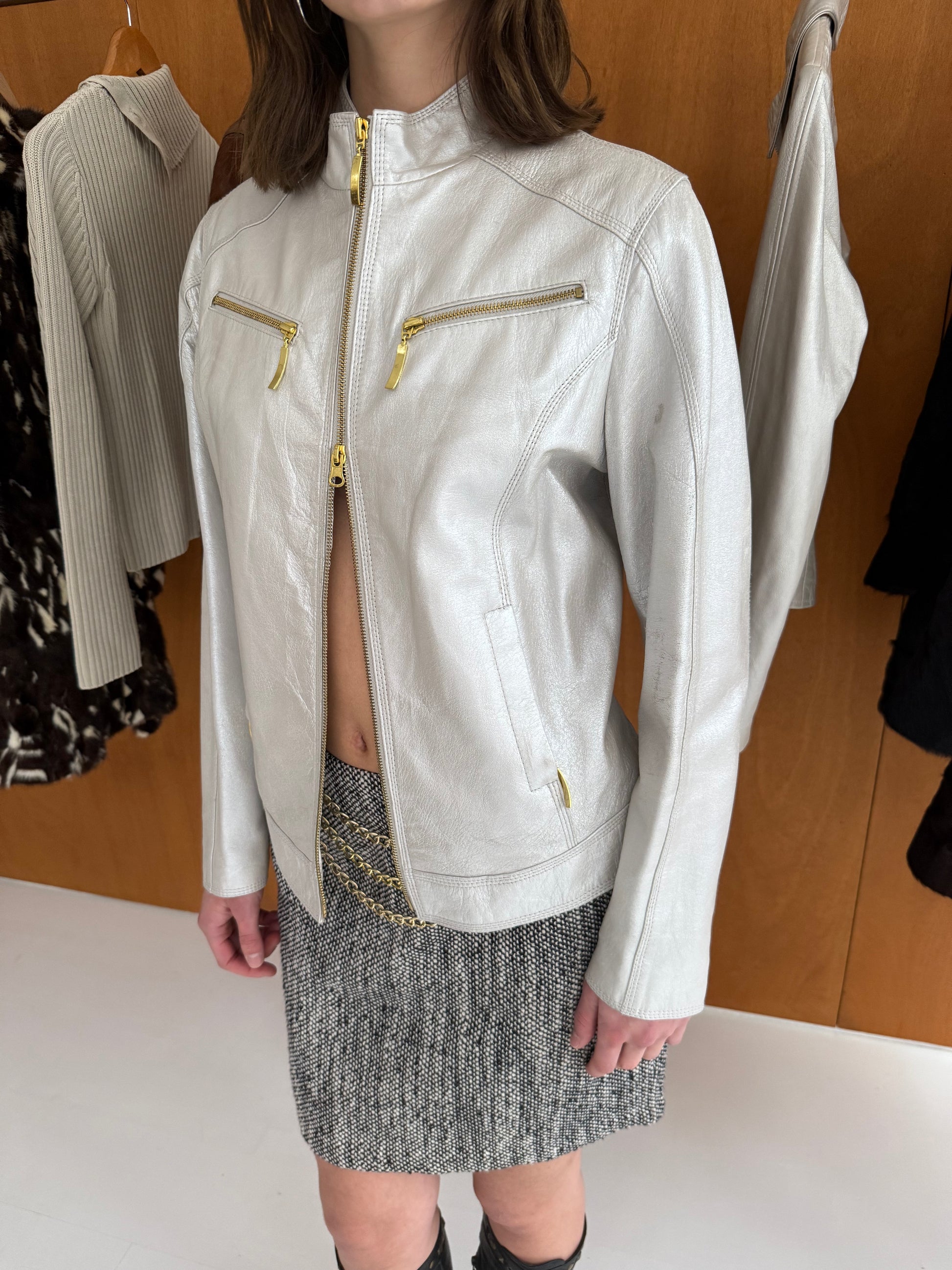 Leather jacket in silver with gold zippers. Fits sizes XS-M.