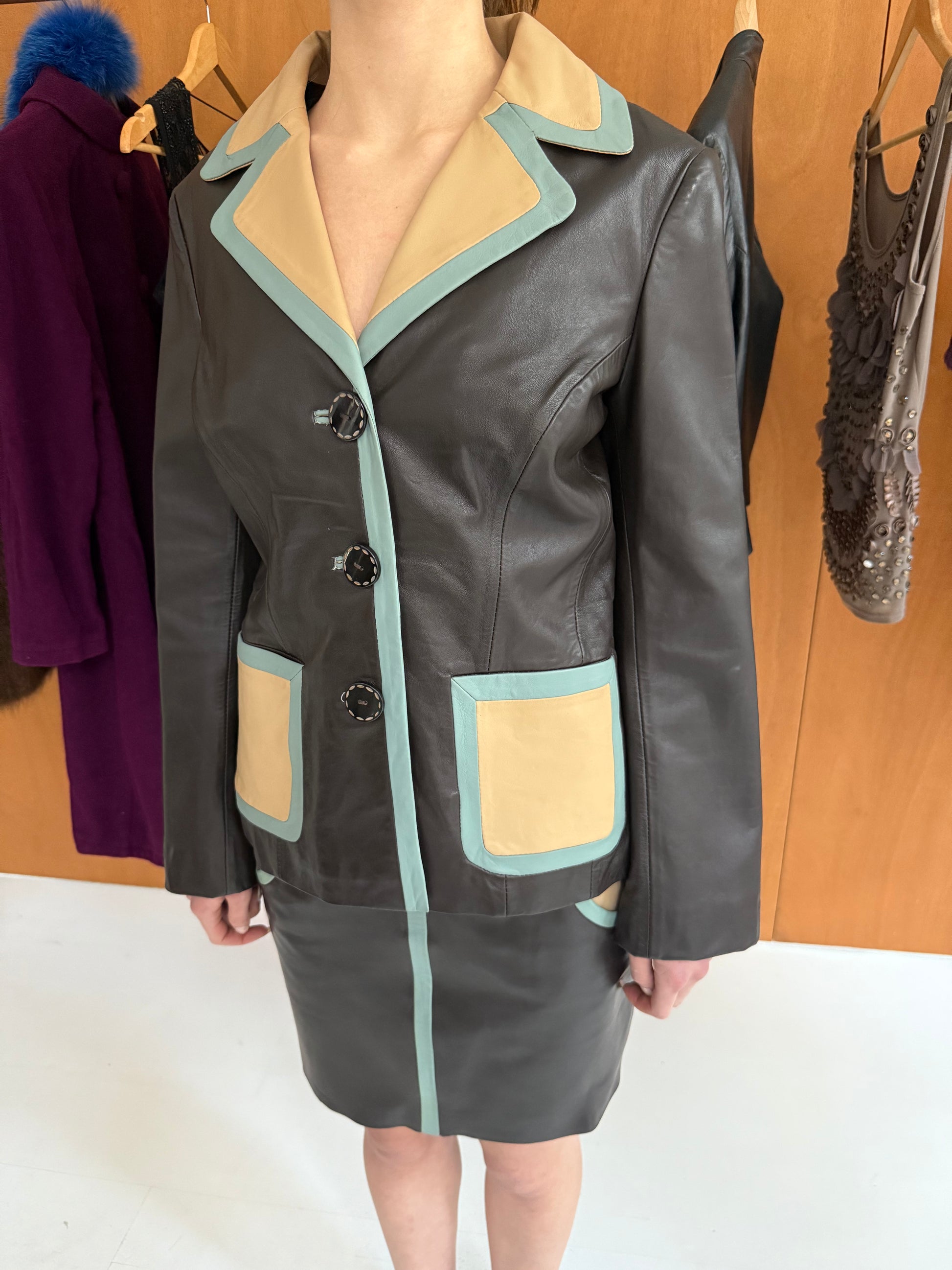 Leather set: jacket + skirt in brown, beige & blue. Fits sizes S-M. Skirt W 40cm L 39cm.