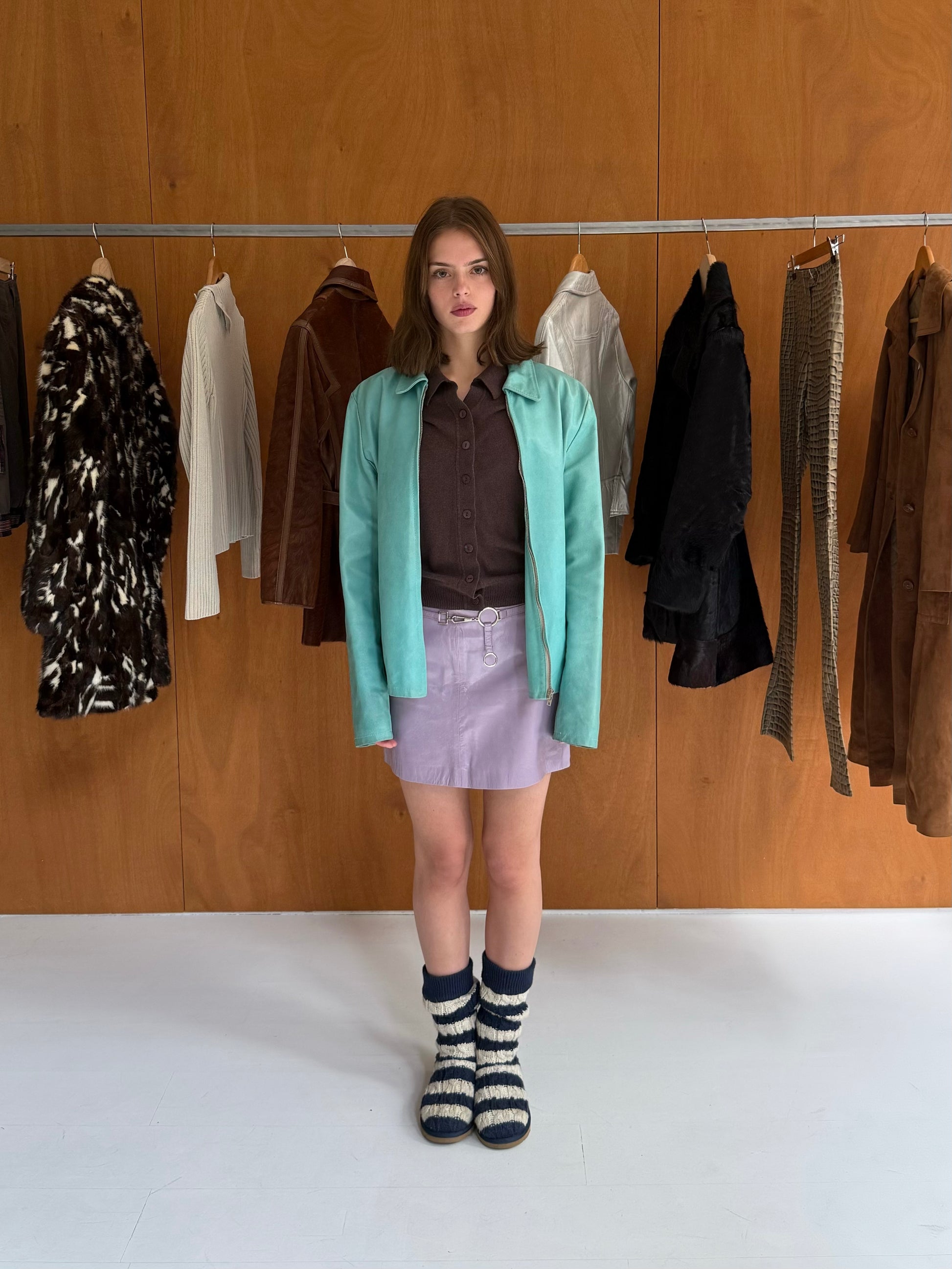 Leather skirt in lilac with metal belt. Fits size S. W 36cm L 37cm.