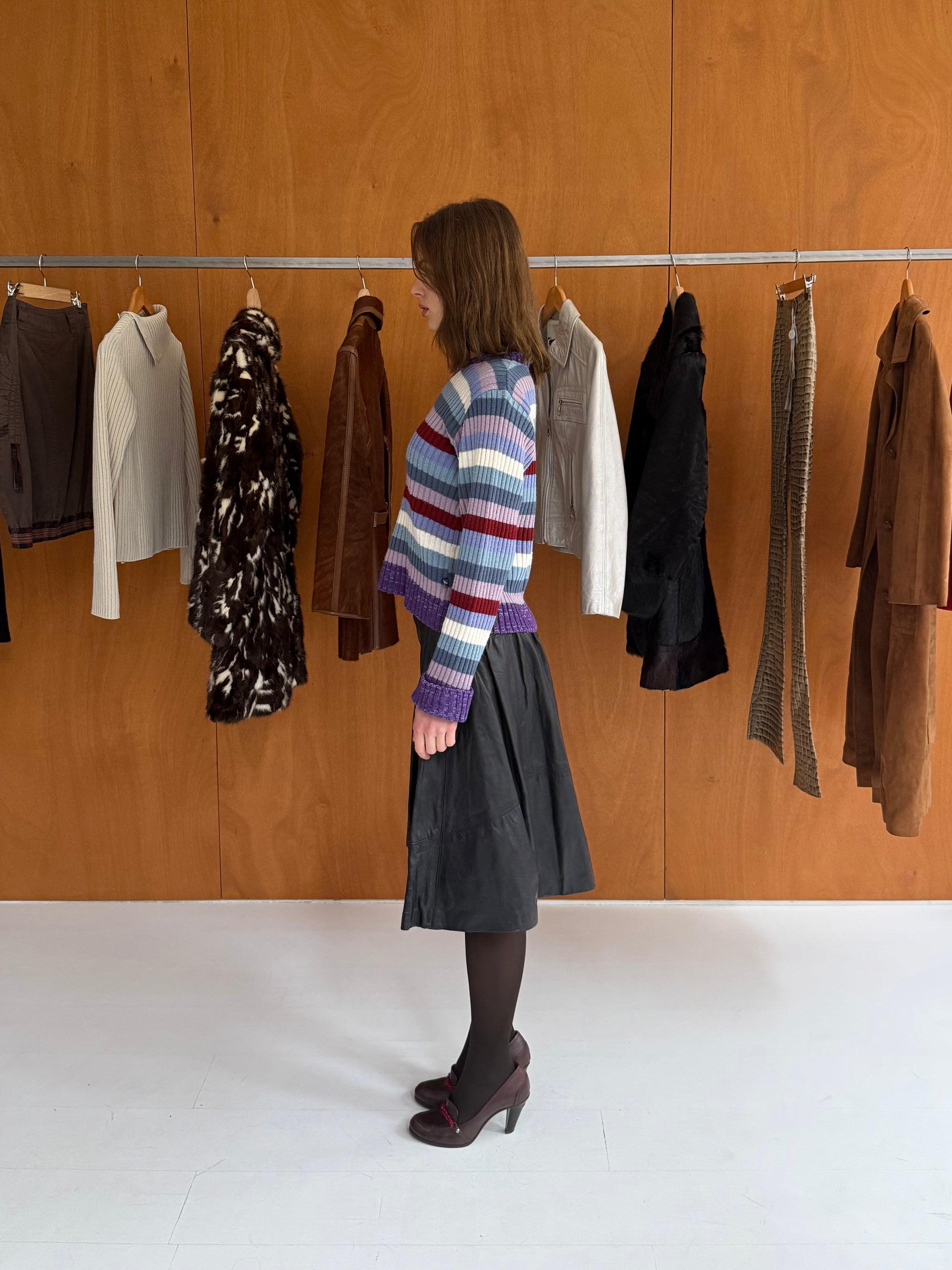 Leather midi skirt in black. Fits sizes XS-S. W 36cm L 67cm.