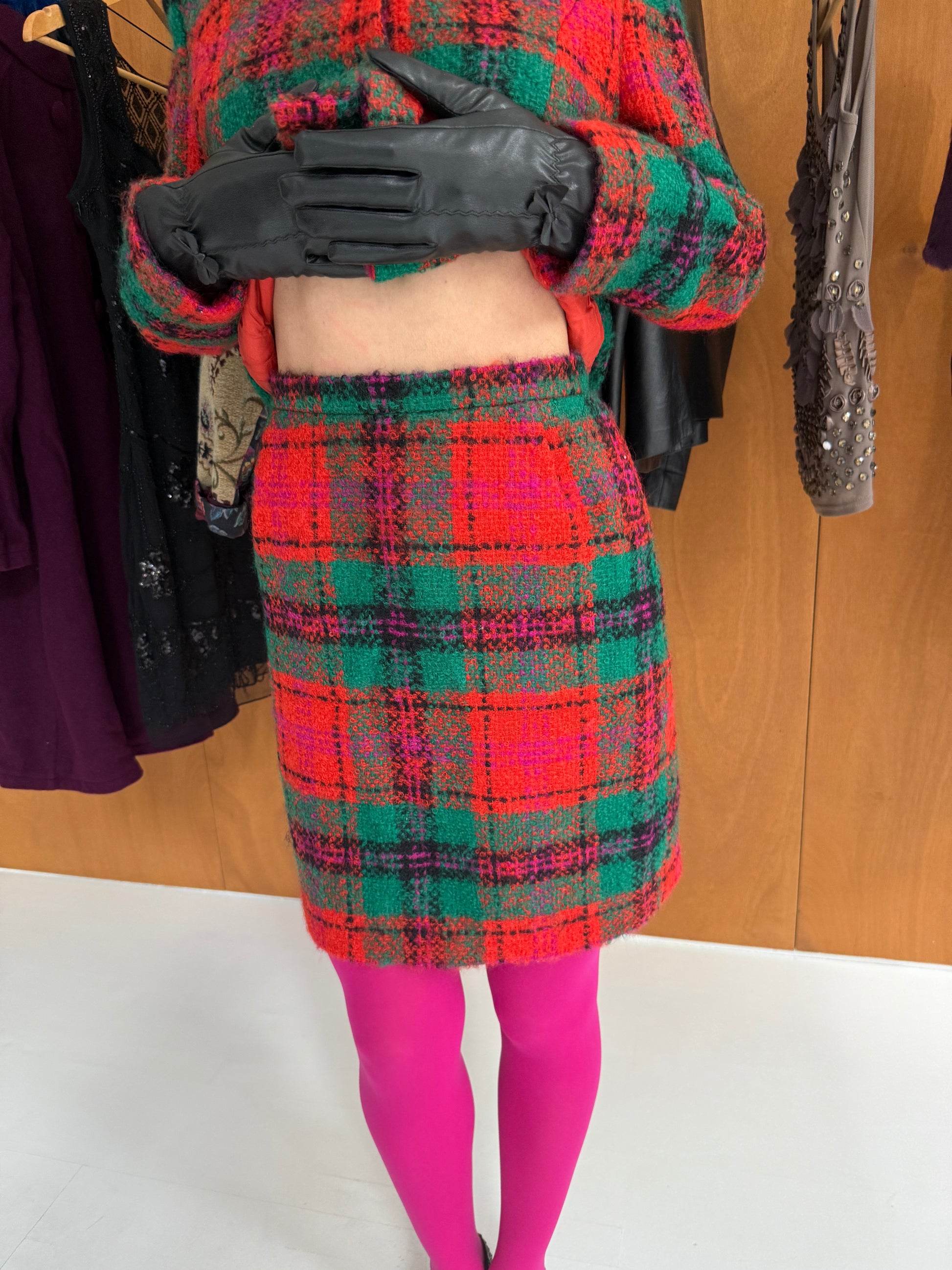 Matching set: plaid jacket + skirt in red, green, pink & black. Fits sizes XS-S. Skirt W 33cm L 50cm.