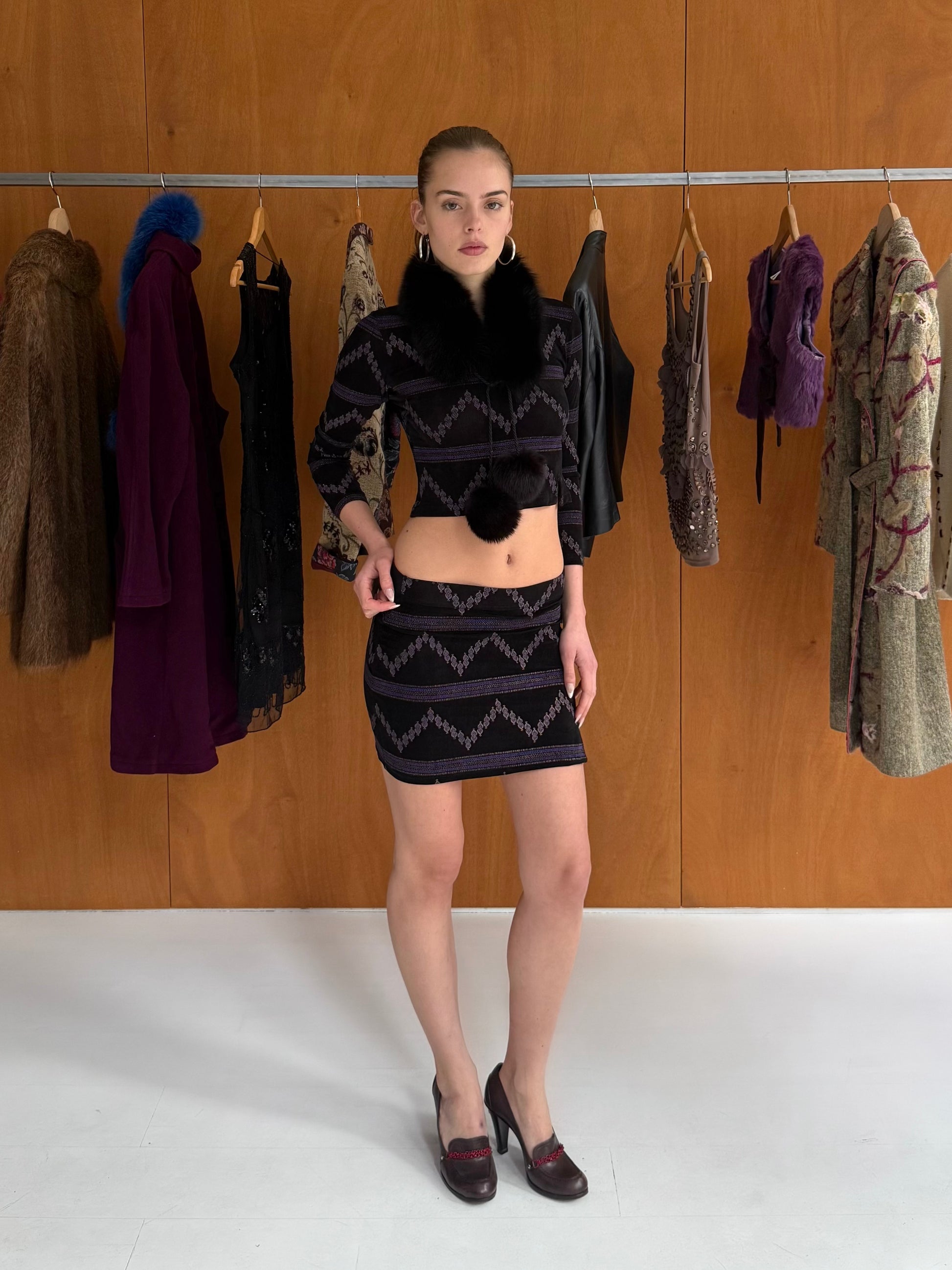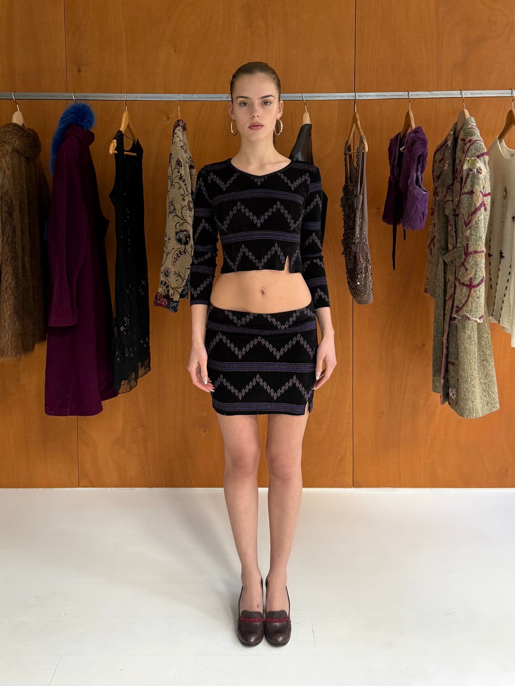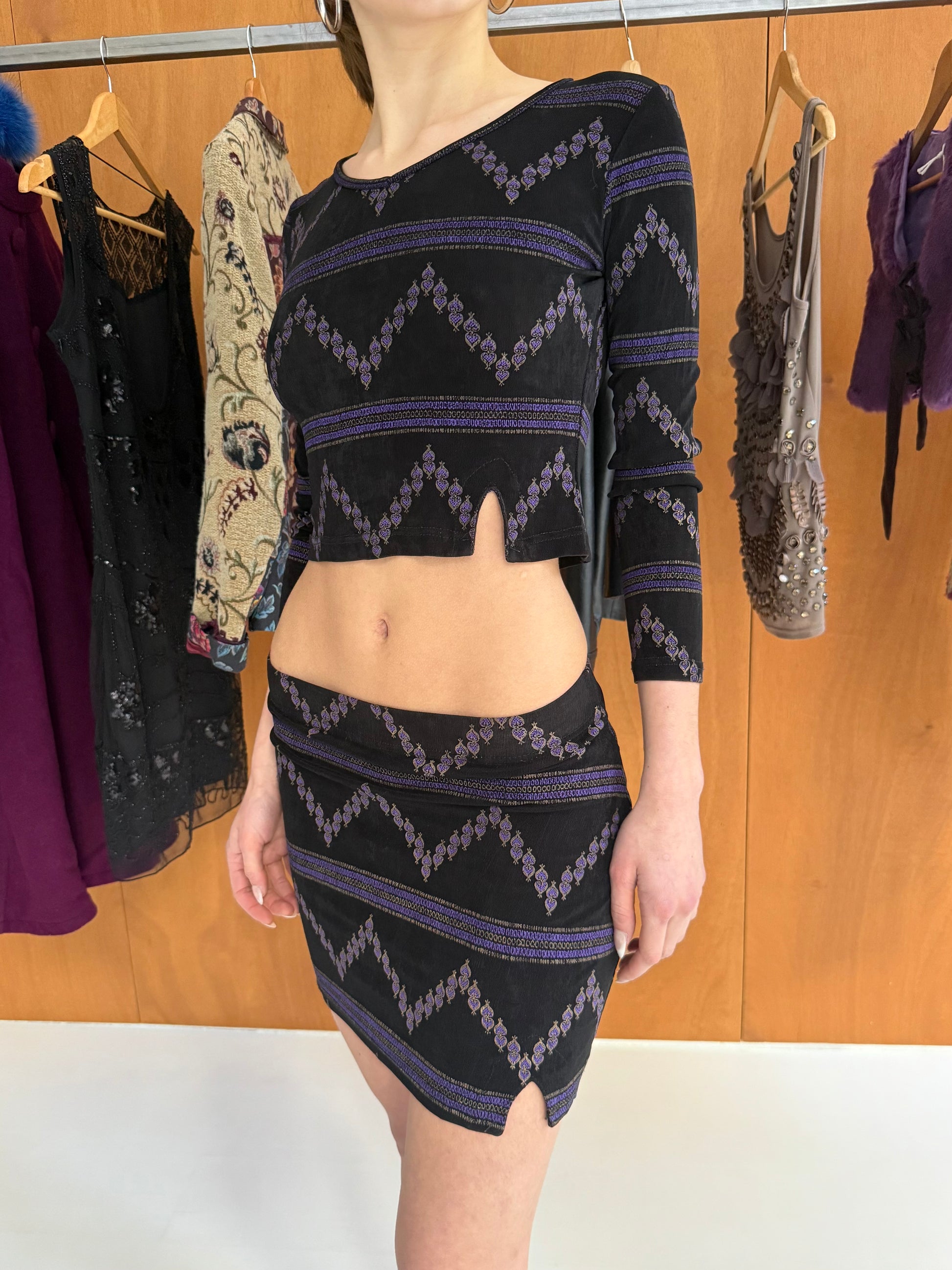 Matching set: top + skirt in purple & black. Fits sizes XXS-S. Skirt W 31cm L 38cm, stretchy material.