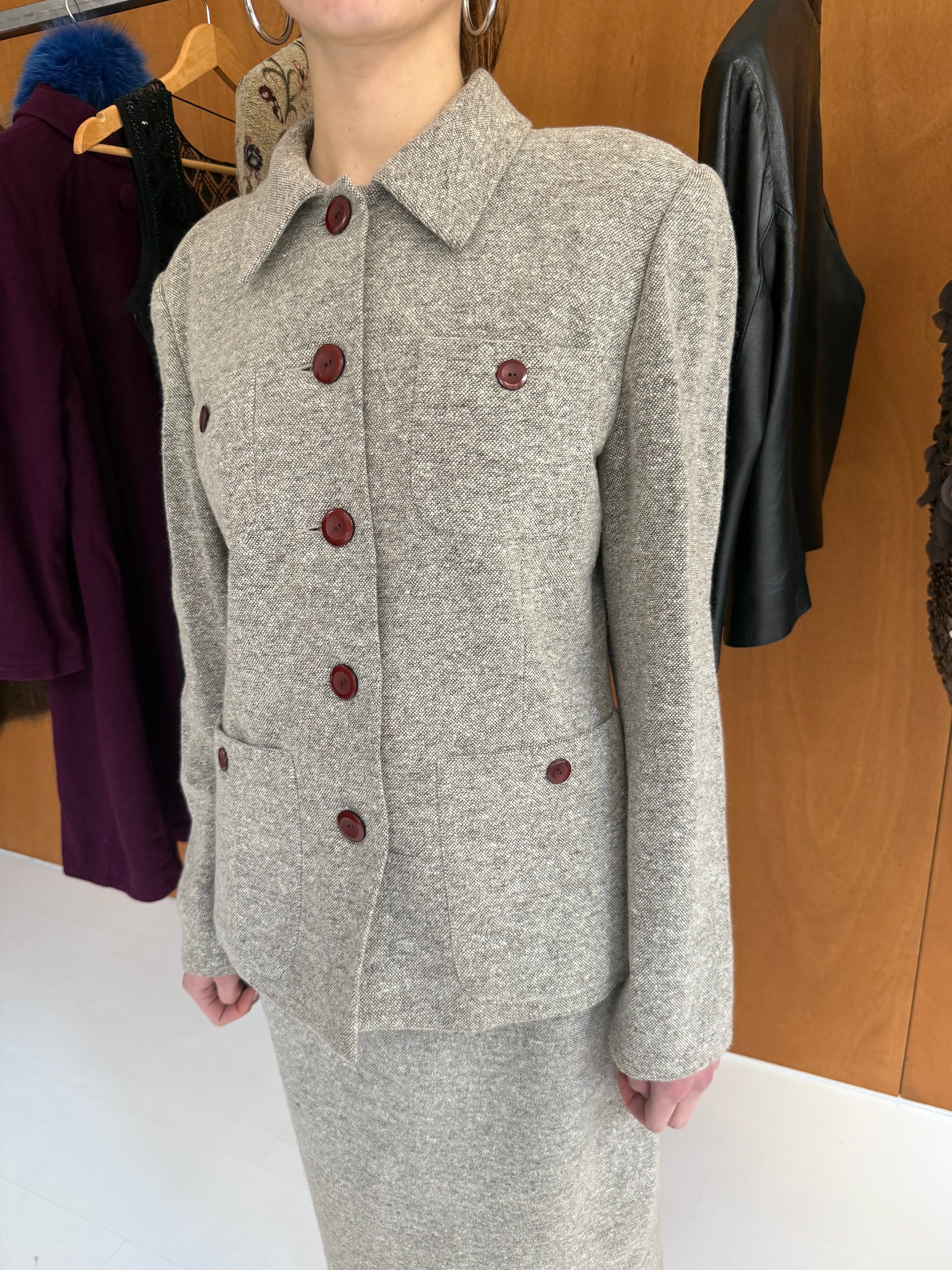 Matching skirt suit: jacket + skirt in grey. Fits size M. Skirt W 36cm L 68cm.