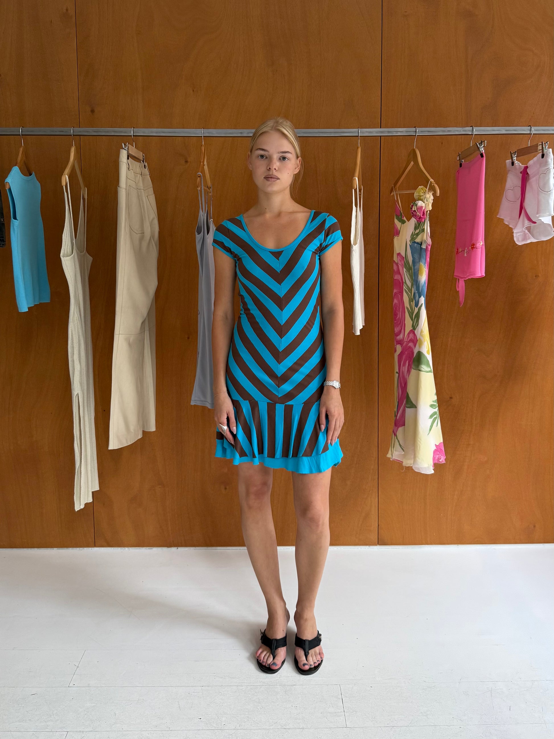 Striped mini backless dress in brown & blue. Fits sizes XS-M.