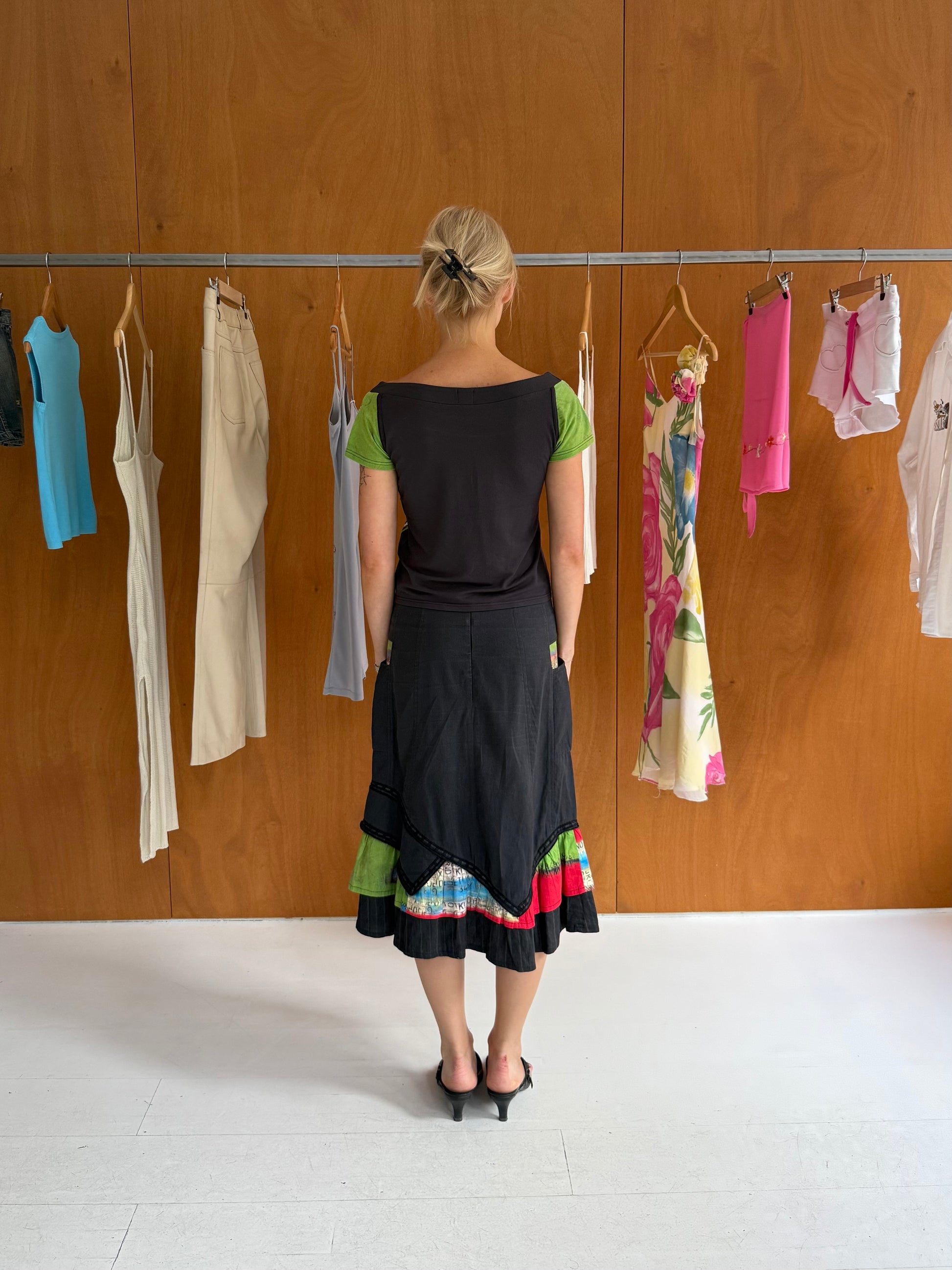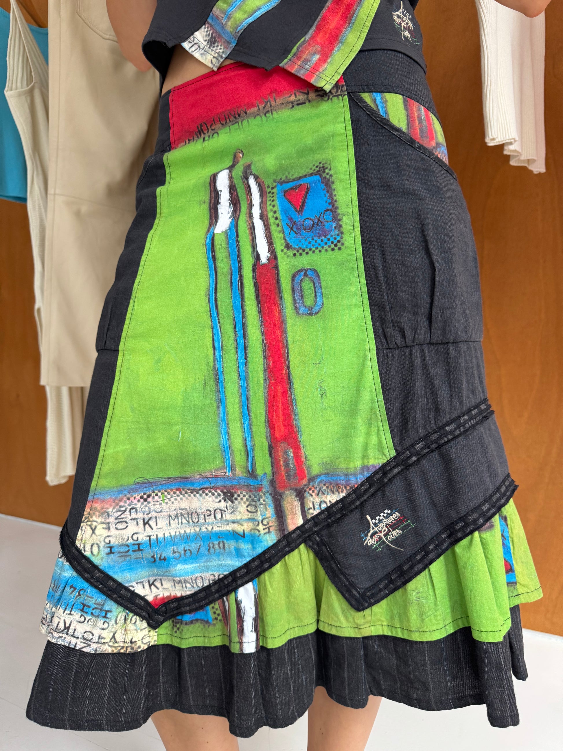 Skirt and top print set in grey, green, and red. Fits sizes S-M.