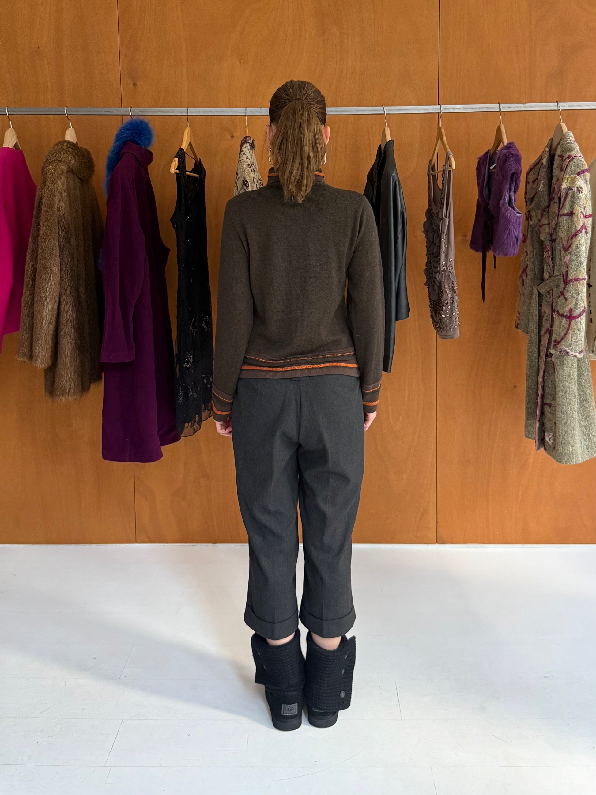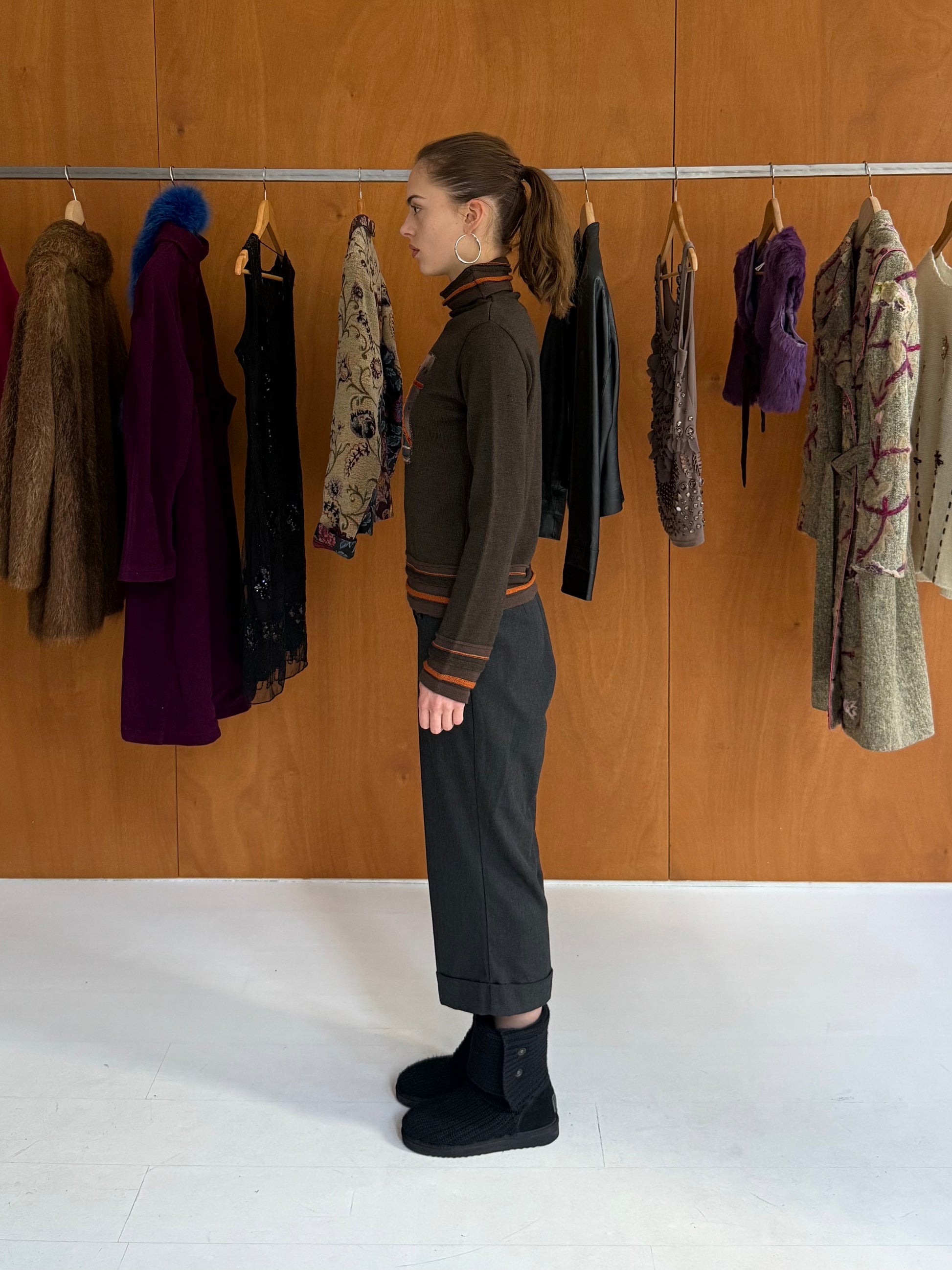 High-neck print sweater in brown & orange. Fits sizes XS-M.