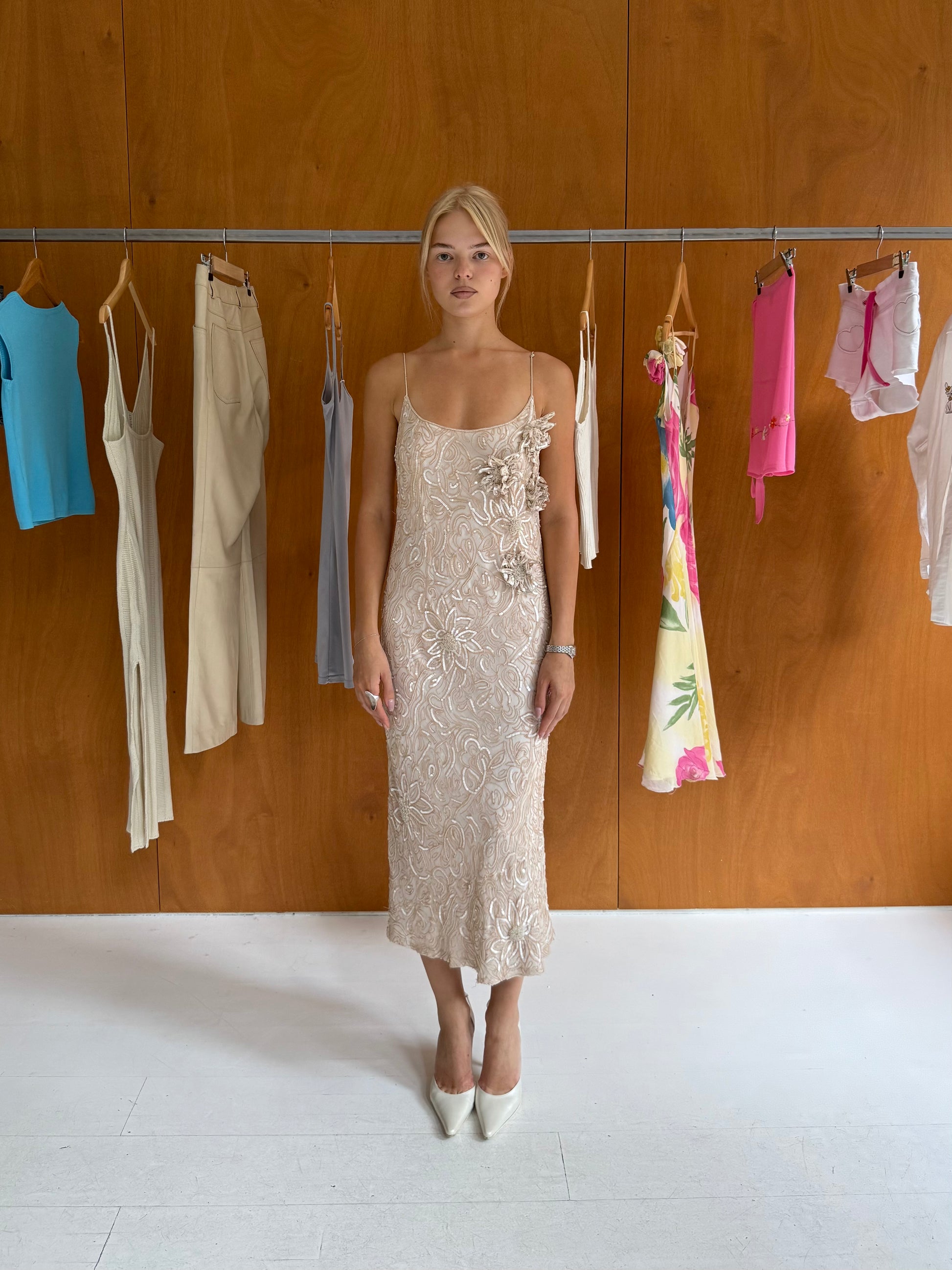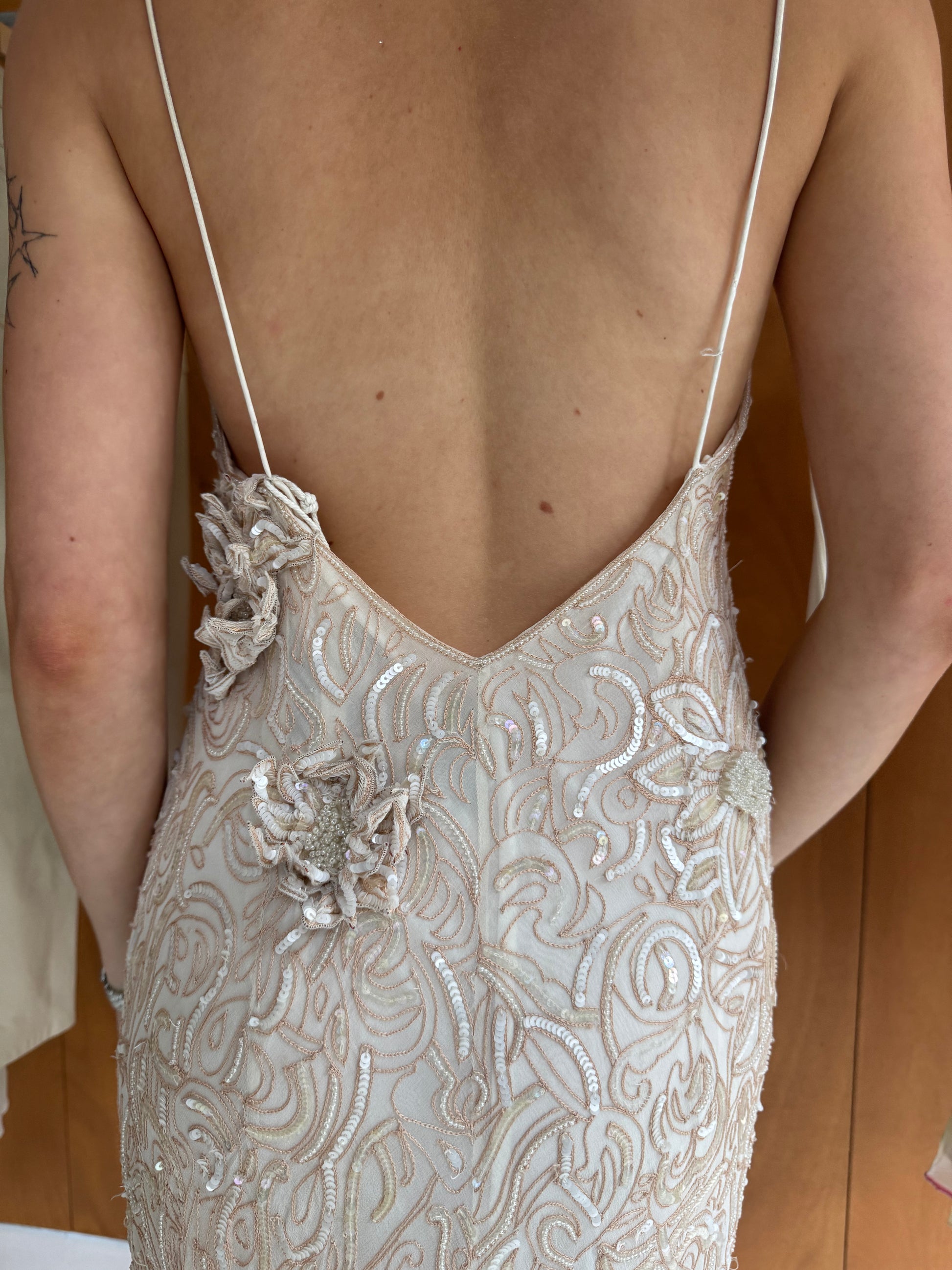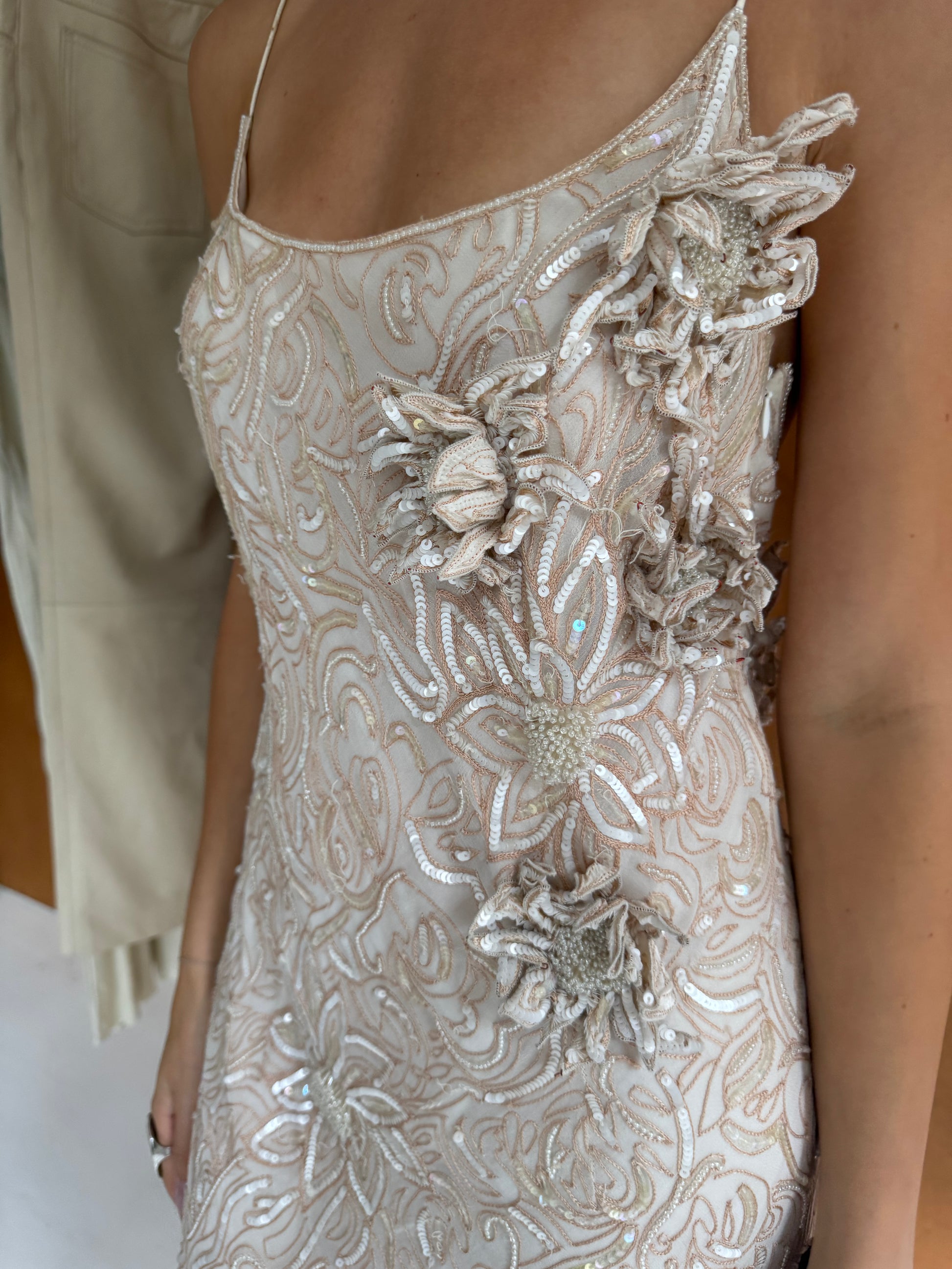 Sequin floral evening dress in ivory & beige. Fits sizes S-M.
