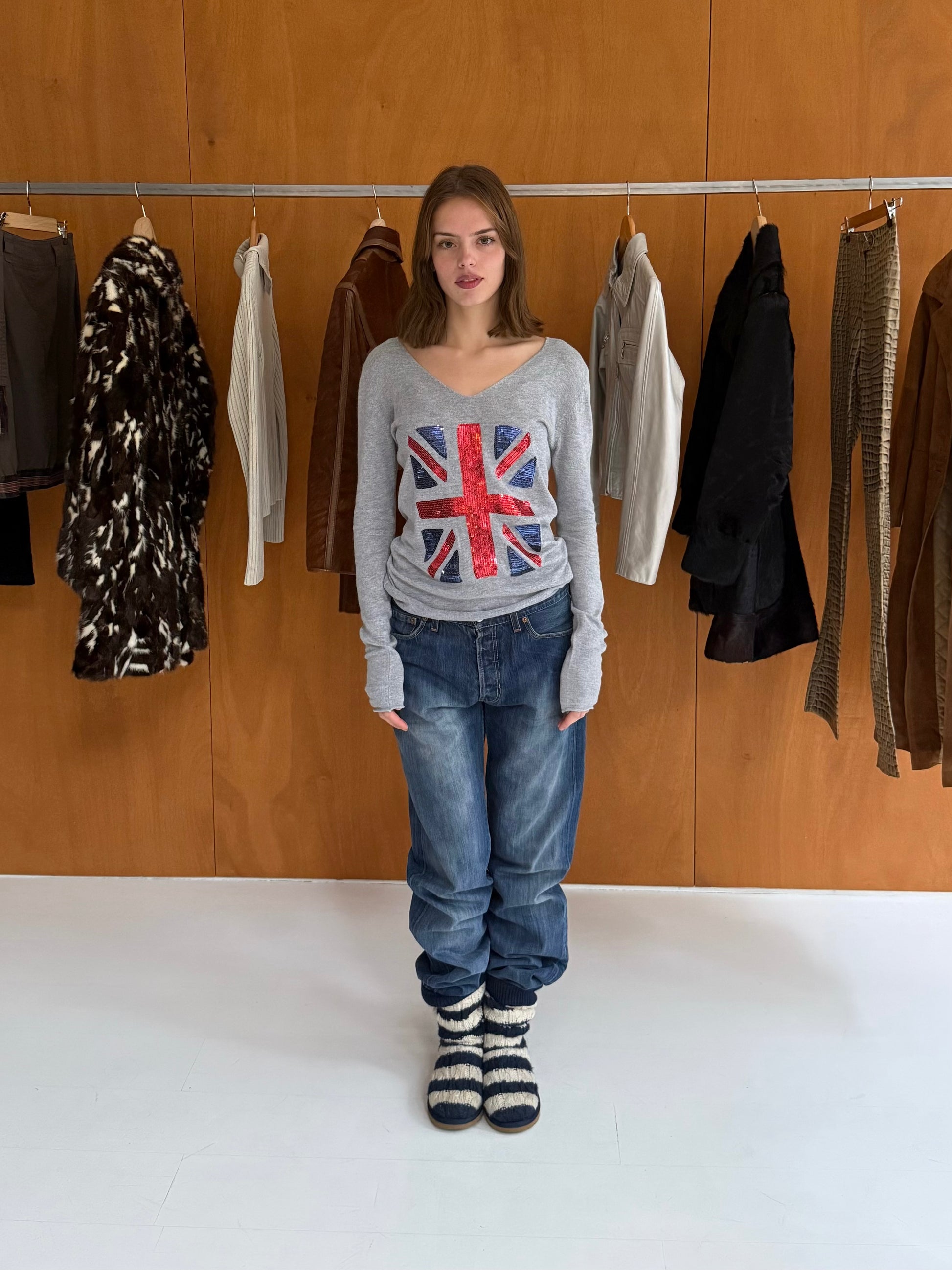 Grey top with sequin UK flag print. Fits sizes XS-M.