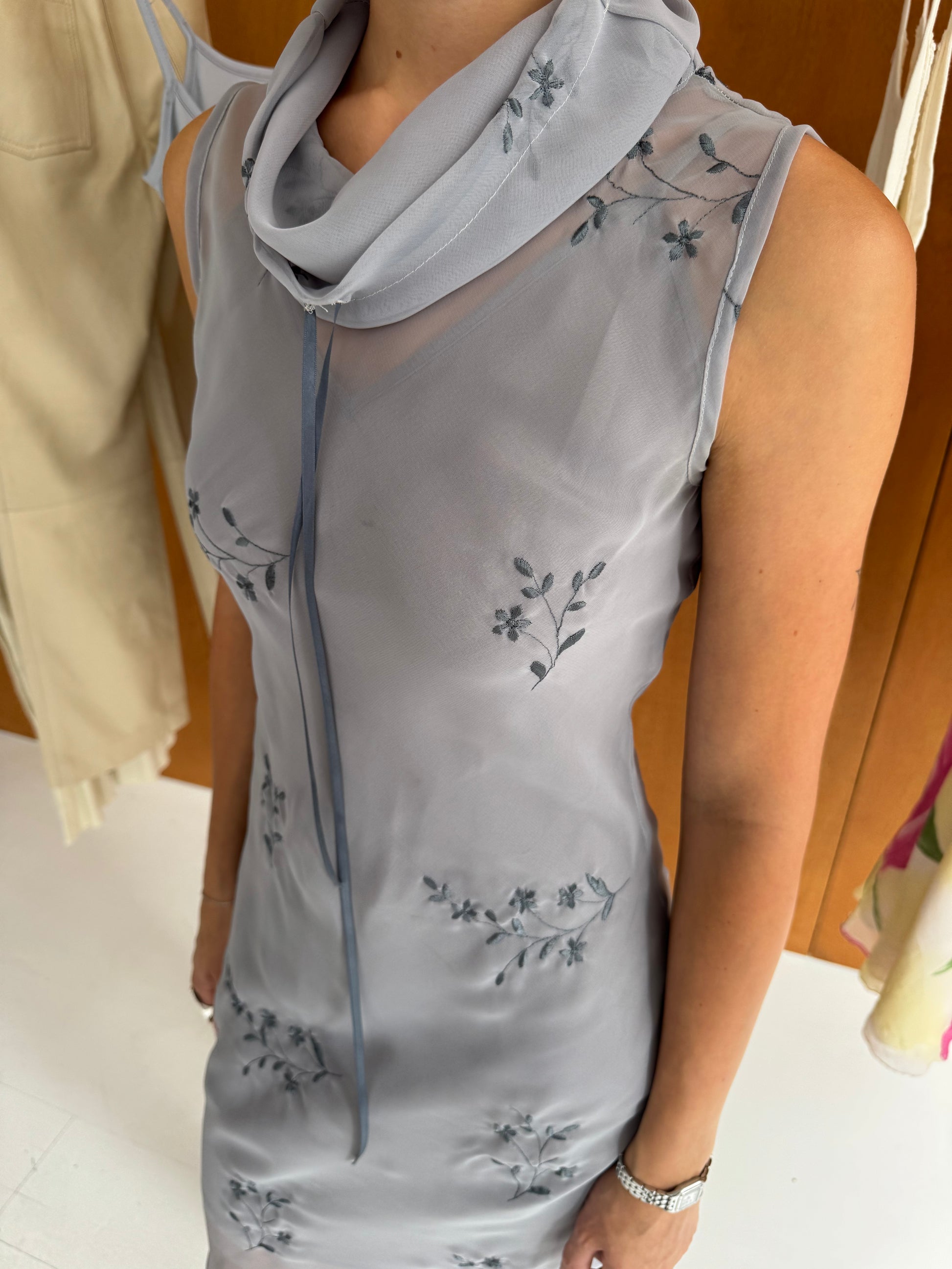 Sheer midi floral dress in grey. Fits sizes XS-M.