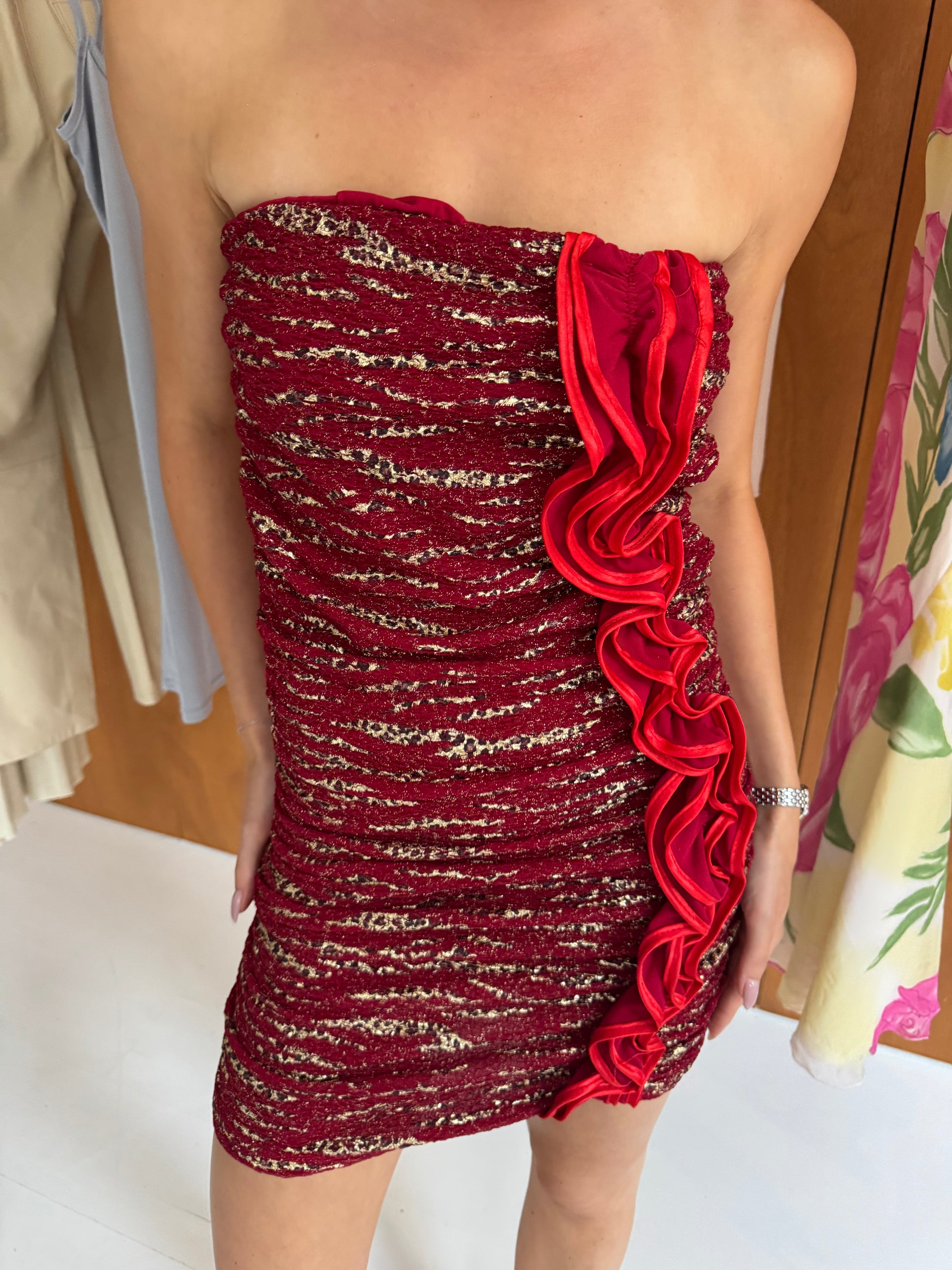 Strapless mini dress in red & leopard print. Fits sizes M-L (is a bit wider than it looks on the model)