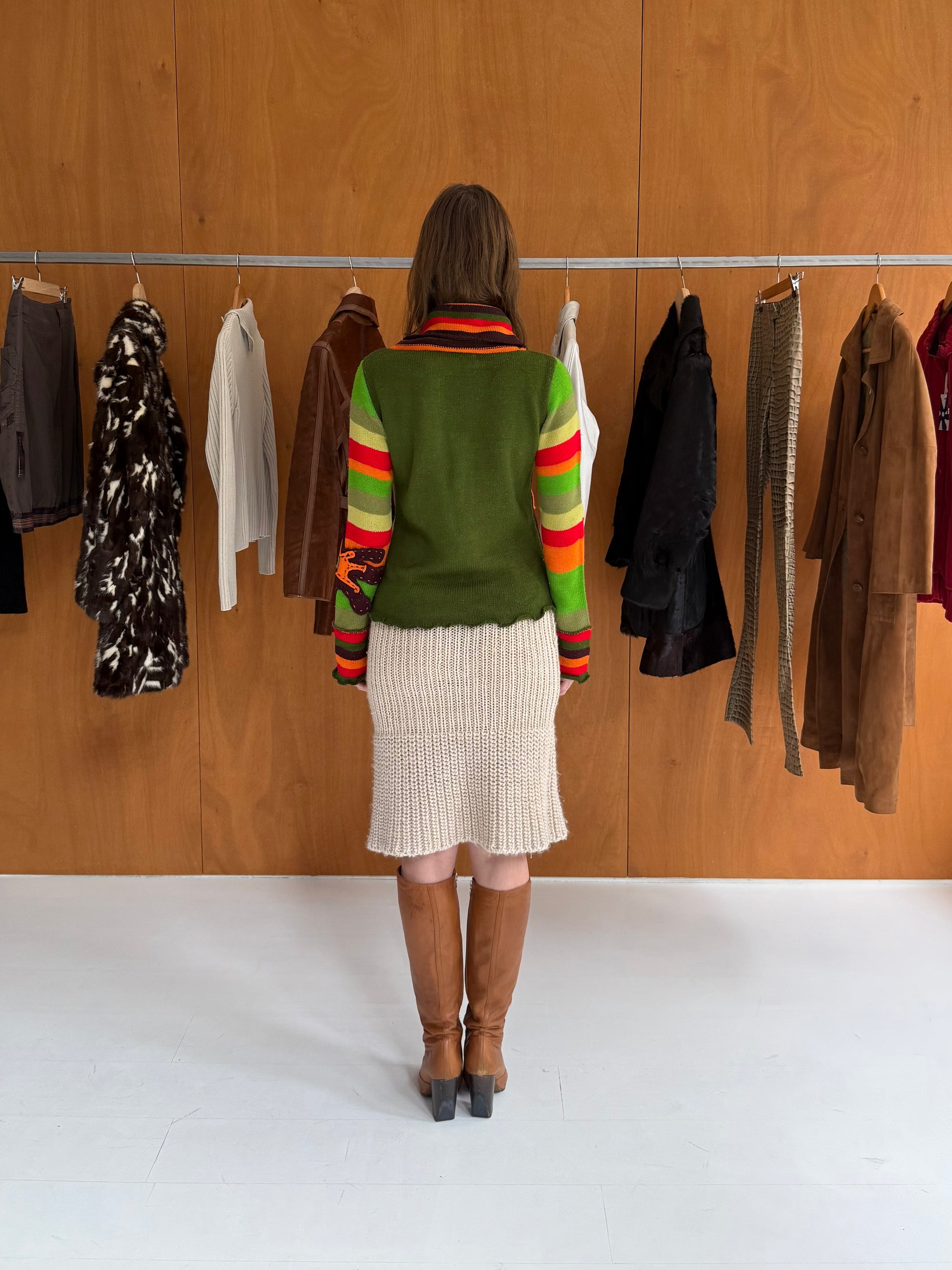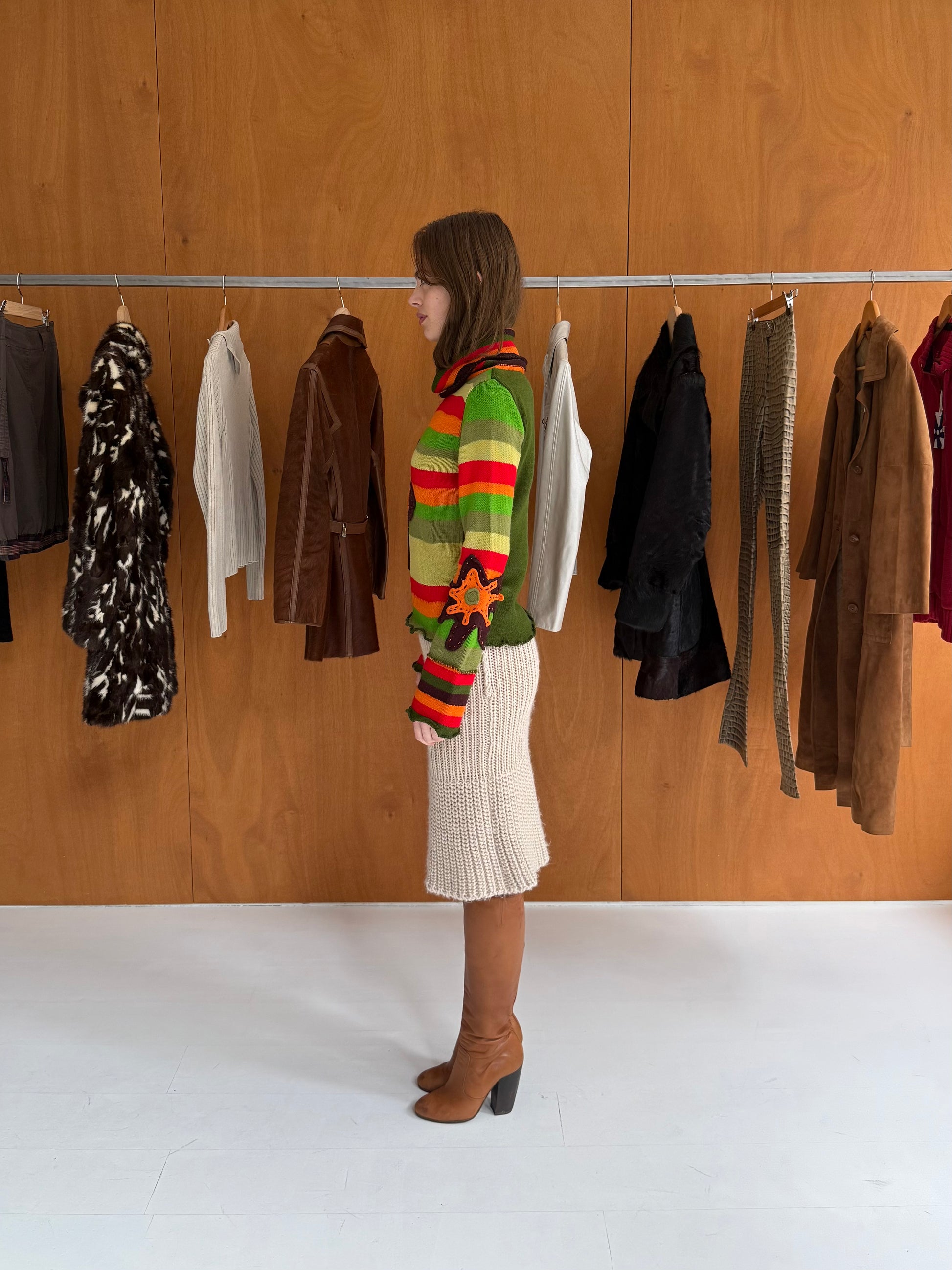 Multicolored striped flower sweater. Fits sizes XS-M.