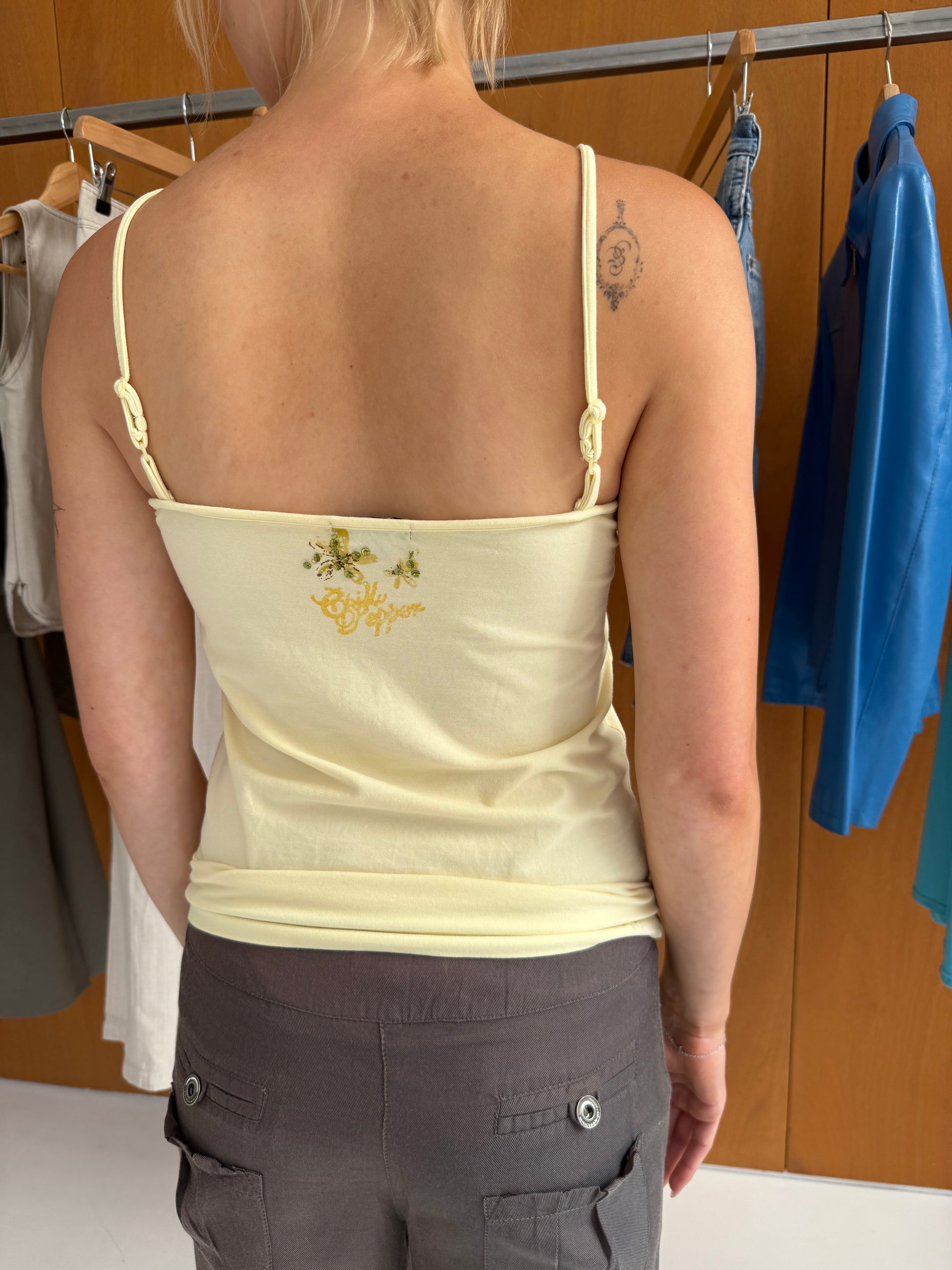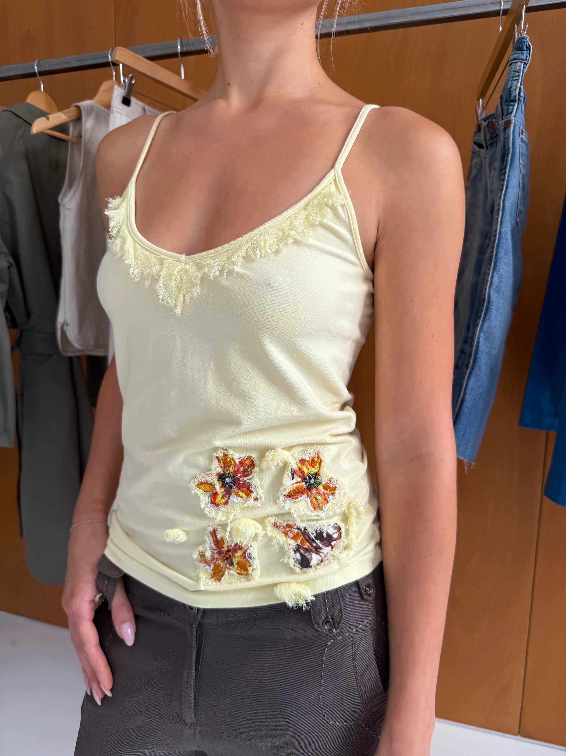 Tank top with floral patches in yellow. Fits sizes XS-M