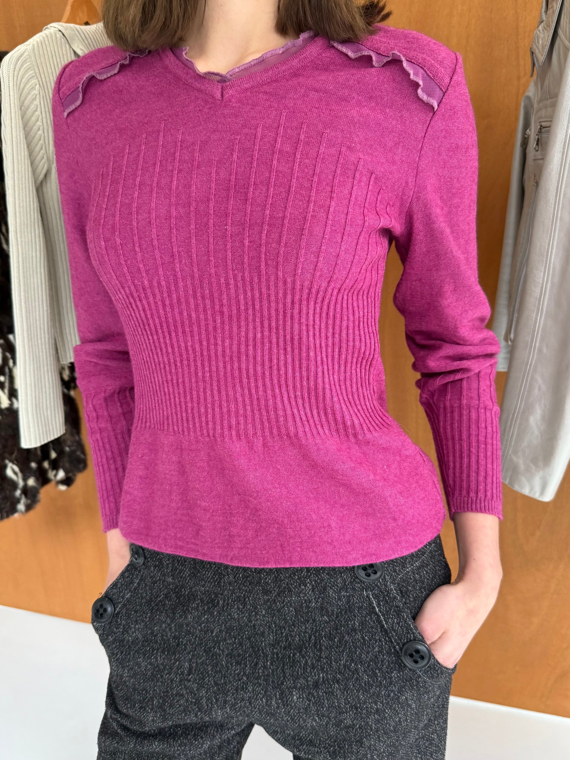 Knit top in pink/purple. Fits sizes XS-S.