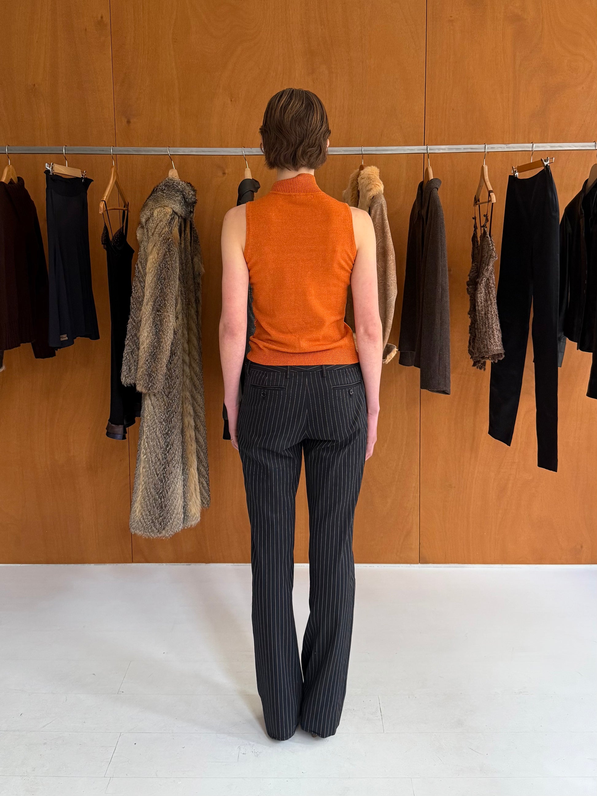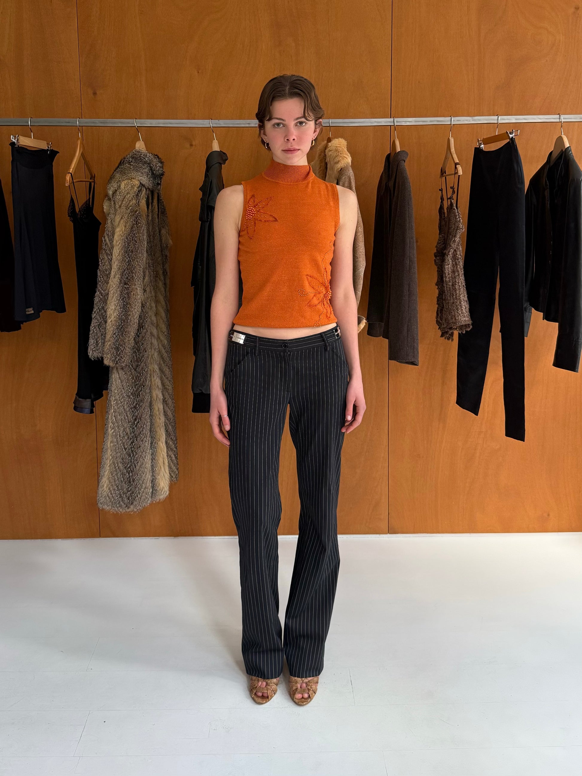 High-neck top with beading details in orange. Fits sizes XS-M, has some stretch.
