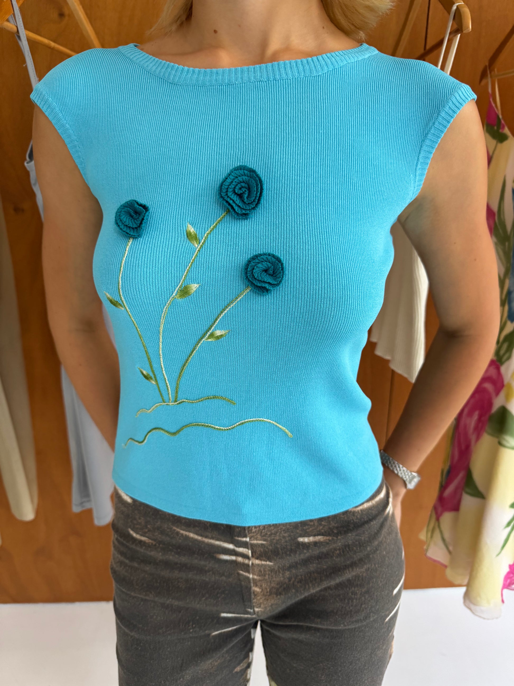Knitted top with flower detail in blue and green. Fits sizes XS-S.