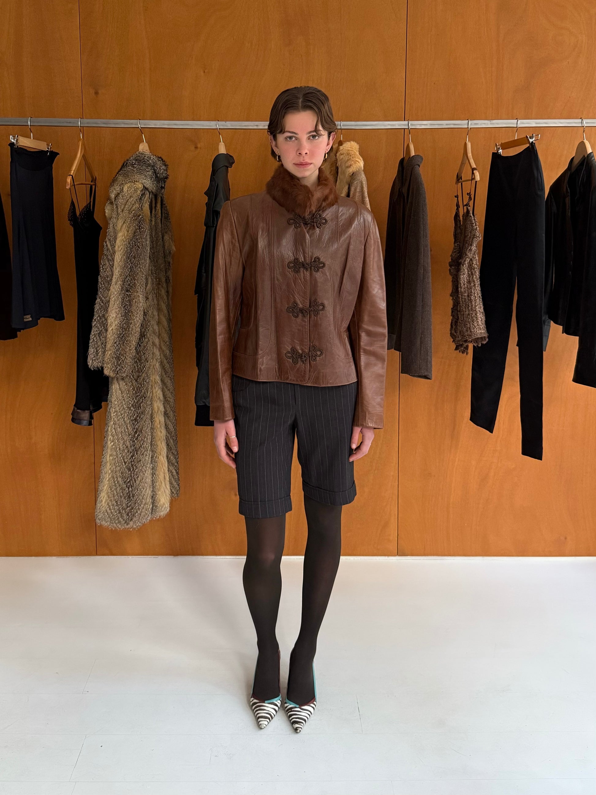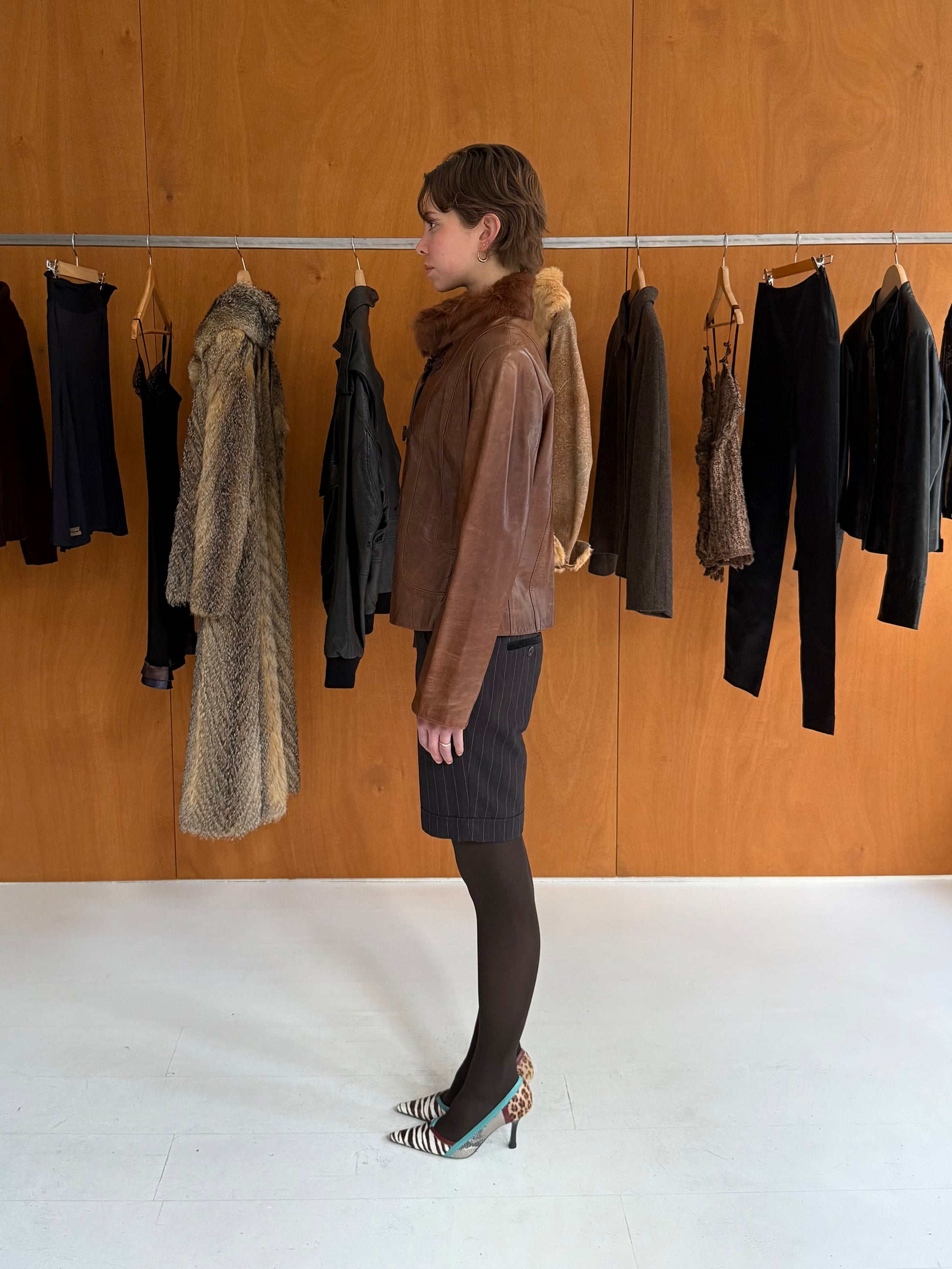 Leather jacket with fur collar in brown. Fits sizes XS-M.