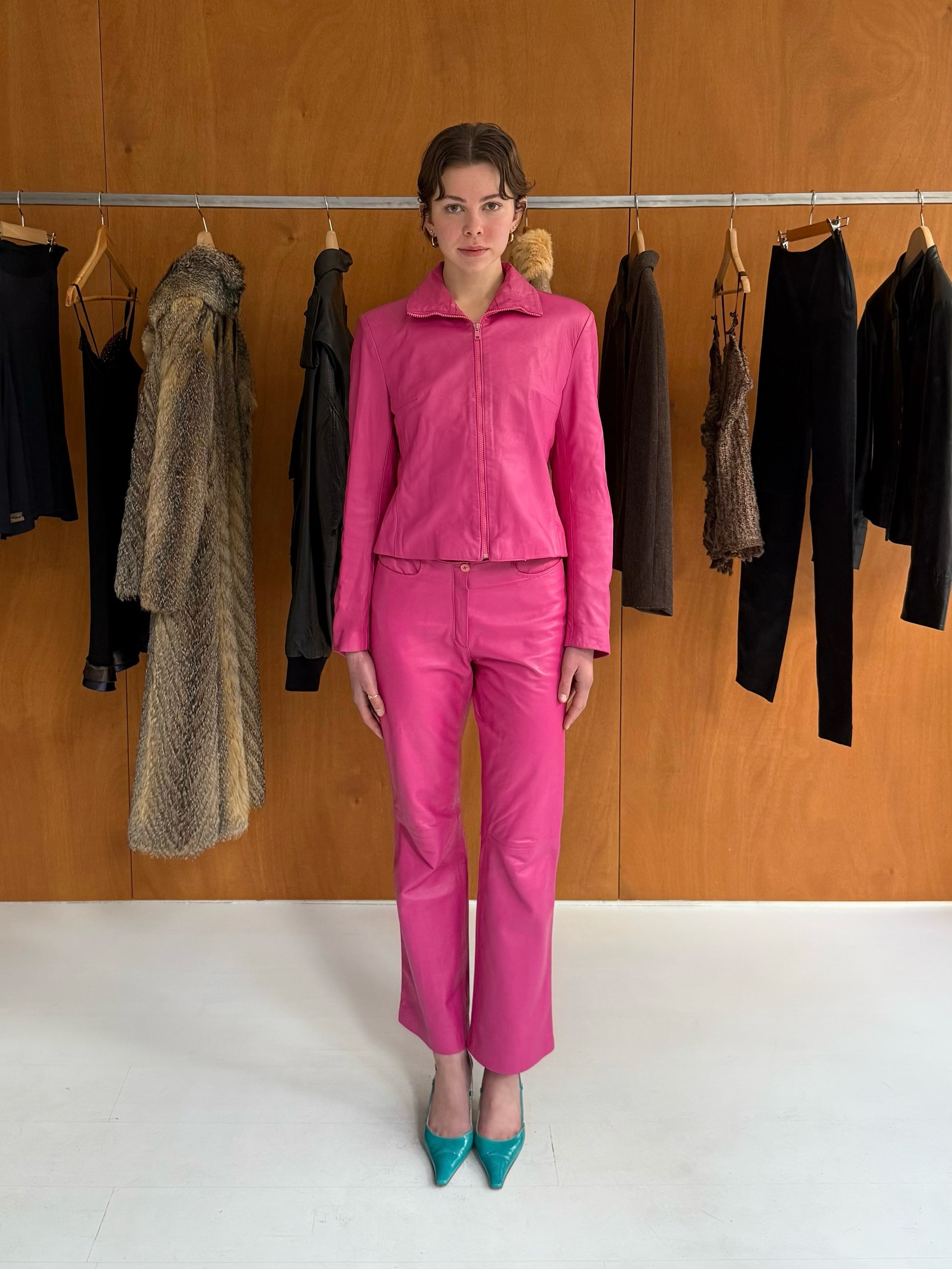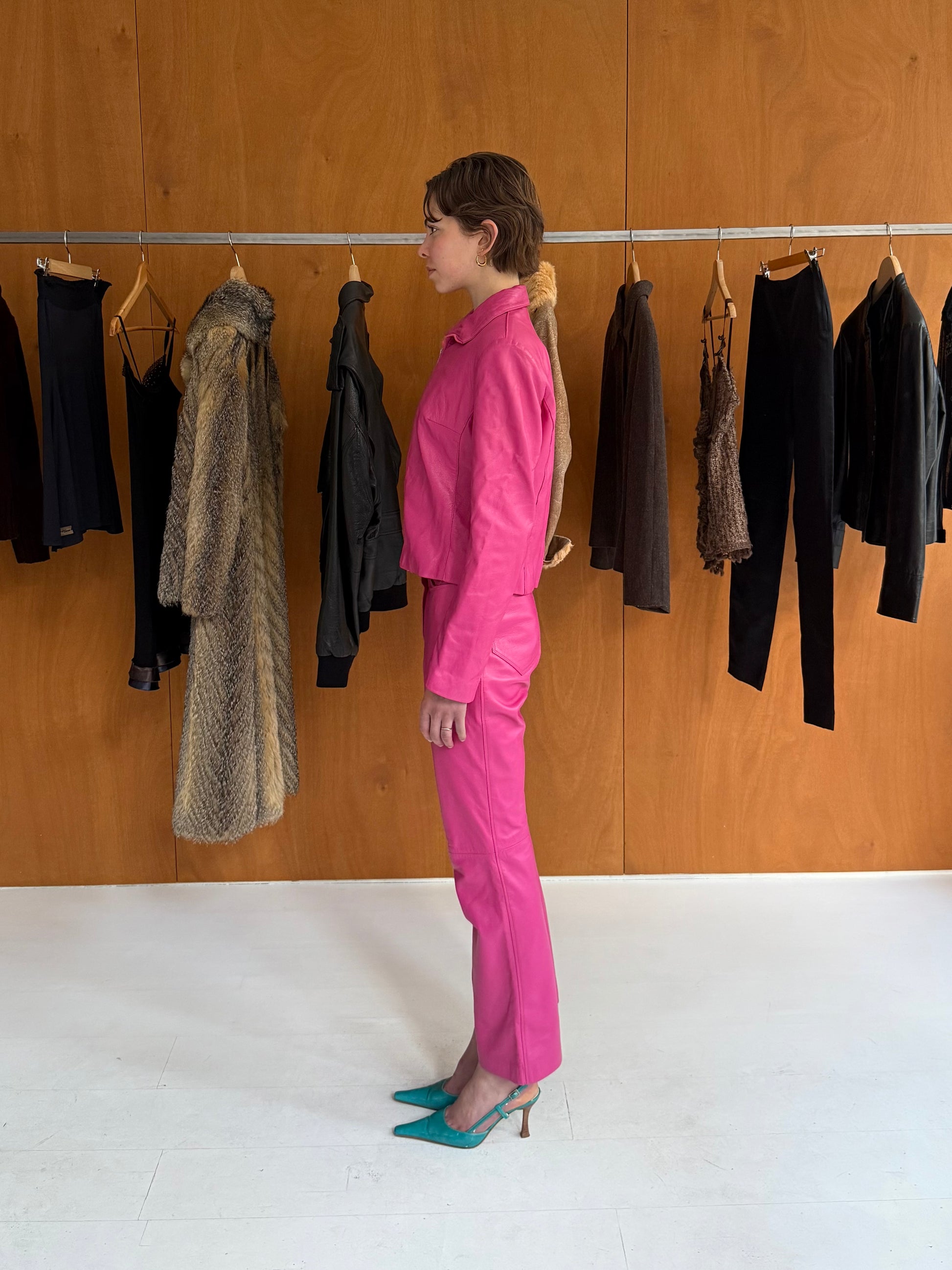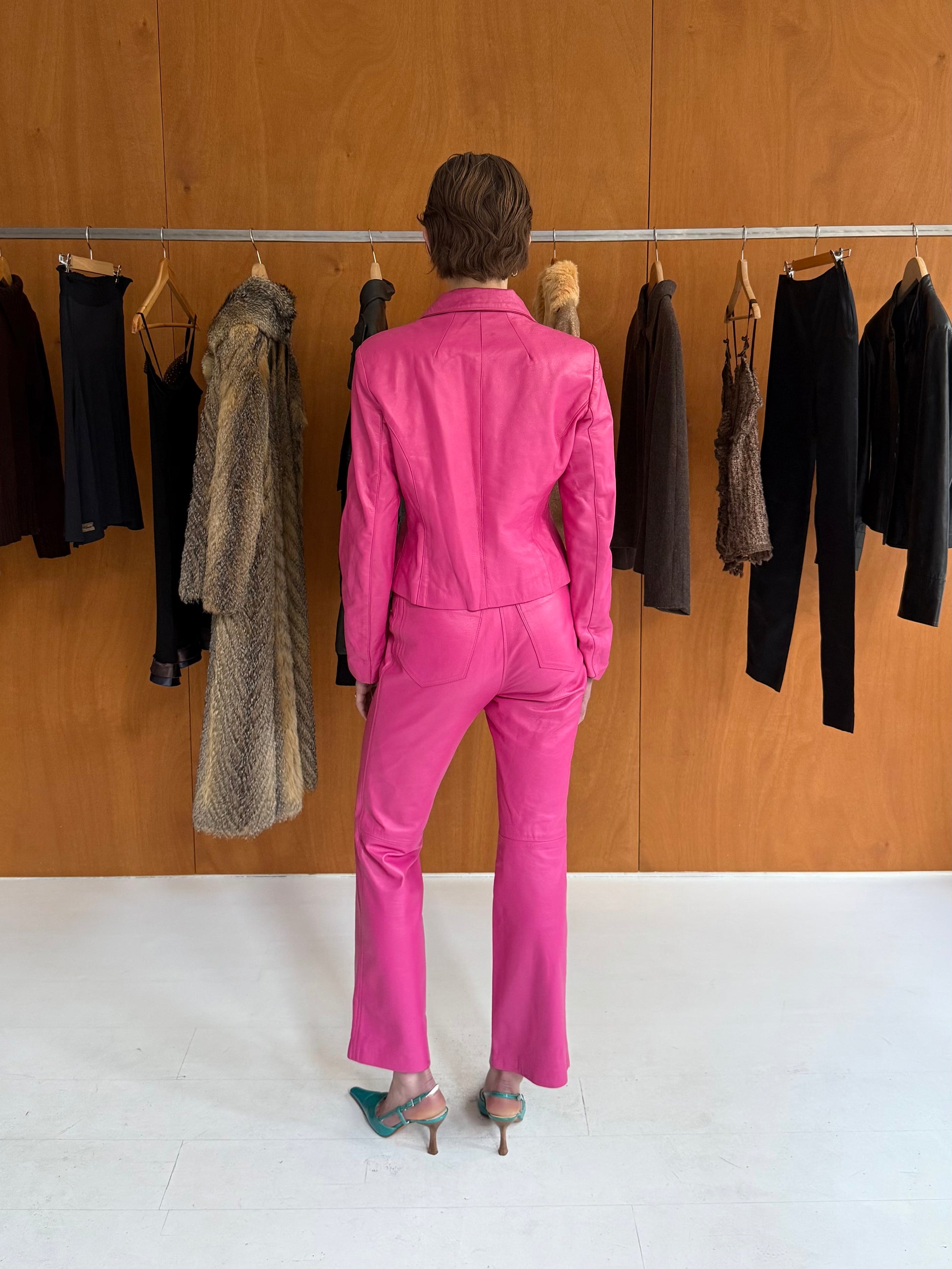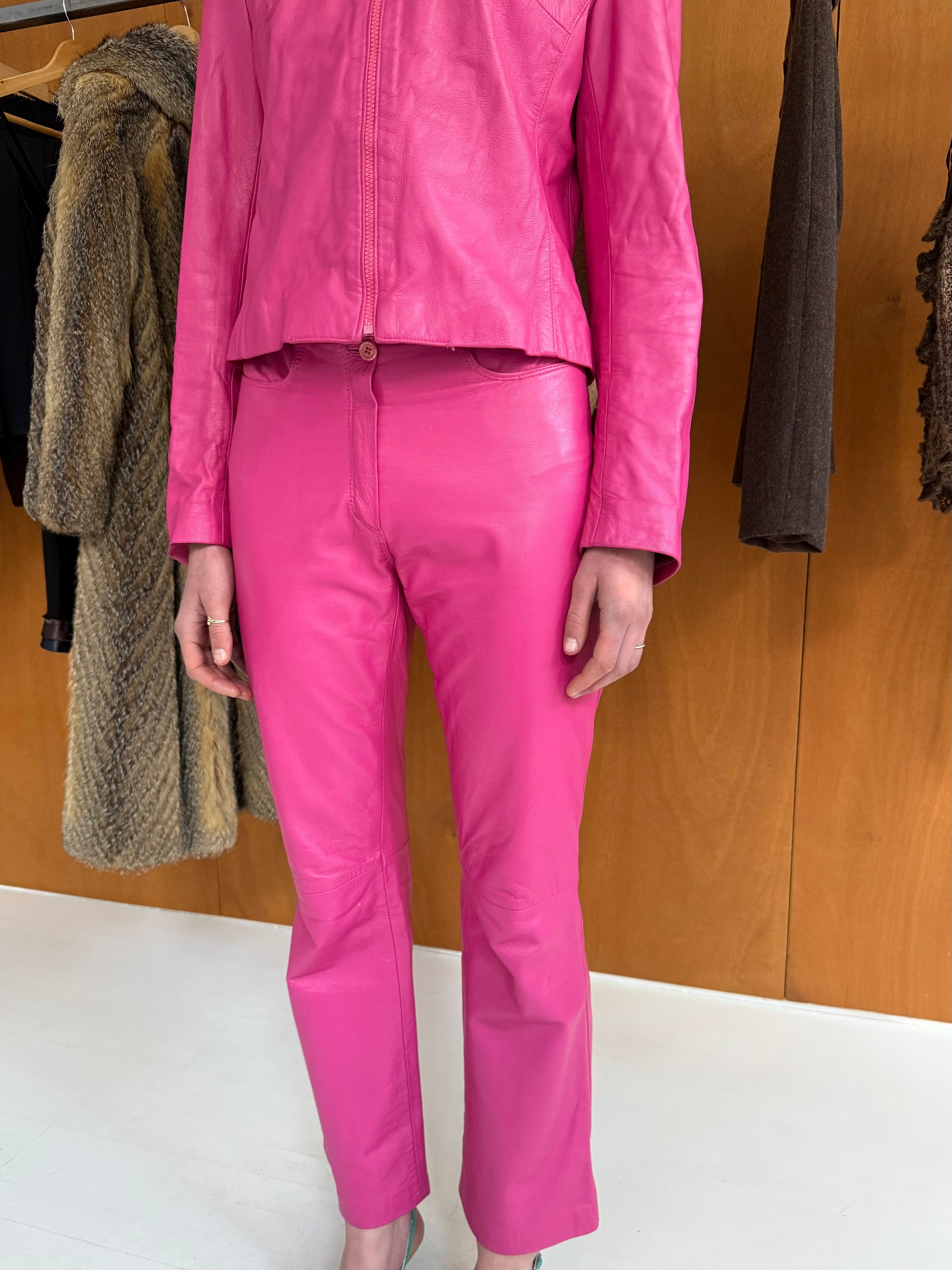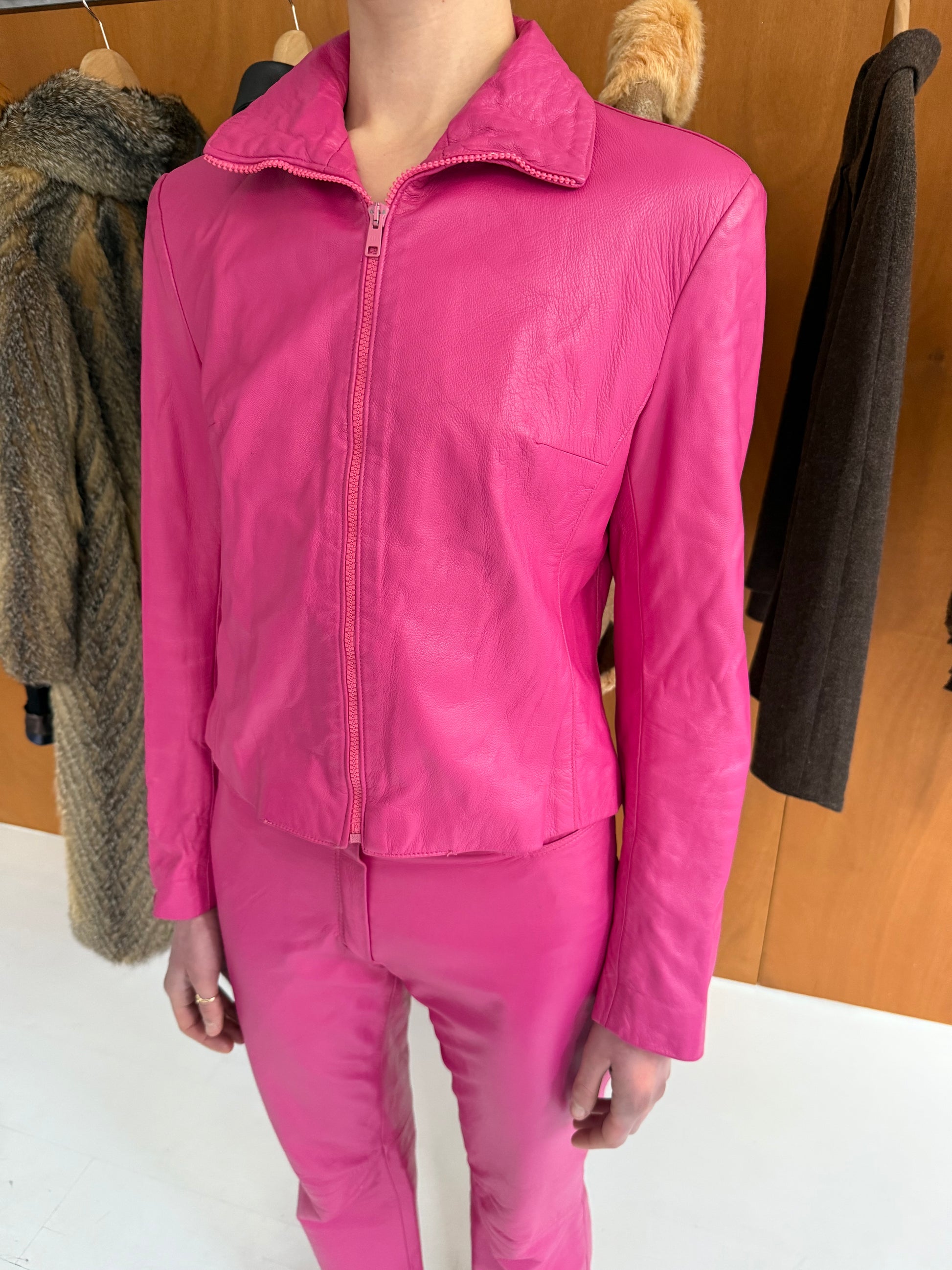 Leather set: jacket + pants in pink. Fits size S. Pants W 37cm L 98cm.