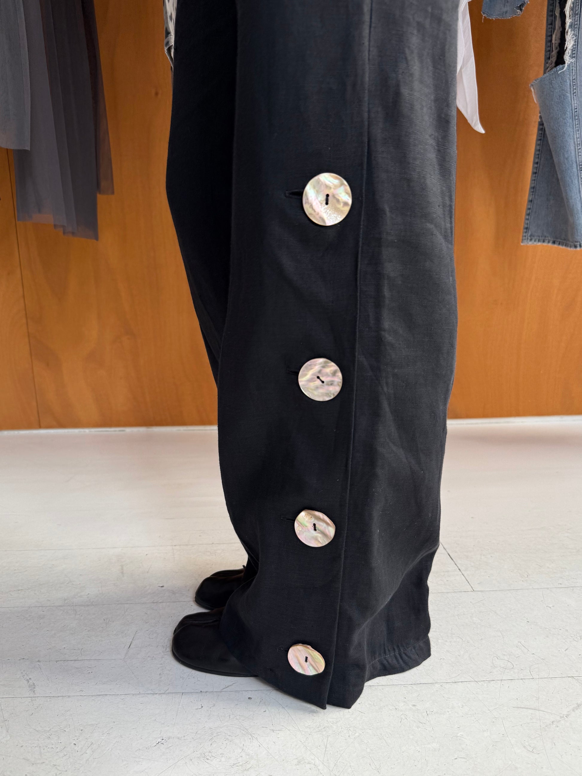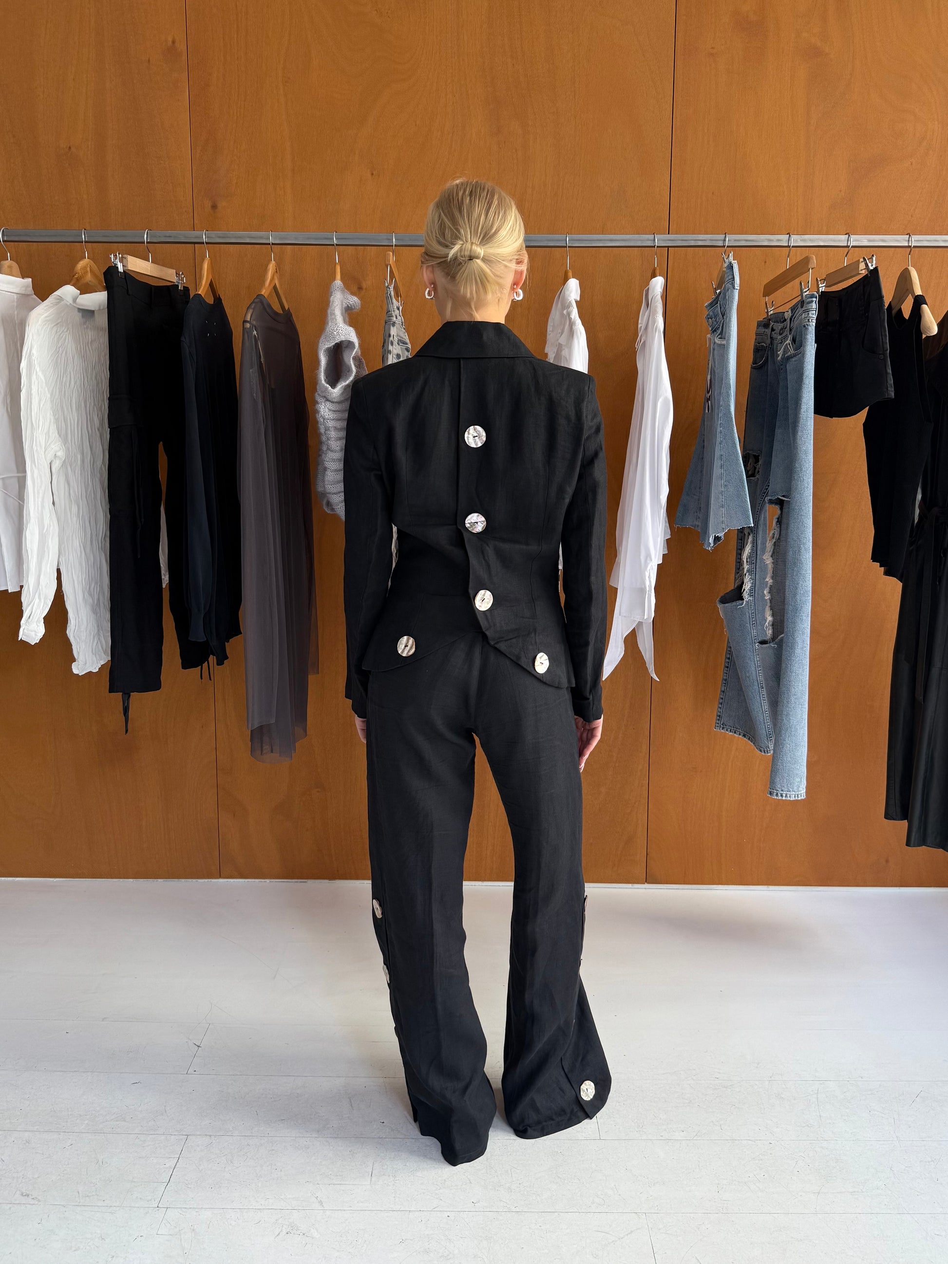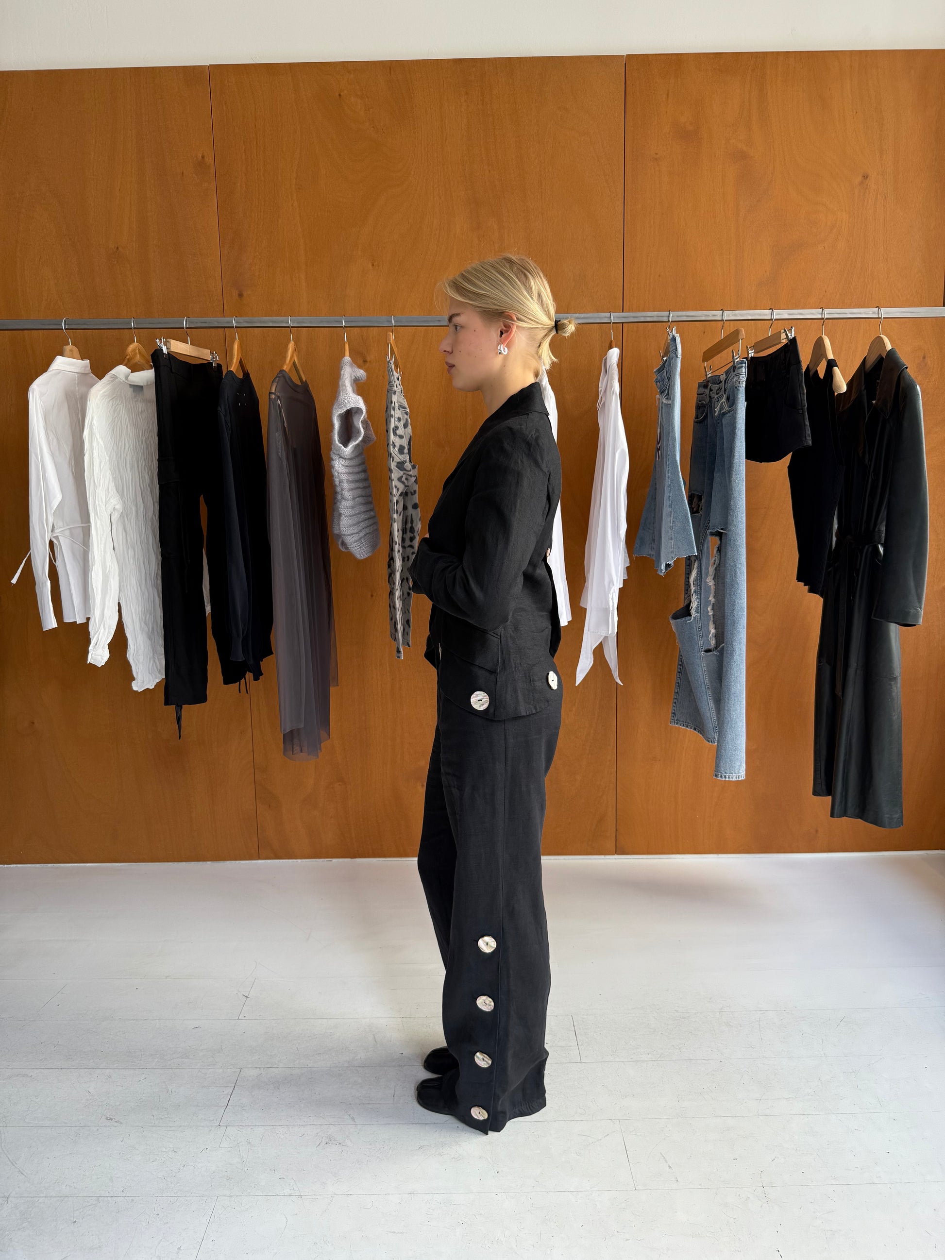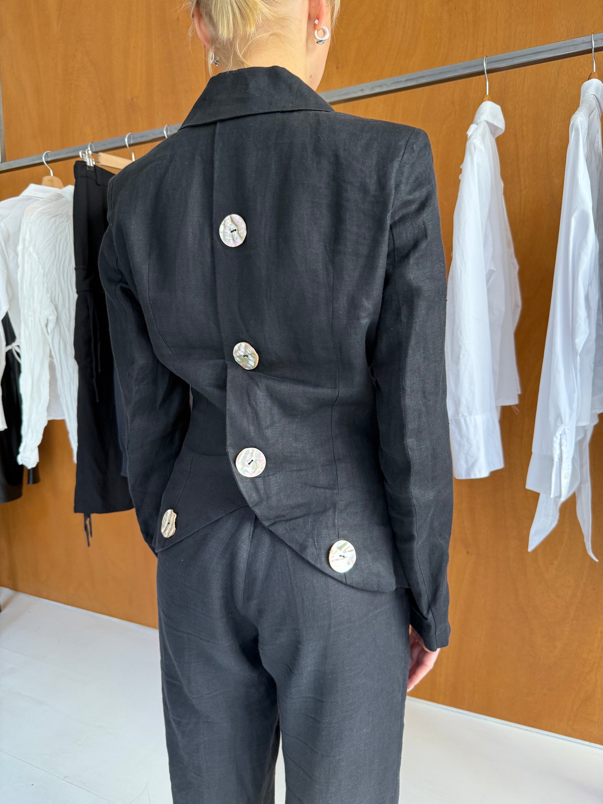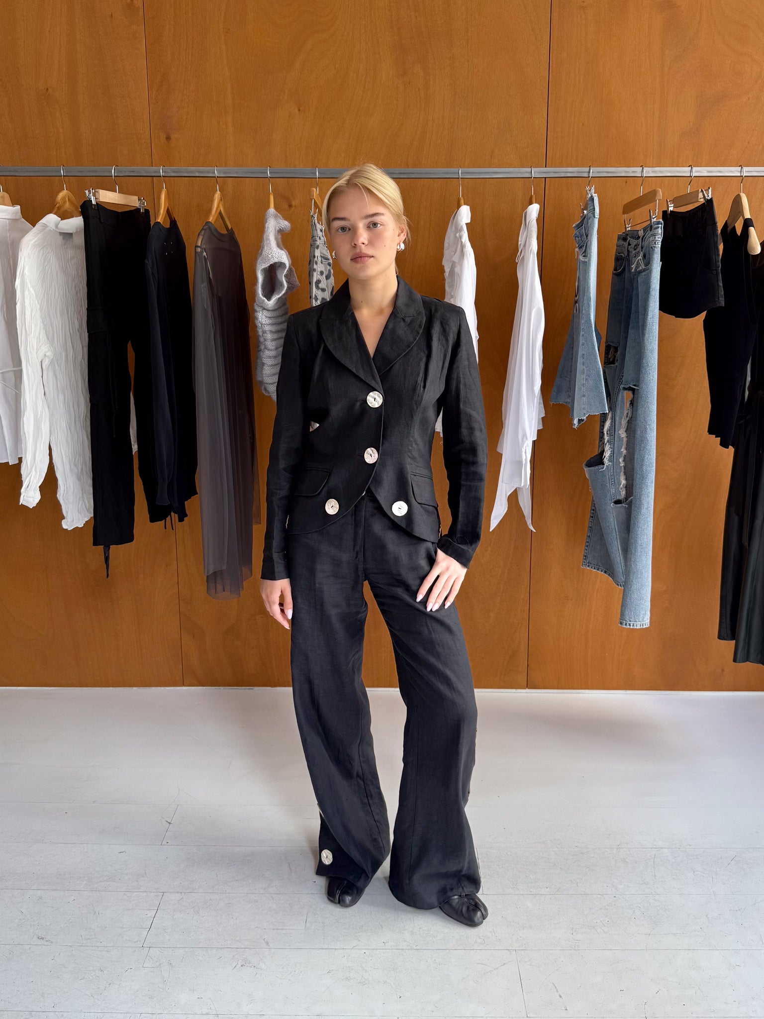 Linen suit in dark blue with pearl colored buttons. Fits size S.