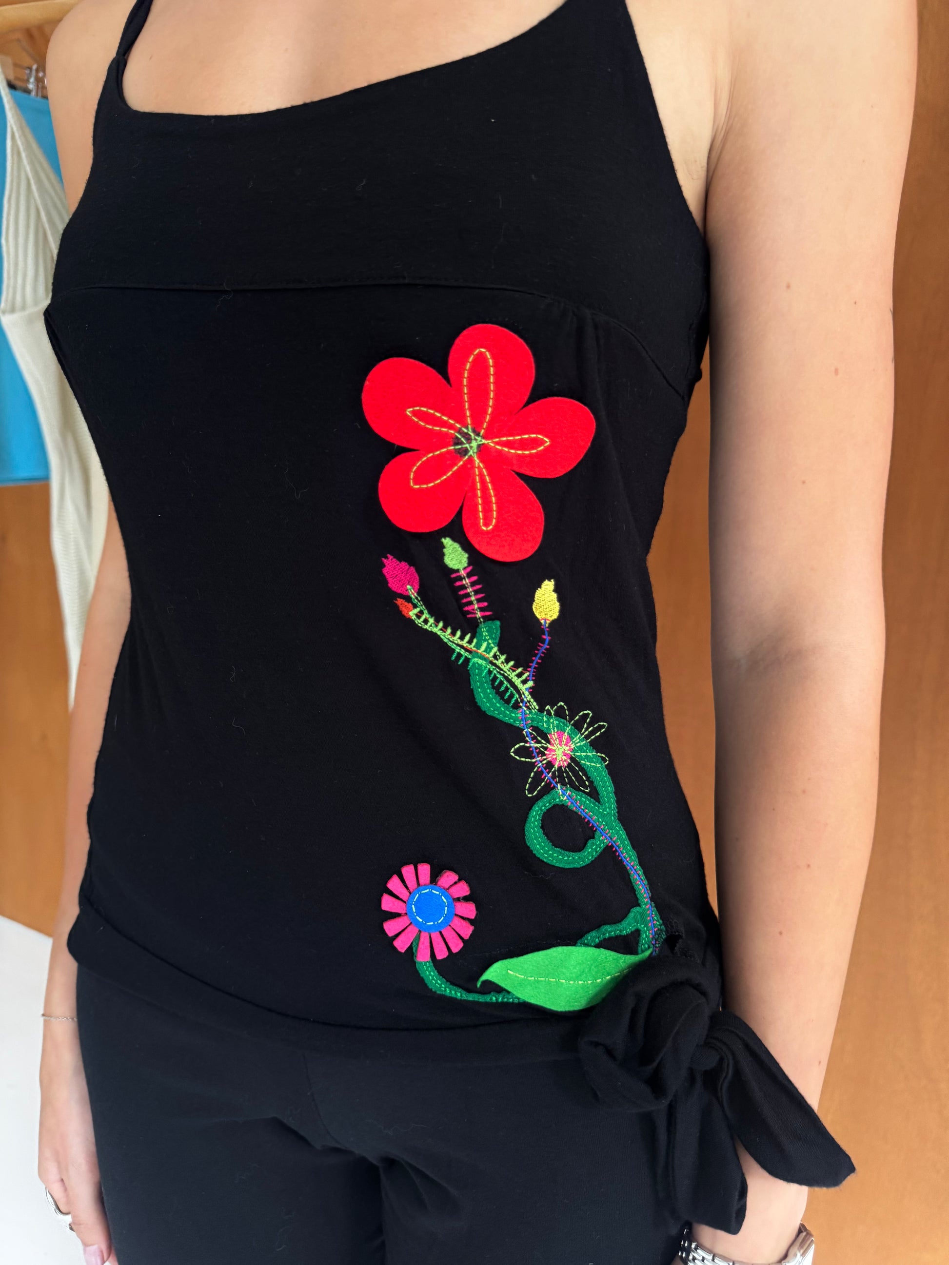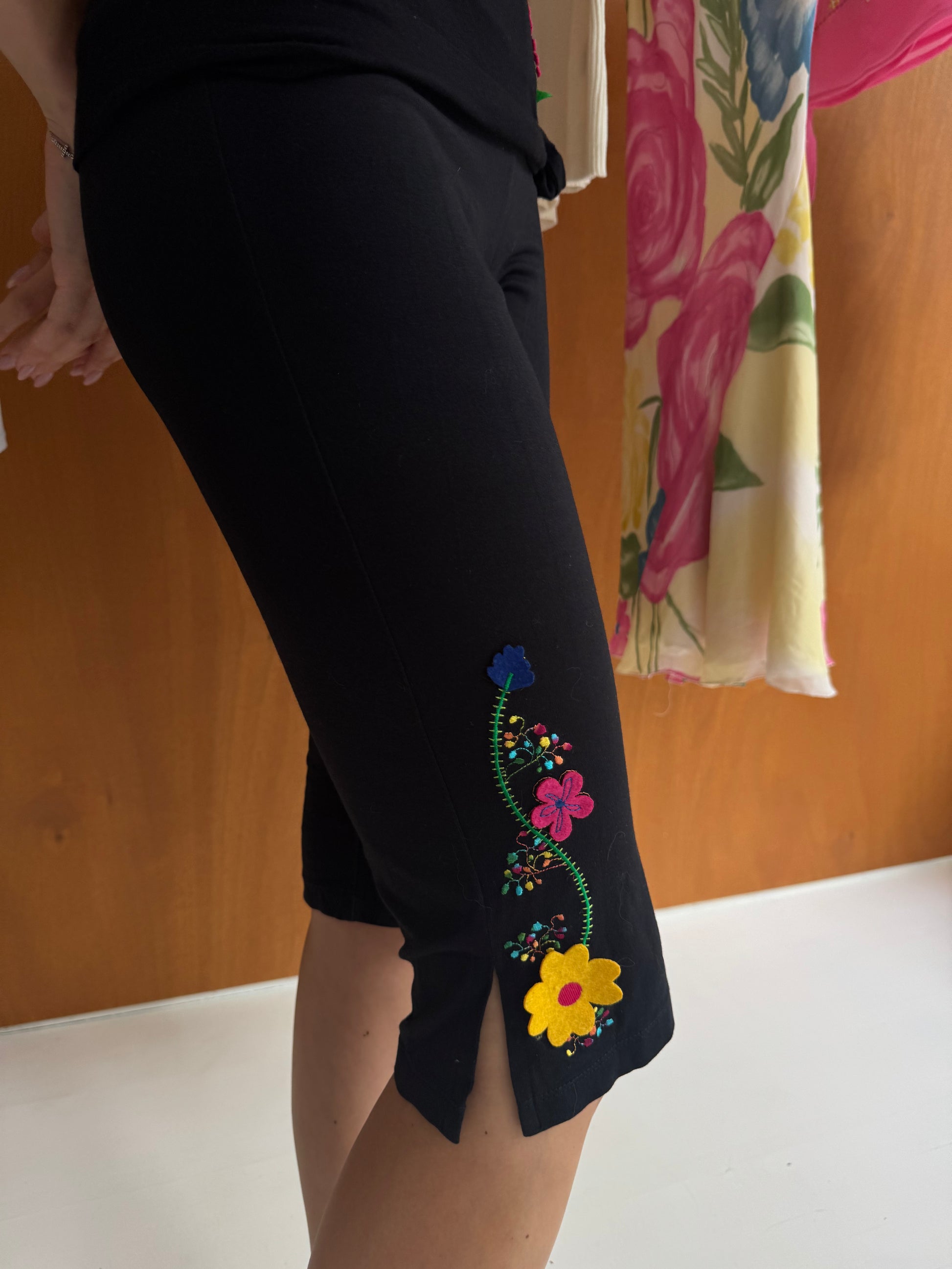Capri pants and tanktop set in black with colored flowers. Fits sizes XS-S.