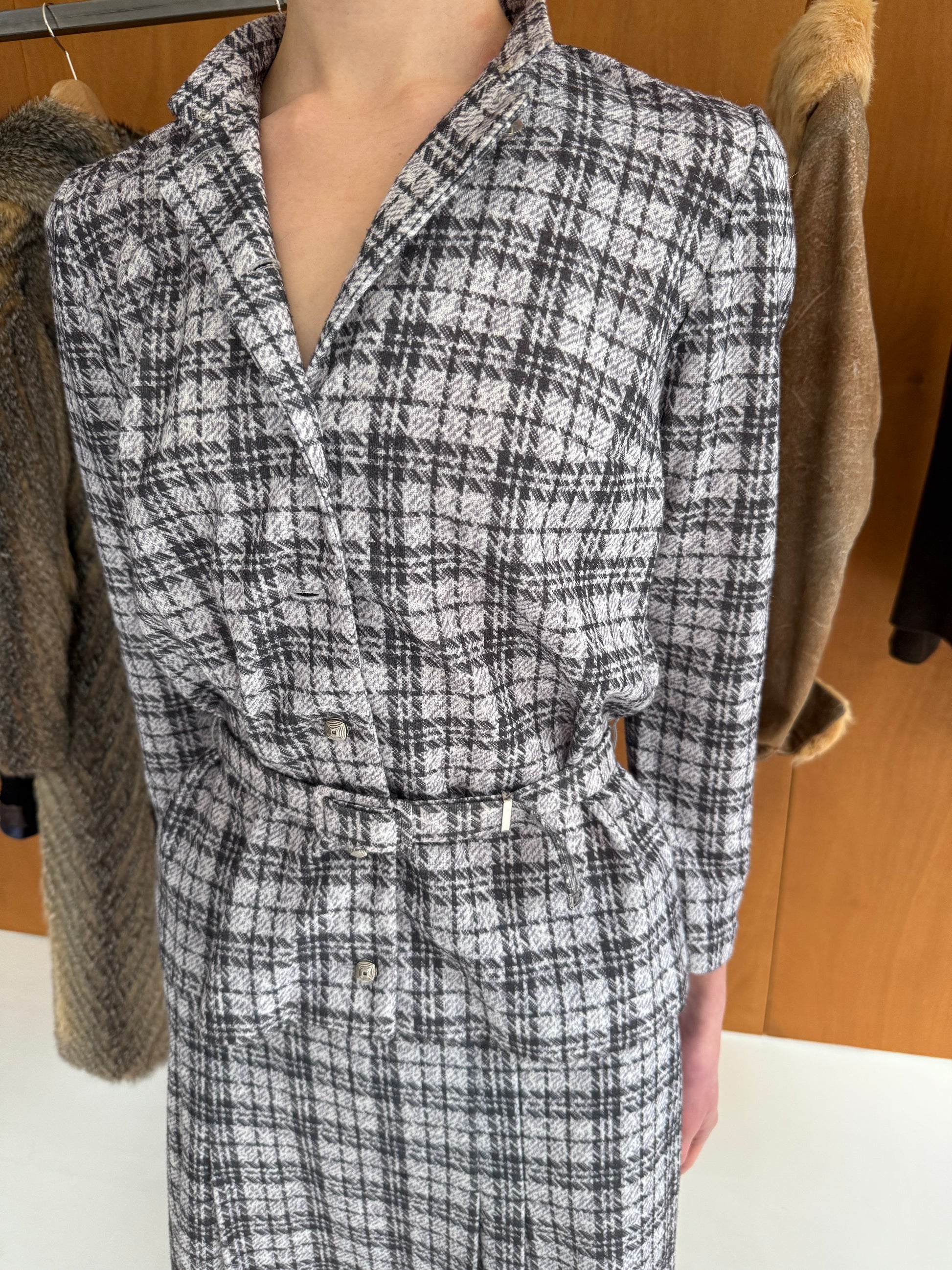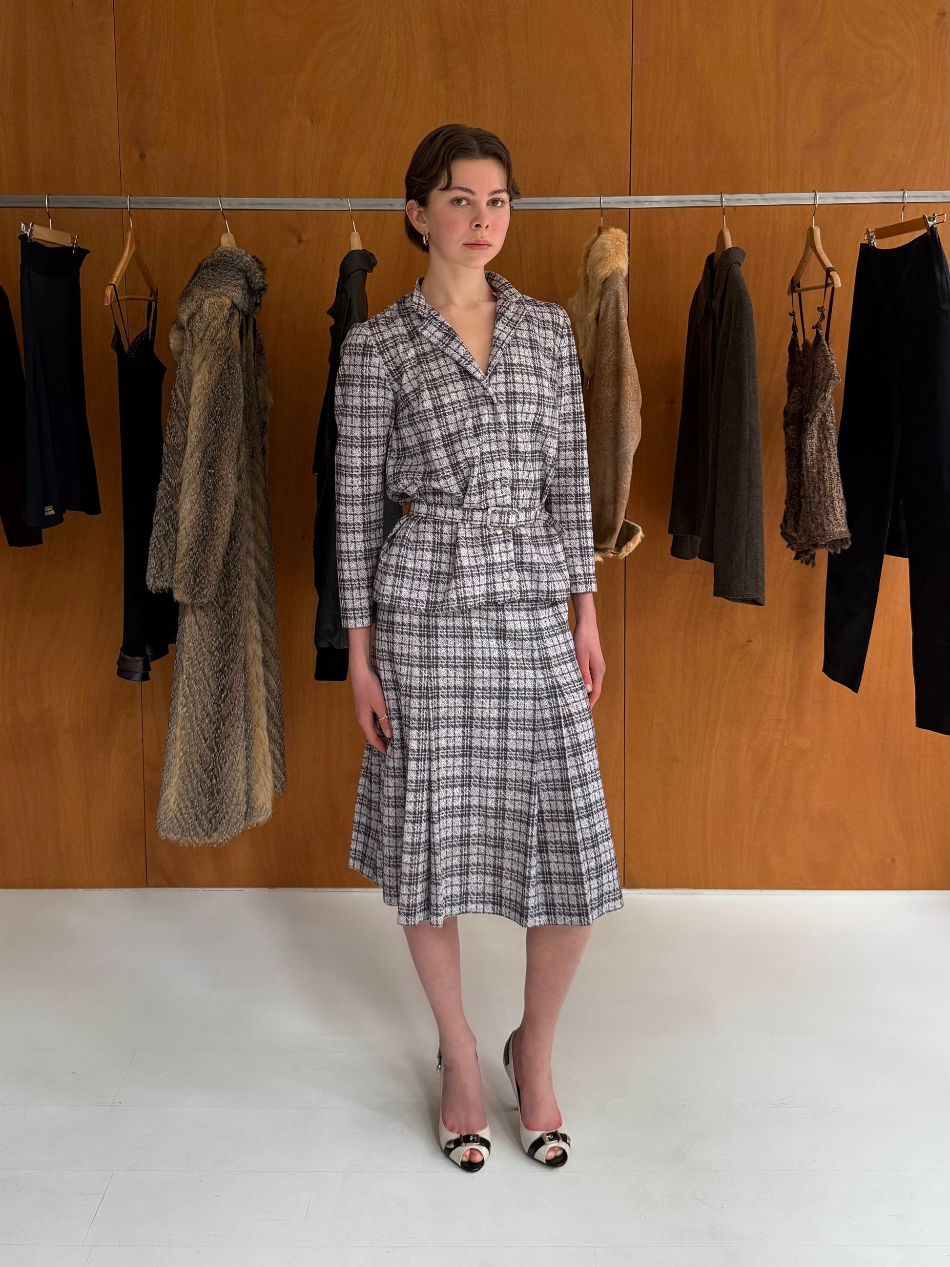 Matching set: chequered jacket + skirt in grey. Fits sizes S-M. Skirt W 34cm L 64cm, has stretch.