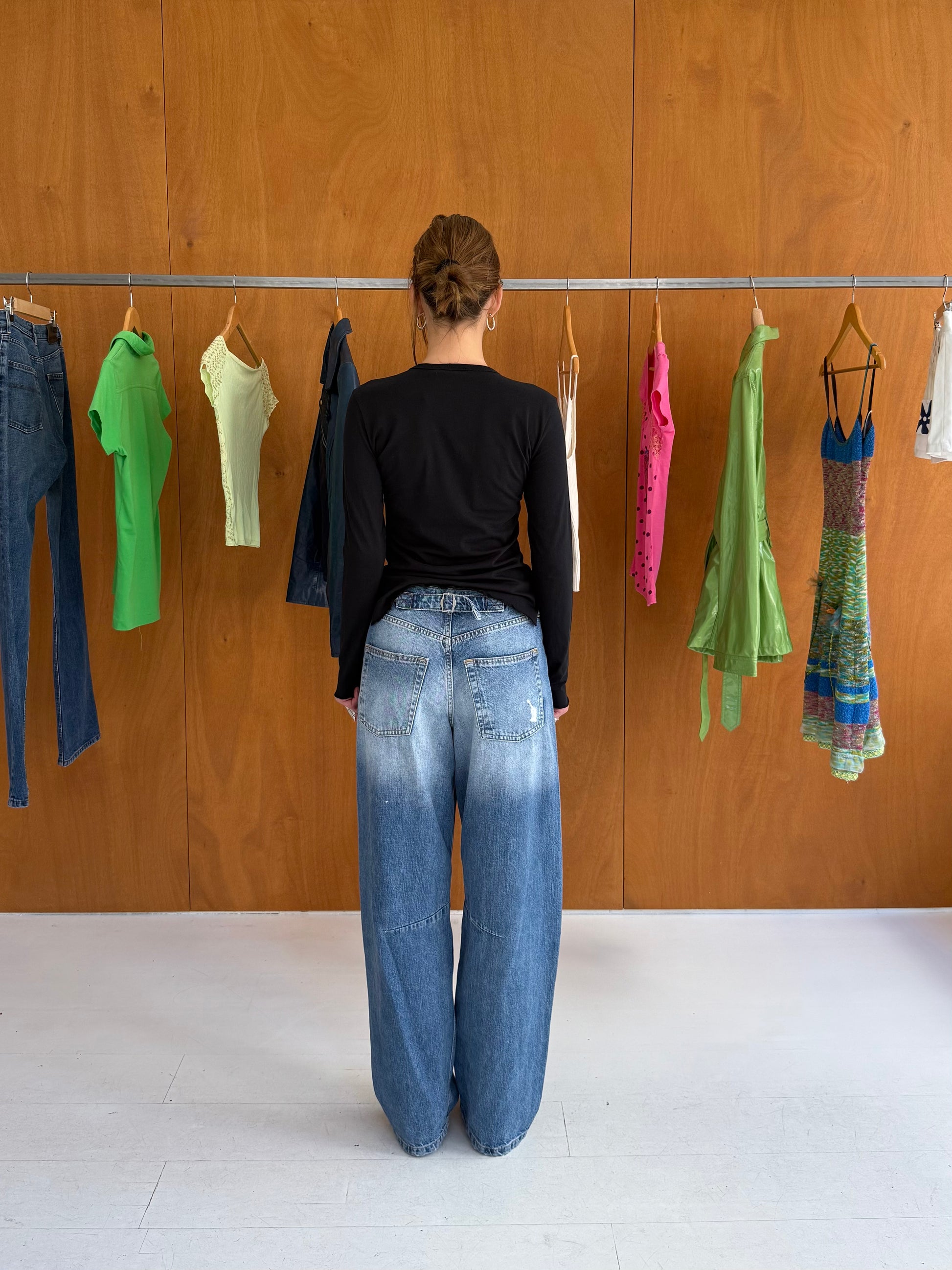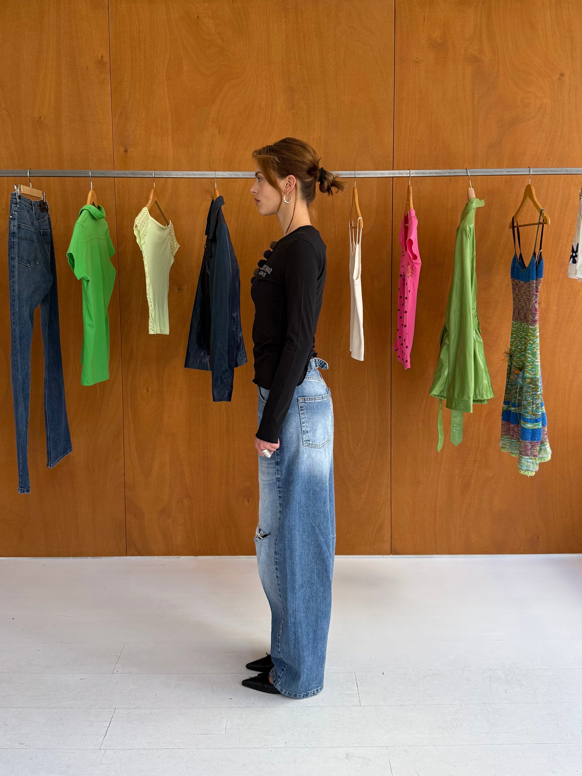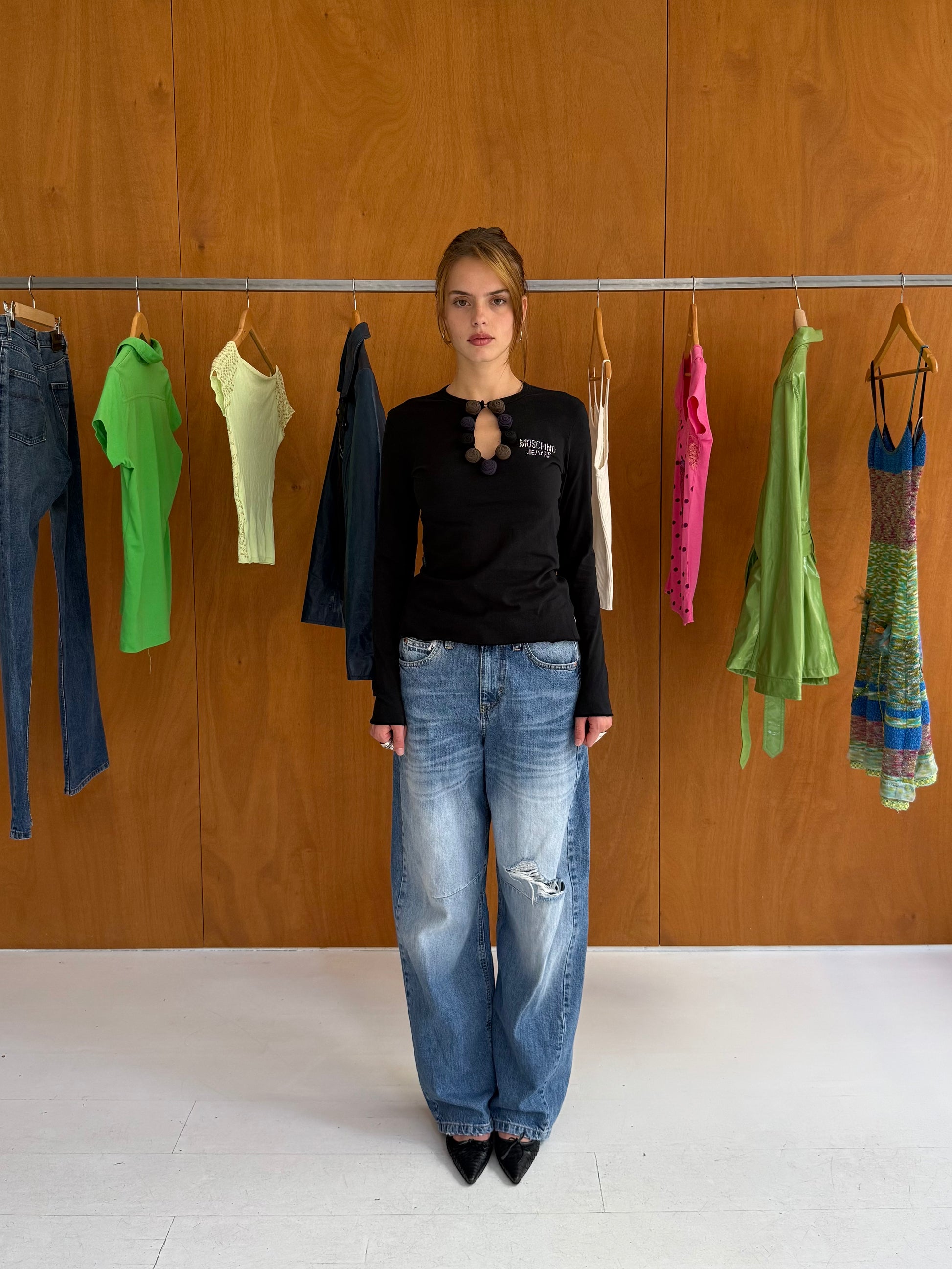 Moschino longsleeve top in black with flower details. Fits sizes XS-S.