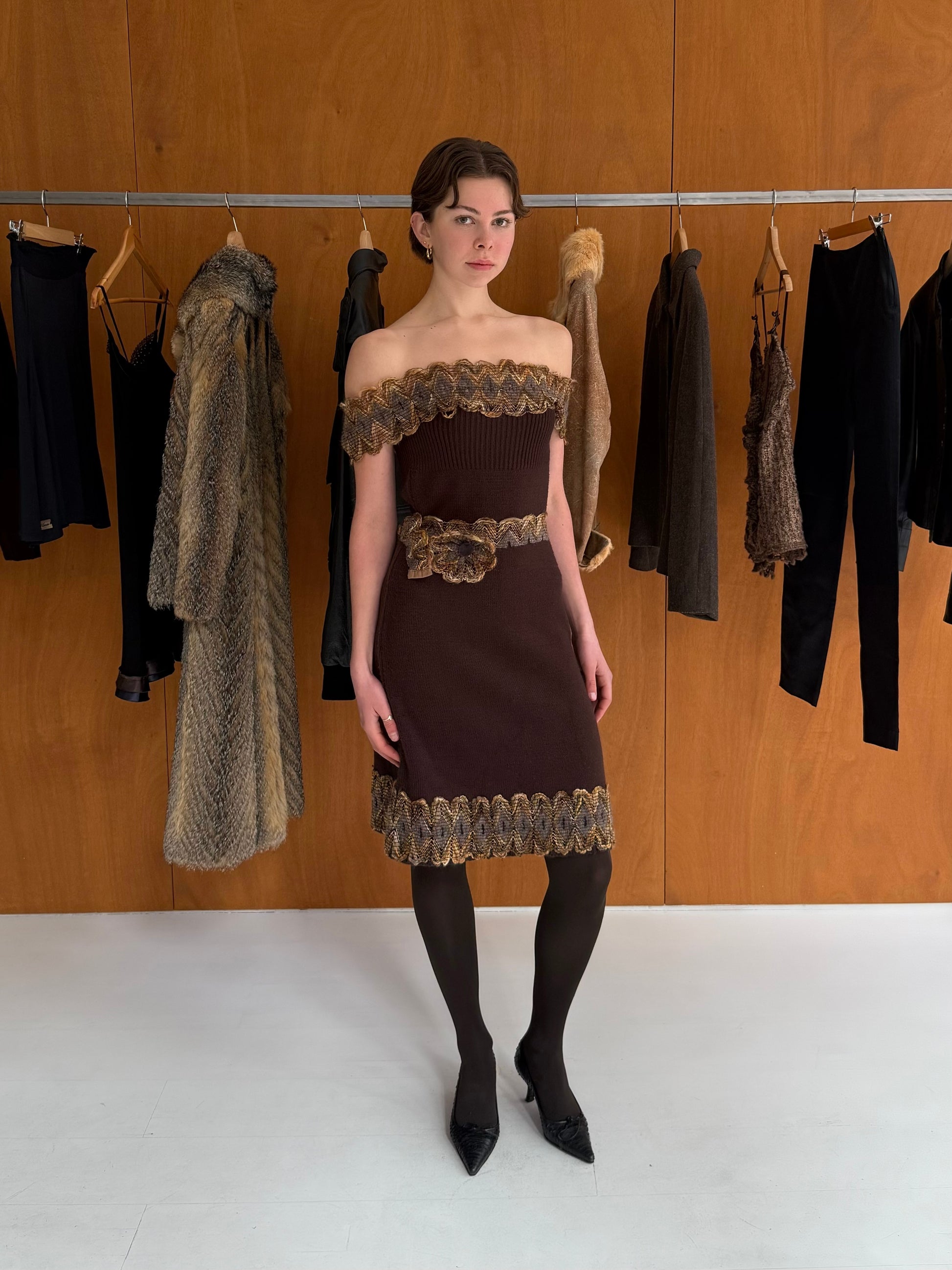 Off-shoulder dress with flower belt in brown. Fits size L.