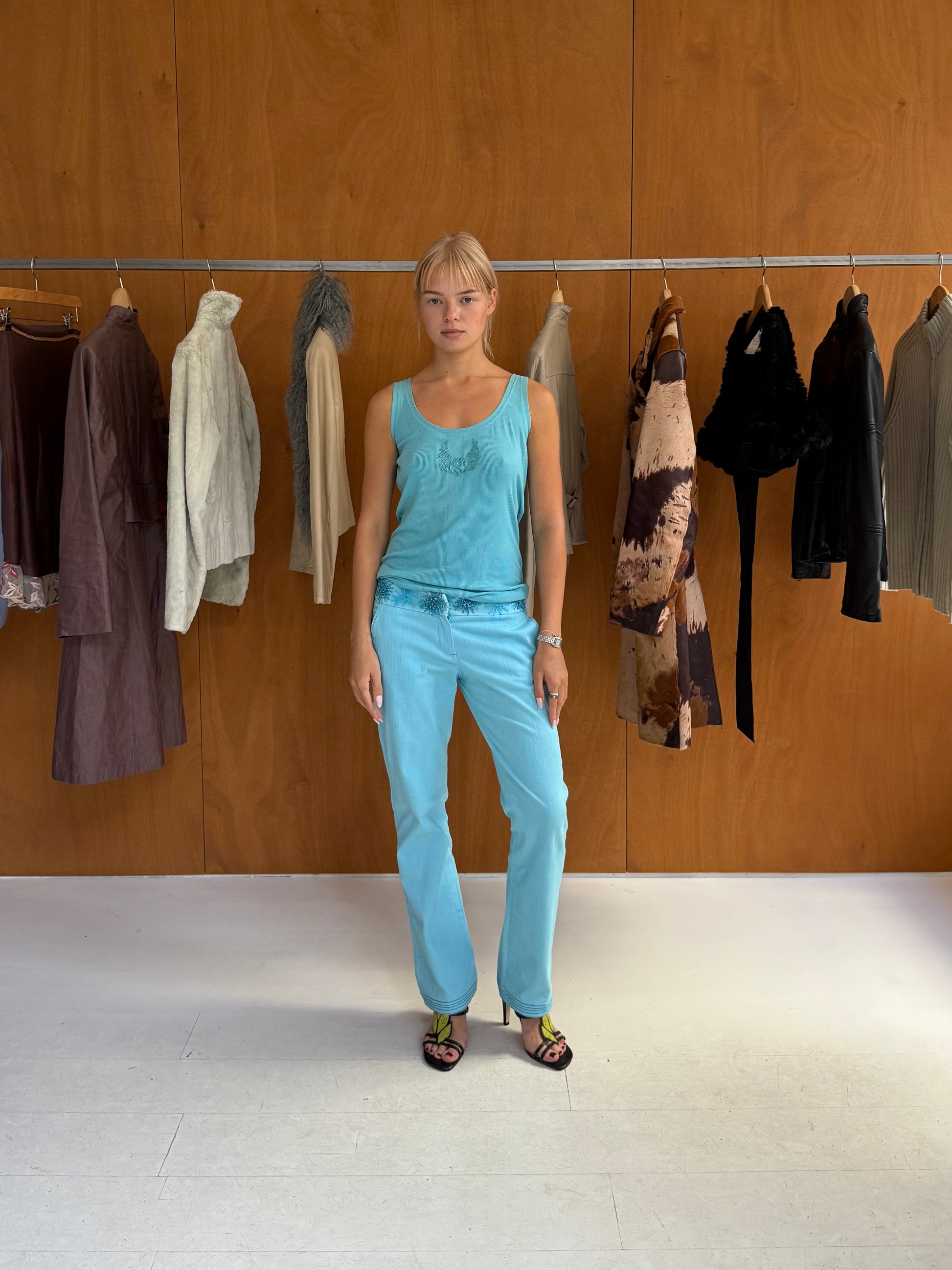 Open-back tanktop with metal detail in blue. Fits sizes XS-L.