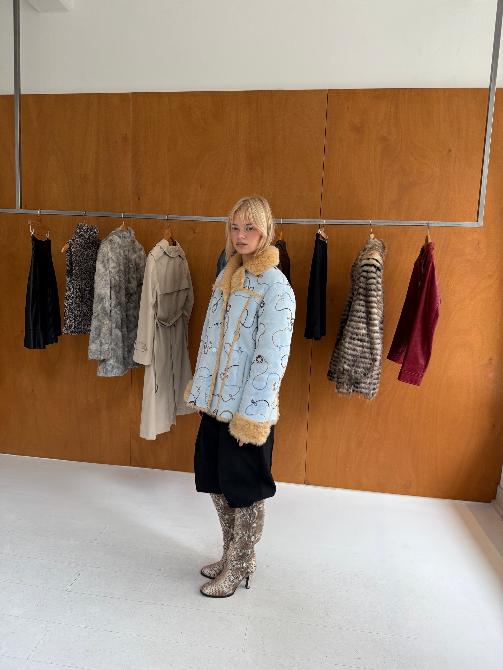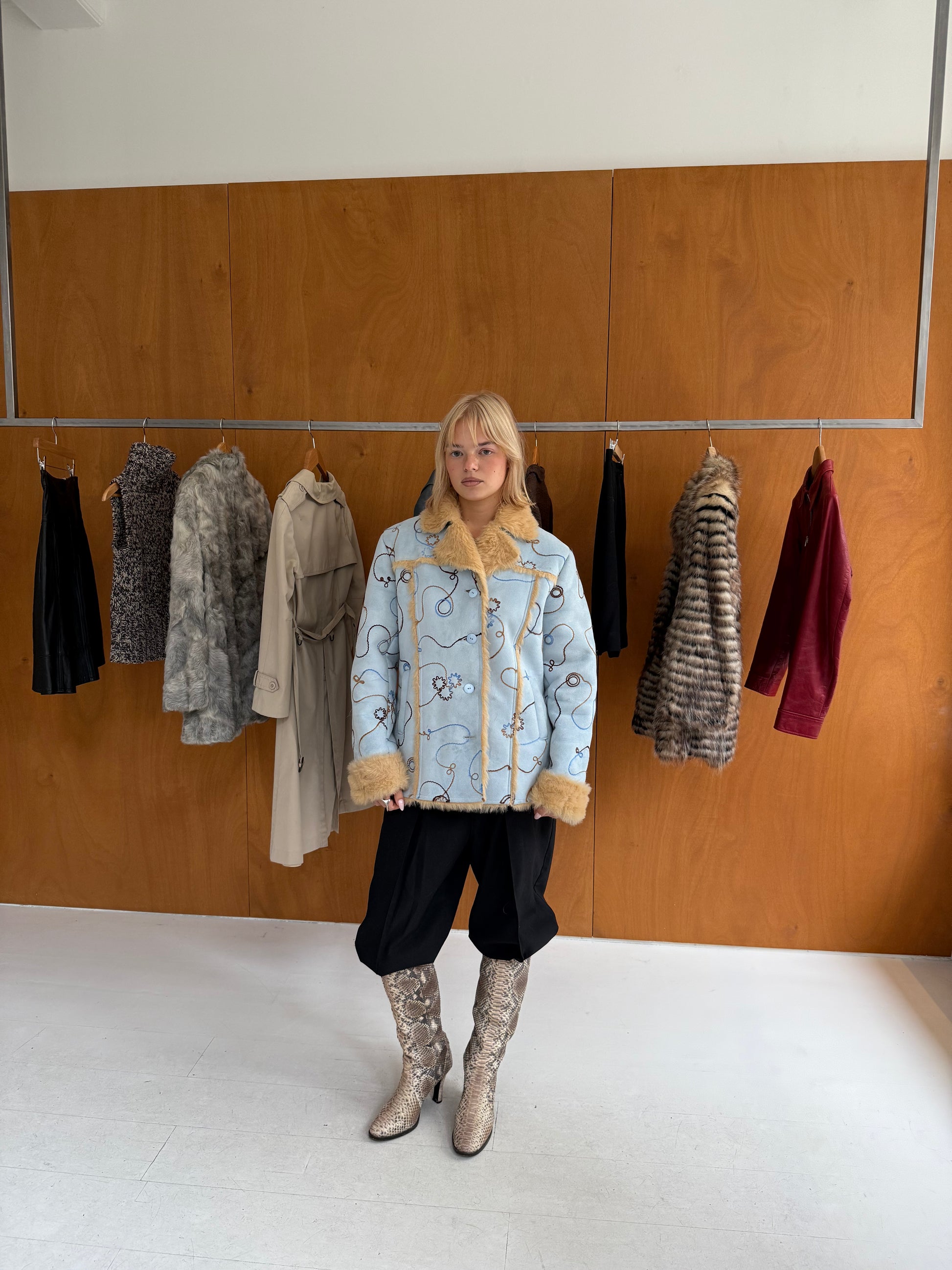 Print coat in light blue & brown. Fits sizes XS-M.