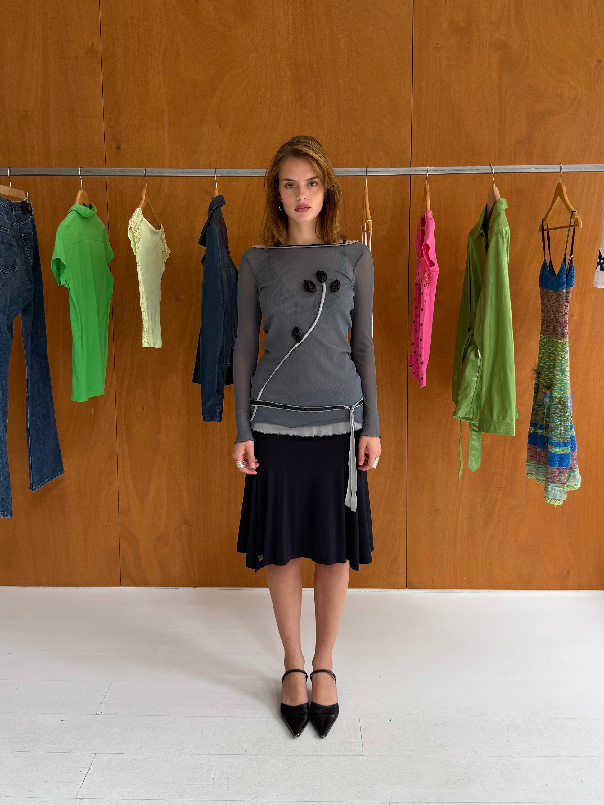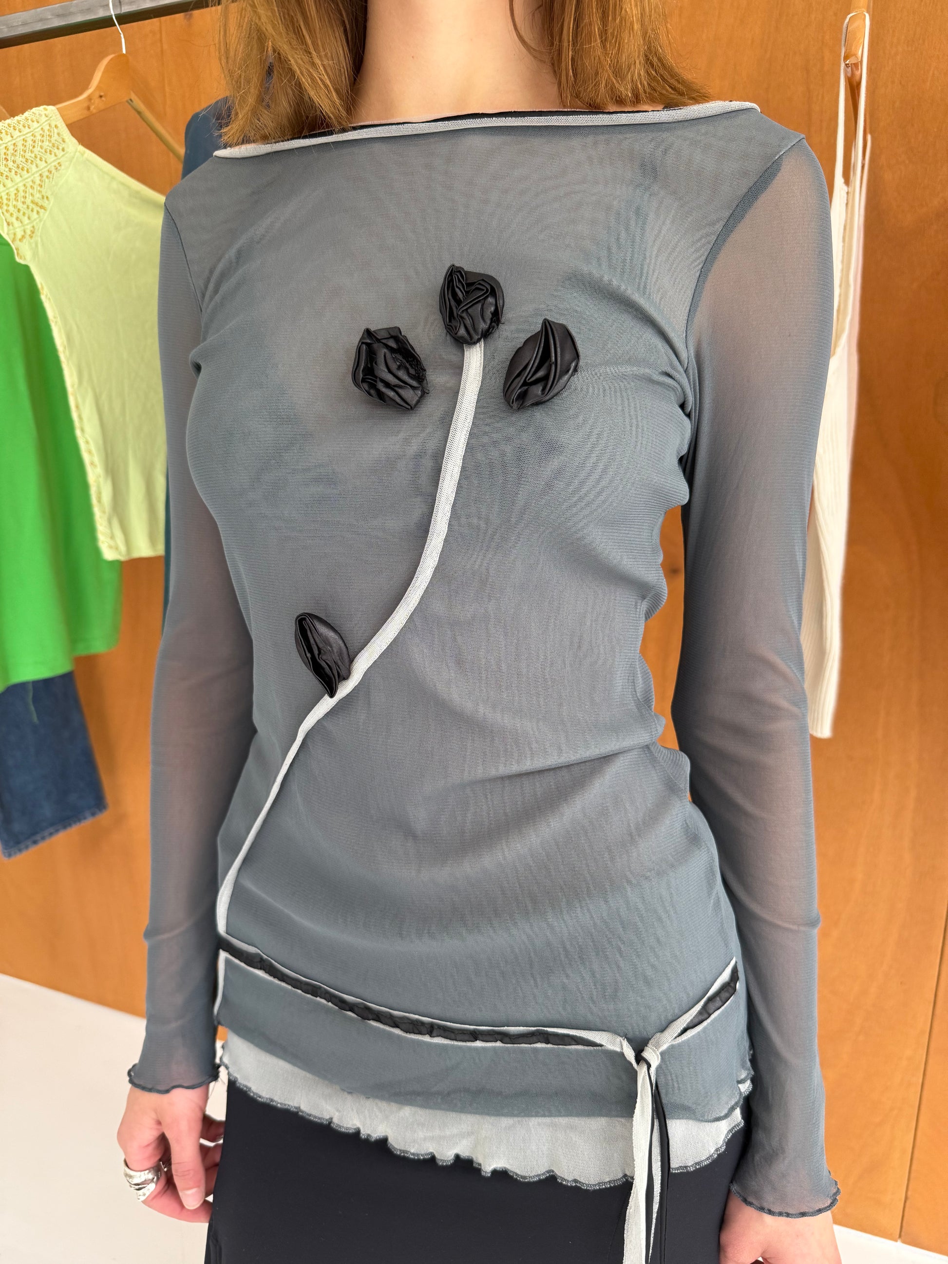 Sheer longsleeve top in grey with black flower details. Fits sizes XS-S.