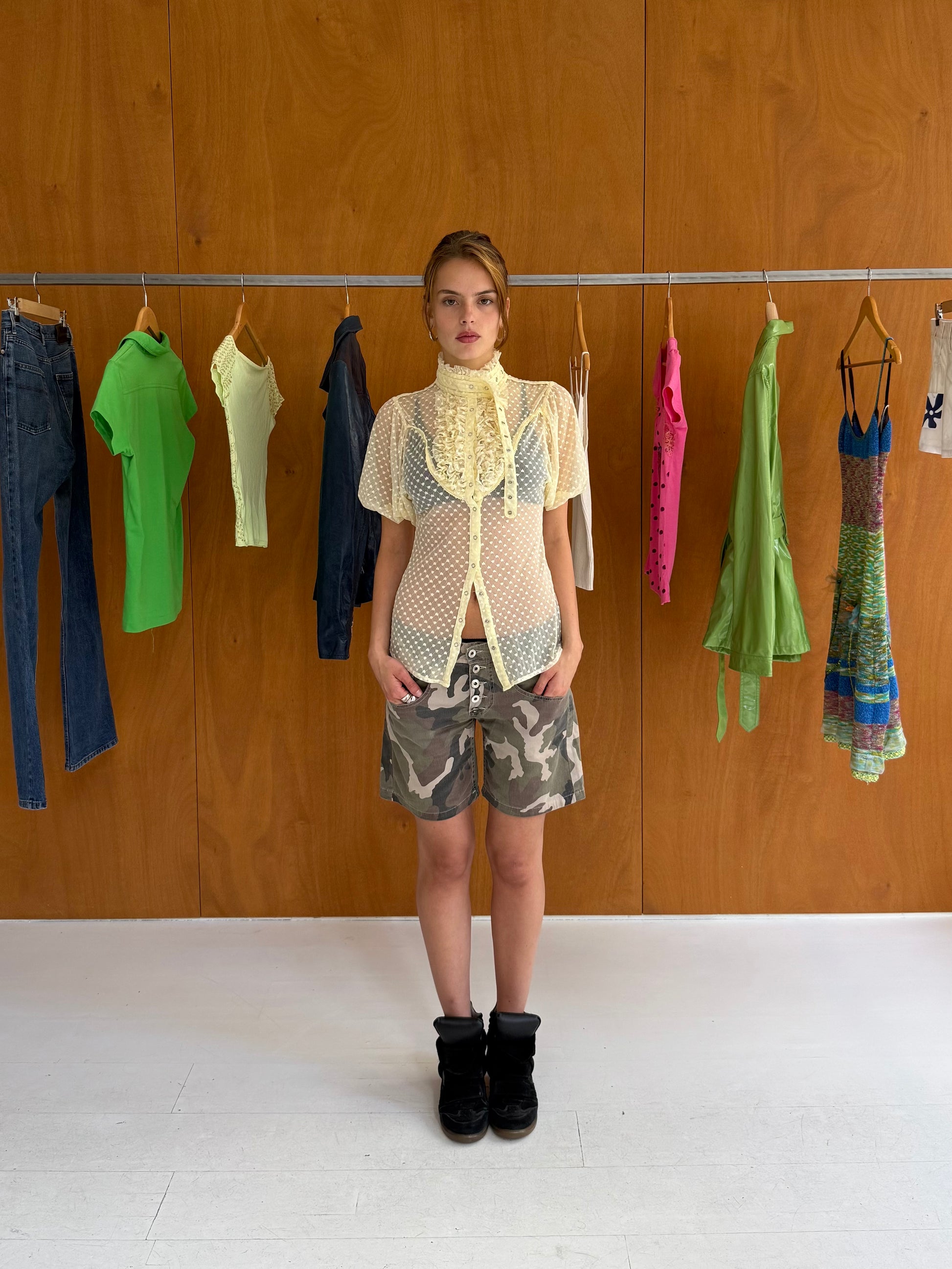 Sheer blouse with heart print in yellow. Fits sizes XS-M.