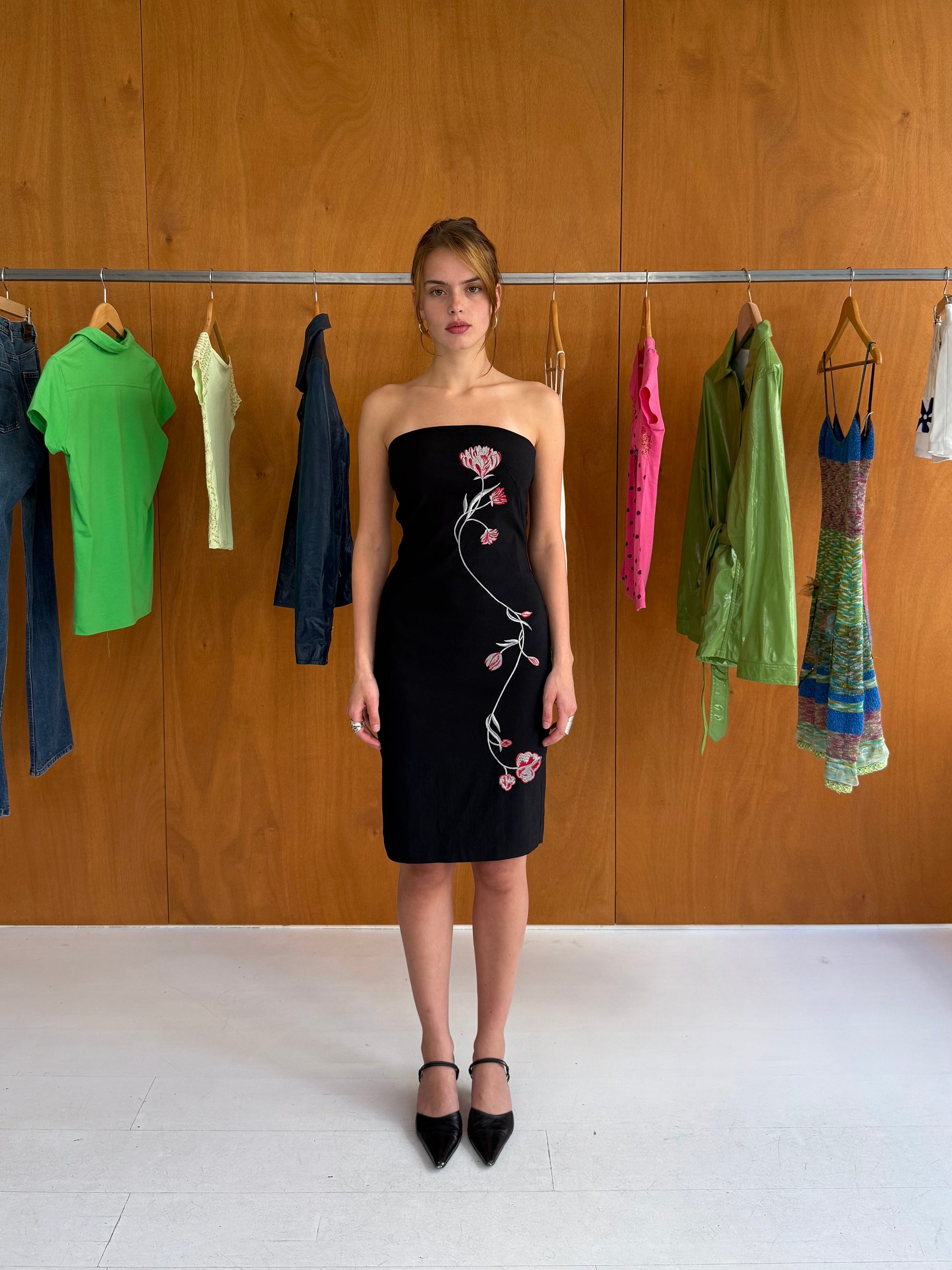 Black strapless dress with flower details. Fits size M. W 36cm L 85cm, has some stretch.