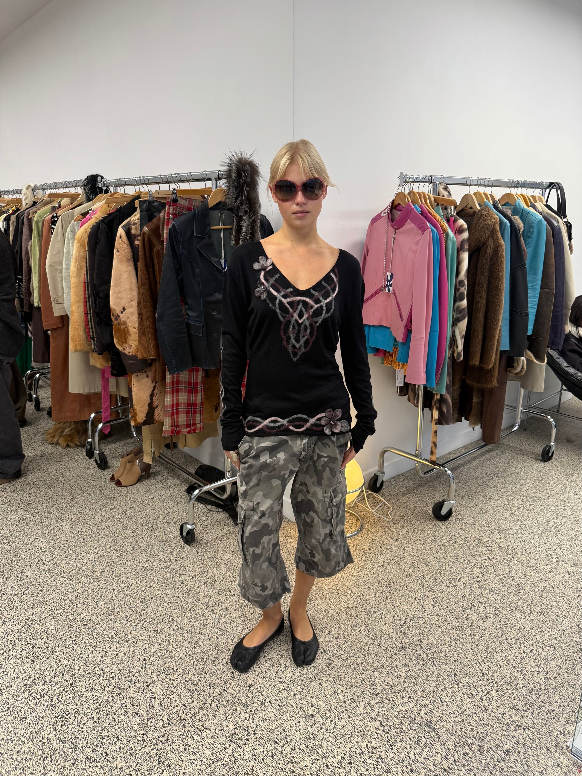 Black longsleeve top with wool flower print details. Fits sizes XS-M.